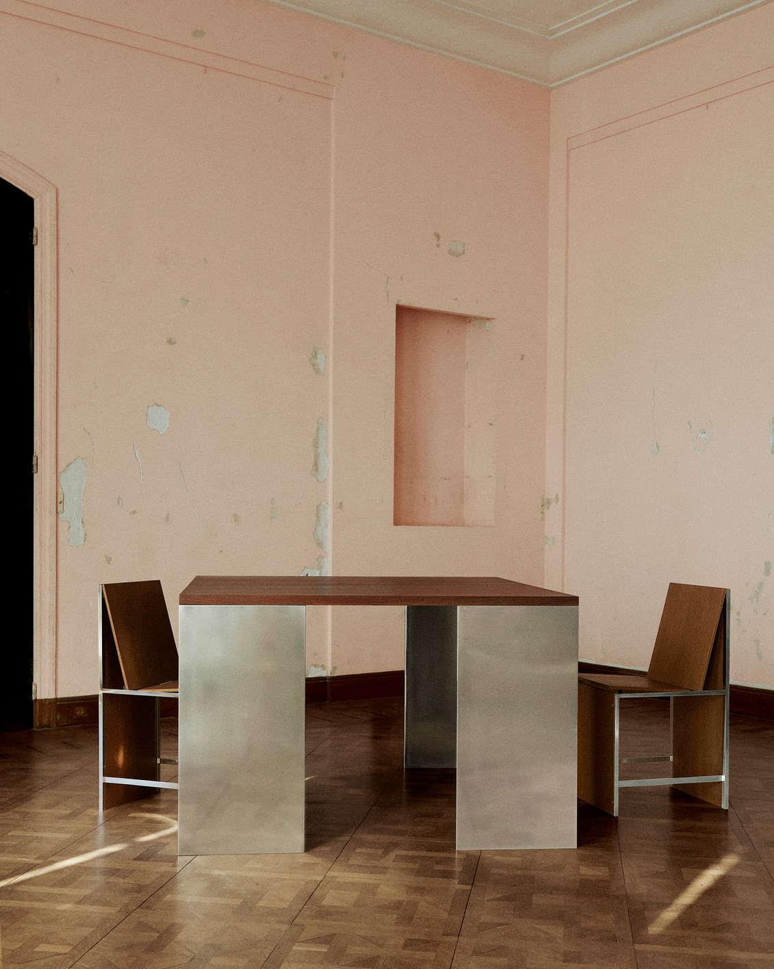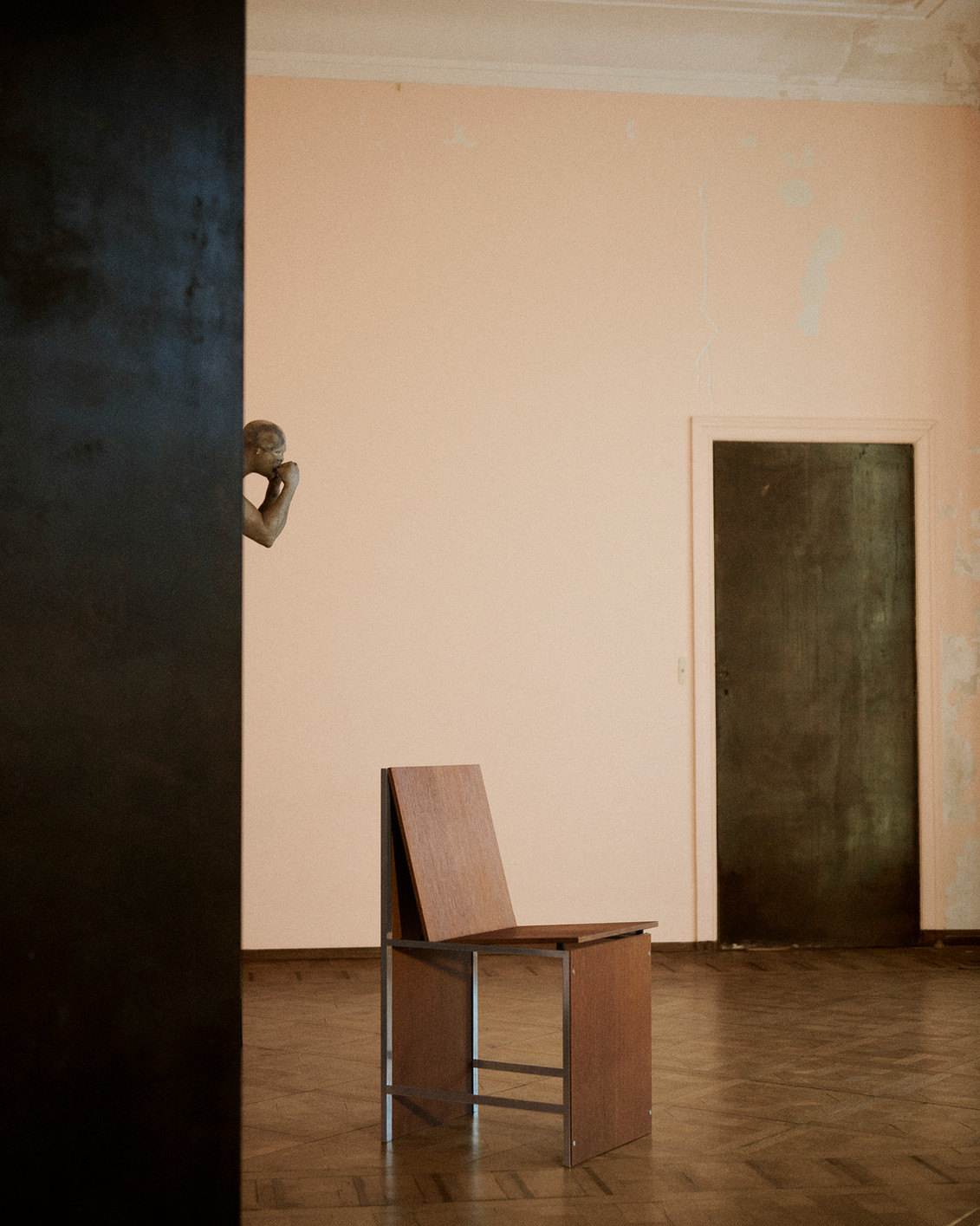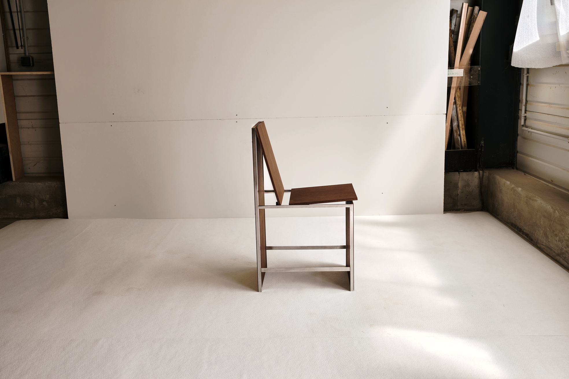 Chair in Oak Finish is a minimal chair designed by Lisbon based studio HAOS presented at Love House as part of the ‘Works of Sobriety’ exhibition. With its fourth collection, Studio HAOS expressed its belief in grounded elegance through eight simple forms meant to convey emotion in the most elemental way possible. Aimed at purifying filmmaking by refusing special effects and technical gimmicks, the Dogme 95 movement – started by Danish directors Lars von Trier and Thomas Vinterberg – served as an anchoring intention throughout the evolution of HAOS’ new series. Rejecting the “need” for expensive materials or rare expertise, the duo sought to elevate humble materials – such as plywood and sheet metal – in the construction of considered objects and structures.