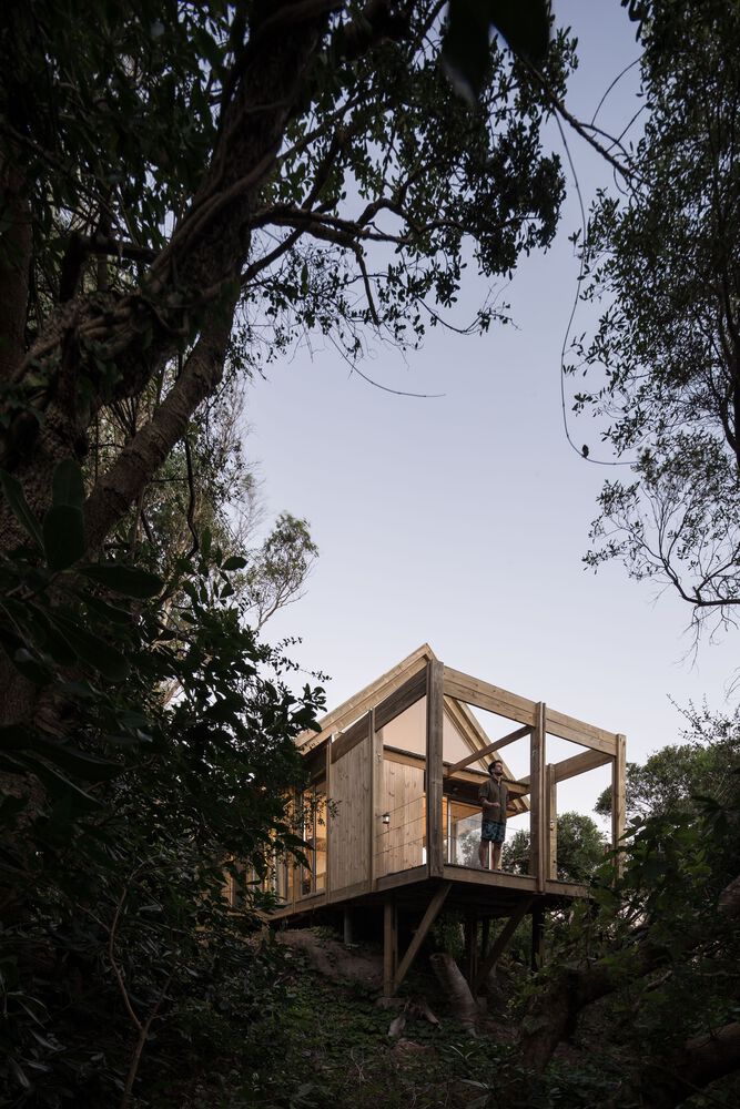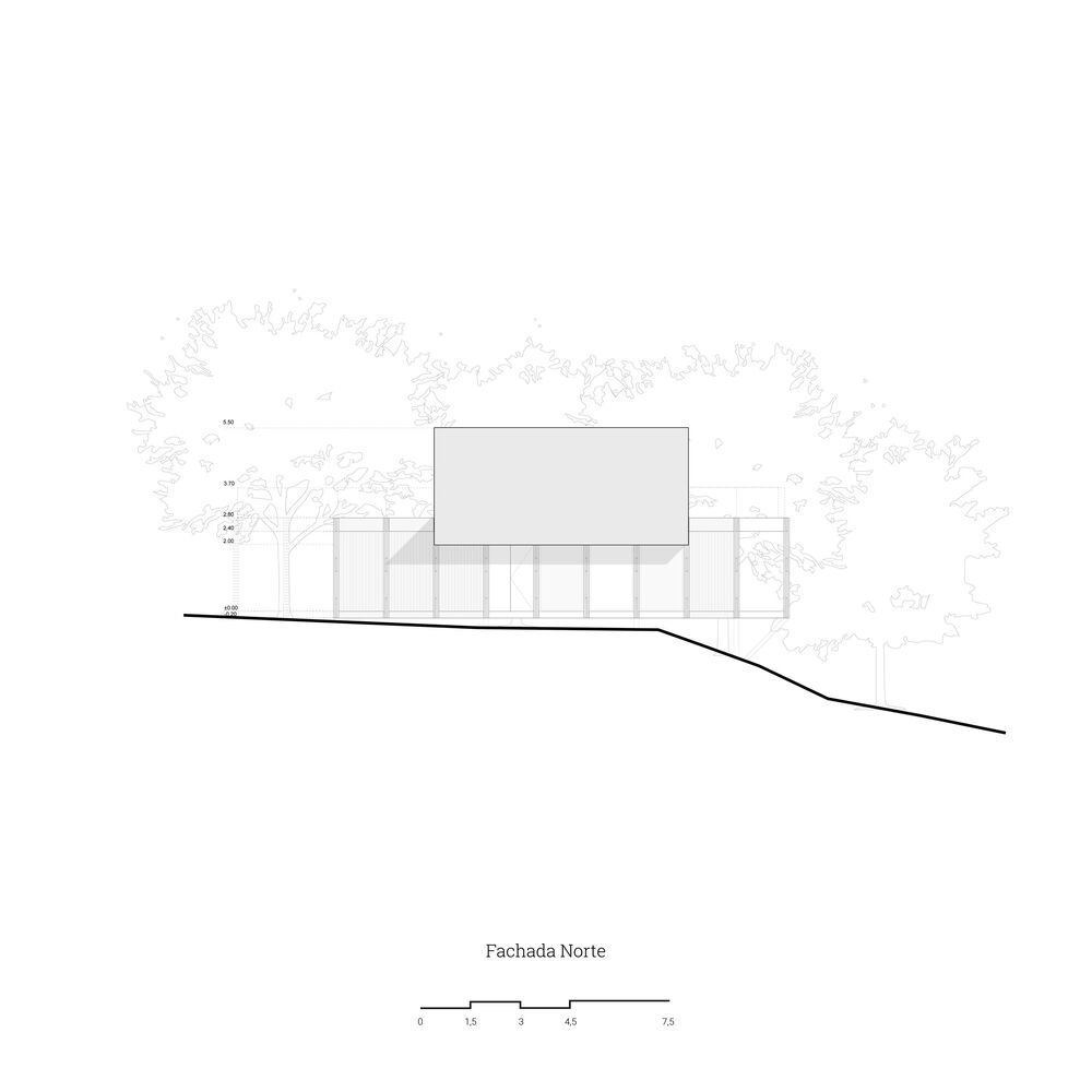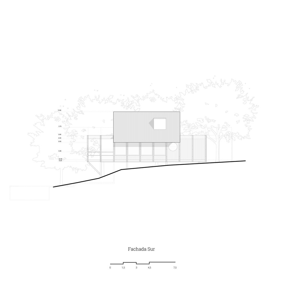 It was decided that the project would try to keep this ecosystem as intact as possible to reduce the green footprint. It is decided to opt for a stilt type foundation system made up of concrete piles that will be supported on the ground, leaving the entire construction suspended on the irregular surface of the ground.