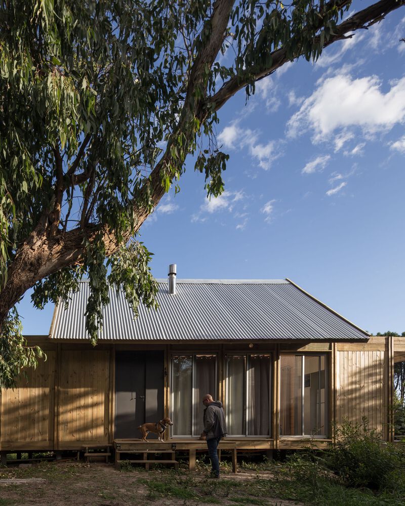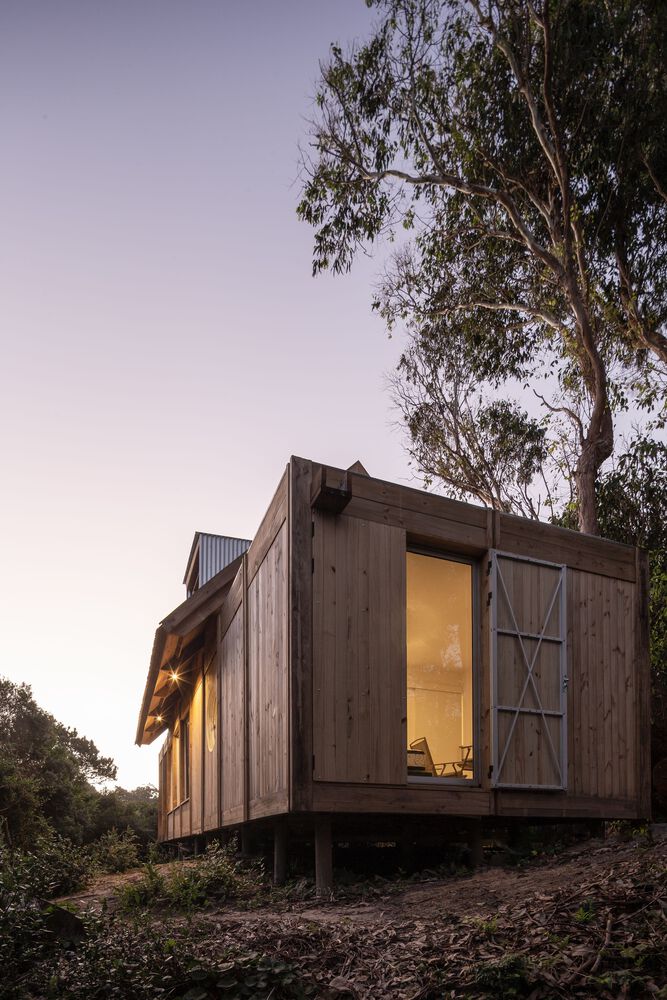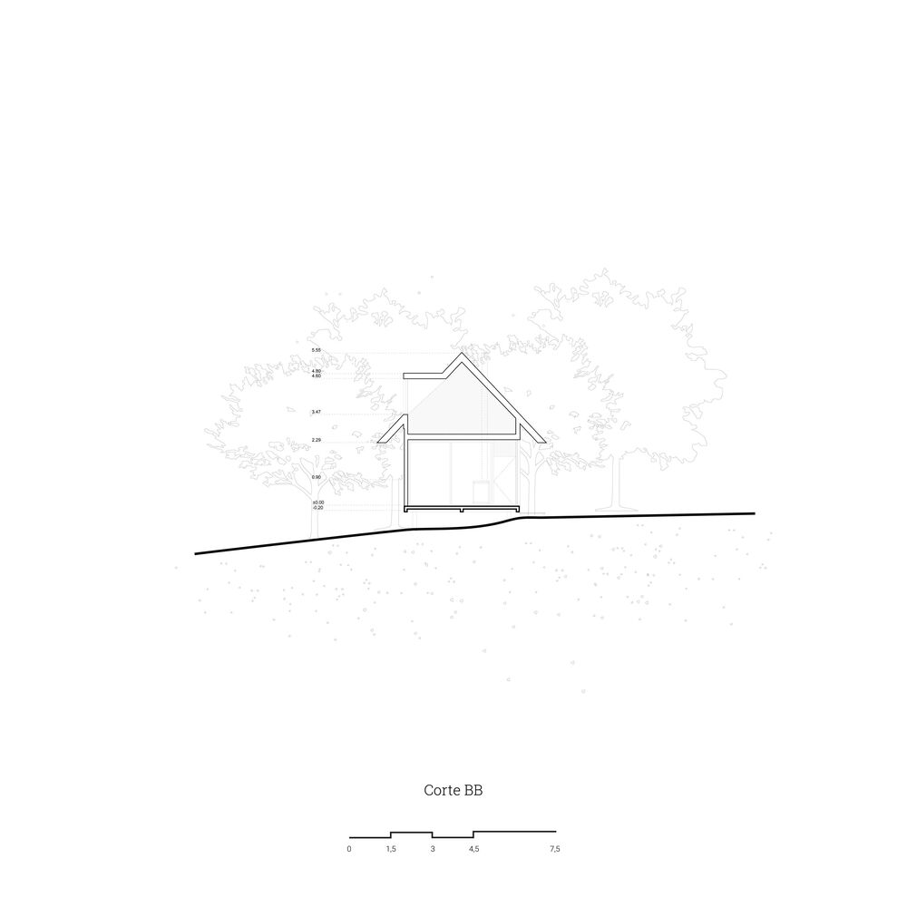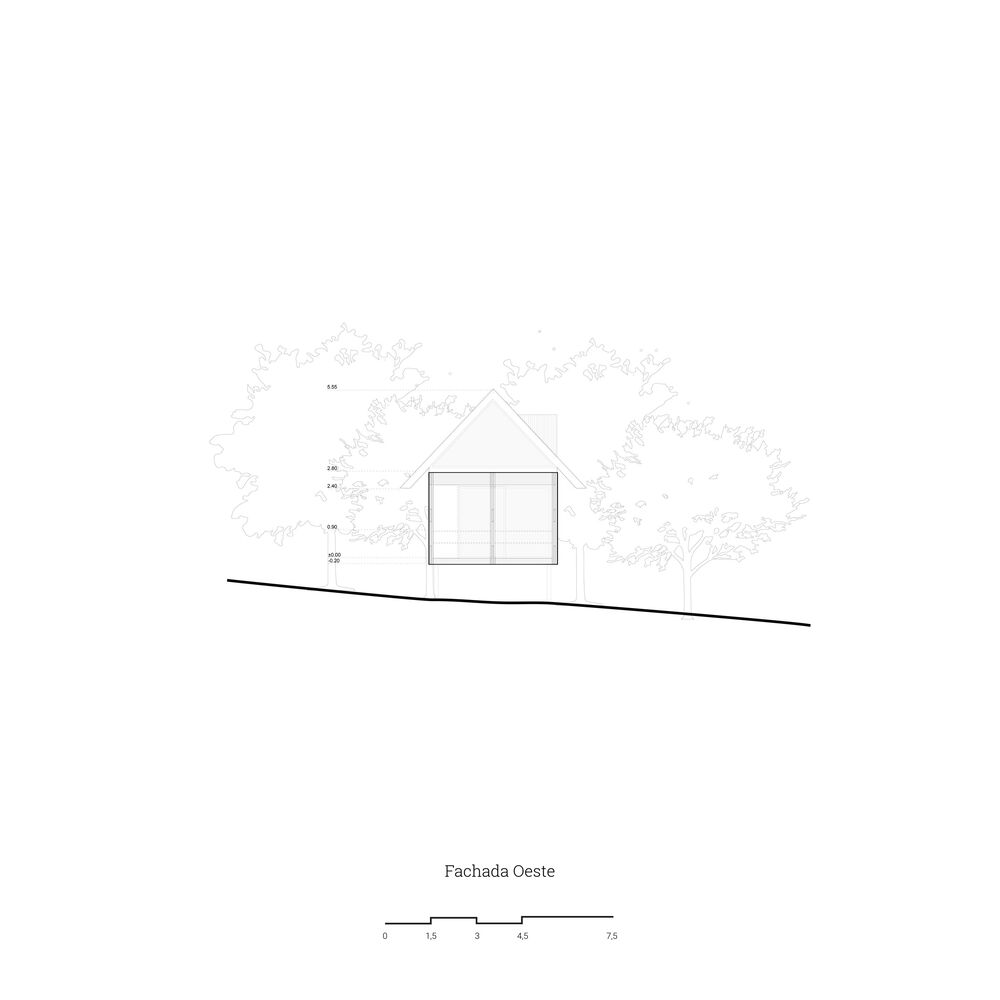 The shelter is assembled in a longitudinal position that divides the land into two different sides. The first one is pointed to the north, and it is organized in a logical way, as there is an interior exterior access link. The second one is south facing where there is a new contemplation logic to look at the landscape from a series of specific cut-outs in the shell and cover.