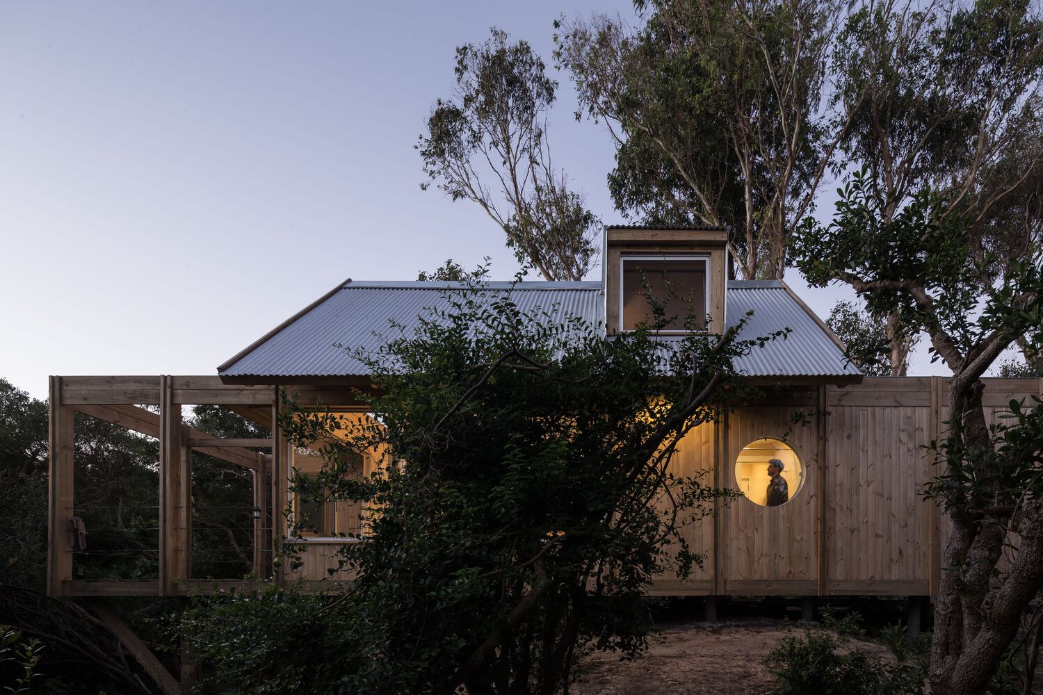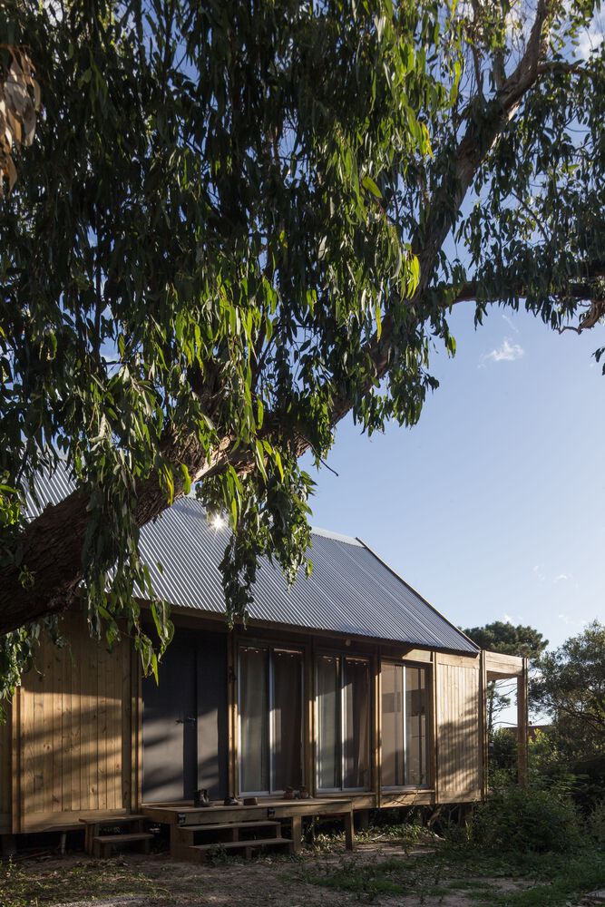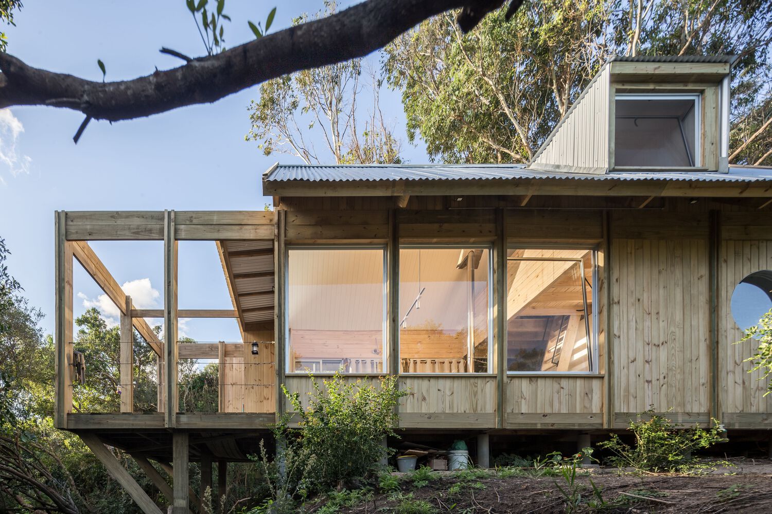 The shelter is assembled in a longitudinal position that divides the land into two different sides. The first one is pointed to the north, and it is organized in a logical way, as there is an interior exterior access link. The second one is south facing where there is a new contemplation logic to look at the landscape from a series of specific cut-outs in the shell and cover.