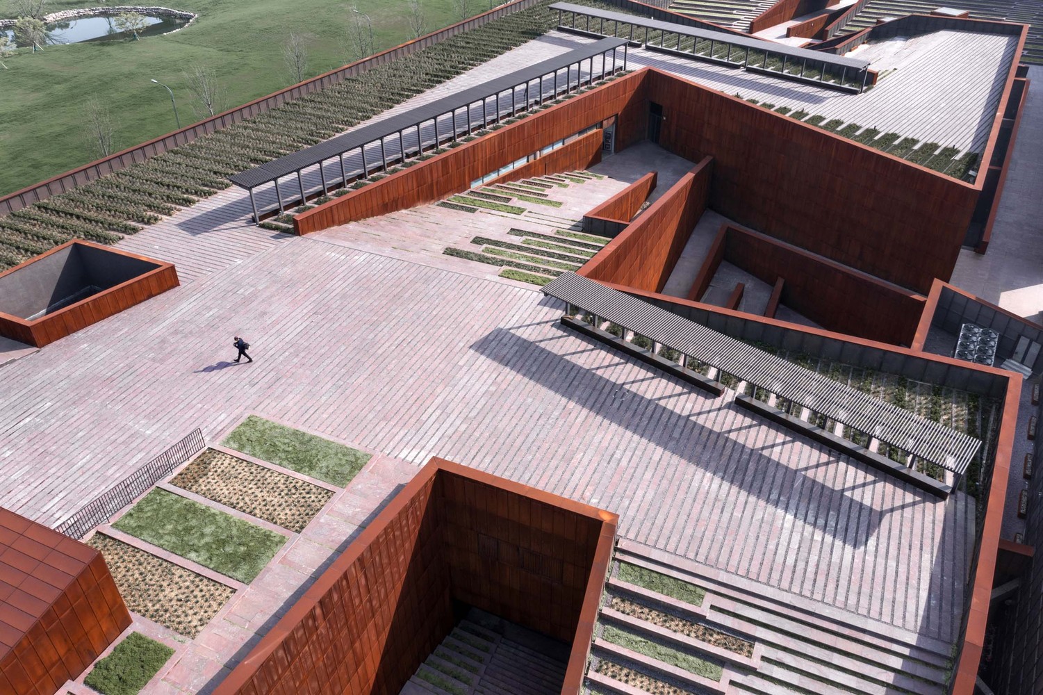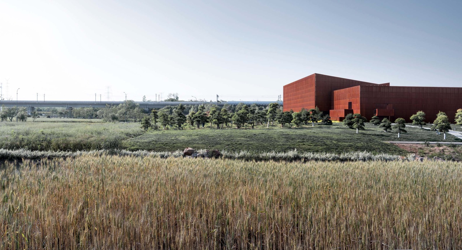 Jiangsu Garden Expo Treasure Pavilion is located on the far north of Jiangsu Garden Expo Park. Inside of it, the Pavilion displays both traditional handicrafts and folkarts to the public. The whole structure covers an area of 15,000 square meters with a total construction area of 15,500 square meters. Located at the edge of the Expo Park, the Treasure Pavilion is surrounded by a very conflictingenvironment:on its north side, the Beijing-Shanghai high-speed train constantly runs by ; on its south side, right across a river, there is the VOCO Nanjing Garden Expo, a quiet and pleasant small scale village-sense apartment hotel complex. The city and the village collide on this marginal plot.