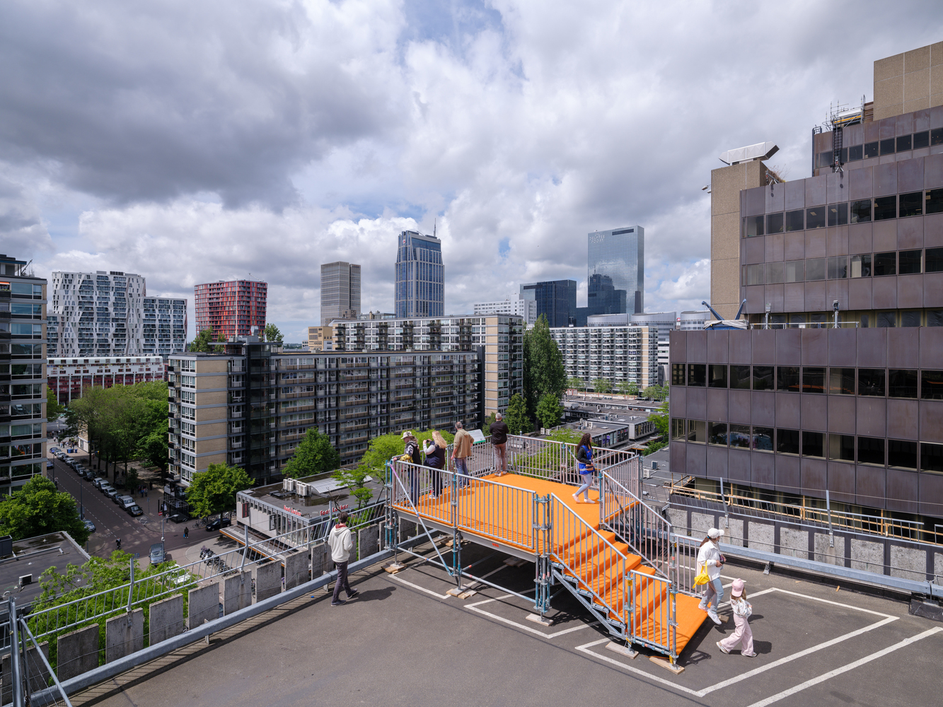 Towards the end of 2021, MVRDV revealed its design for the temporary intervention that takes tourists and city dwellers on a walk across several rooftops in Rotterdam, highlighting an untapped potential for expanding the public realm. The Rotterdam Rooftop Walk begins from the Koopgoot shopping street, from which staircases lead visitors up on a series of rooftop terraces. On these rooftops, NGO's and private companies are showcasing their innovations and projects related to greening, energy generation, and water storage. The path also provides access to the open patios on top of De Bijenkorf Department Store Complex designed by Marcel Breuer in 1957, from which staircases lead visitors back to ground level.