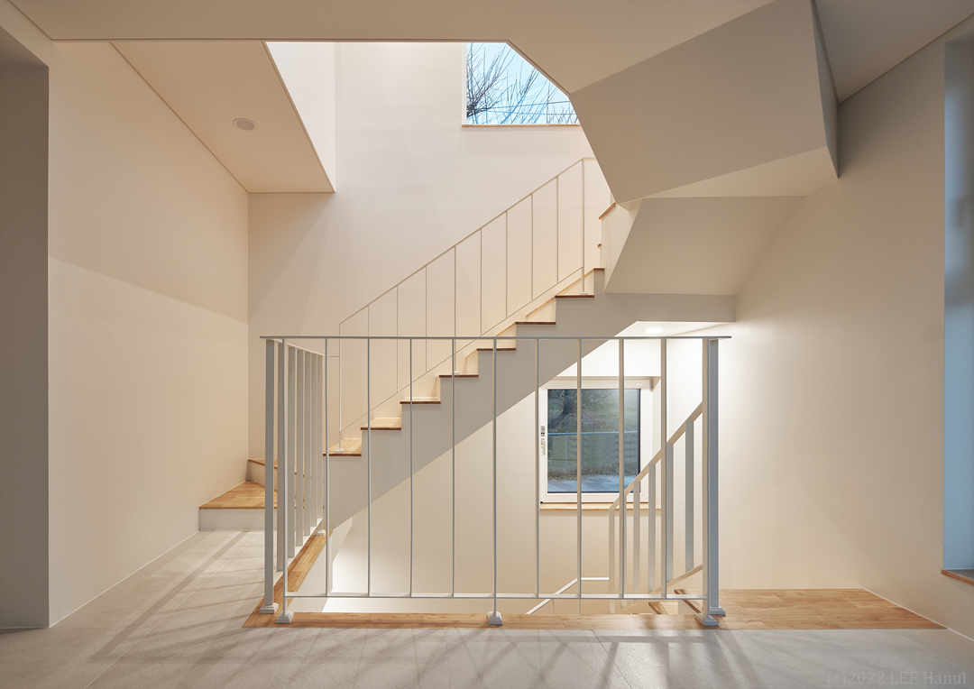 우리는 거주자 관계에 따라 공용공간과 사적공간을 분리하는 방식을 선택했습니다. 곧 성인이 될 자녀의 생활을 보장해 주고, 부모의 생활을 보장해주는 방식으로 각각의 침실을 2층과 3층으로 분리 한후, 그 중간지대; 3층에 소거실을 배치합니다. 사적공간과 공용공간은 퐁당퐁당 짝을 맞추며 각층에 자리를 잡습니다.