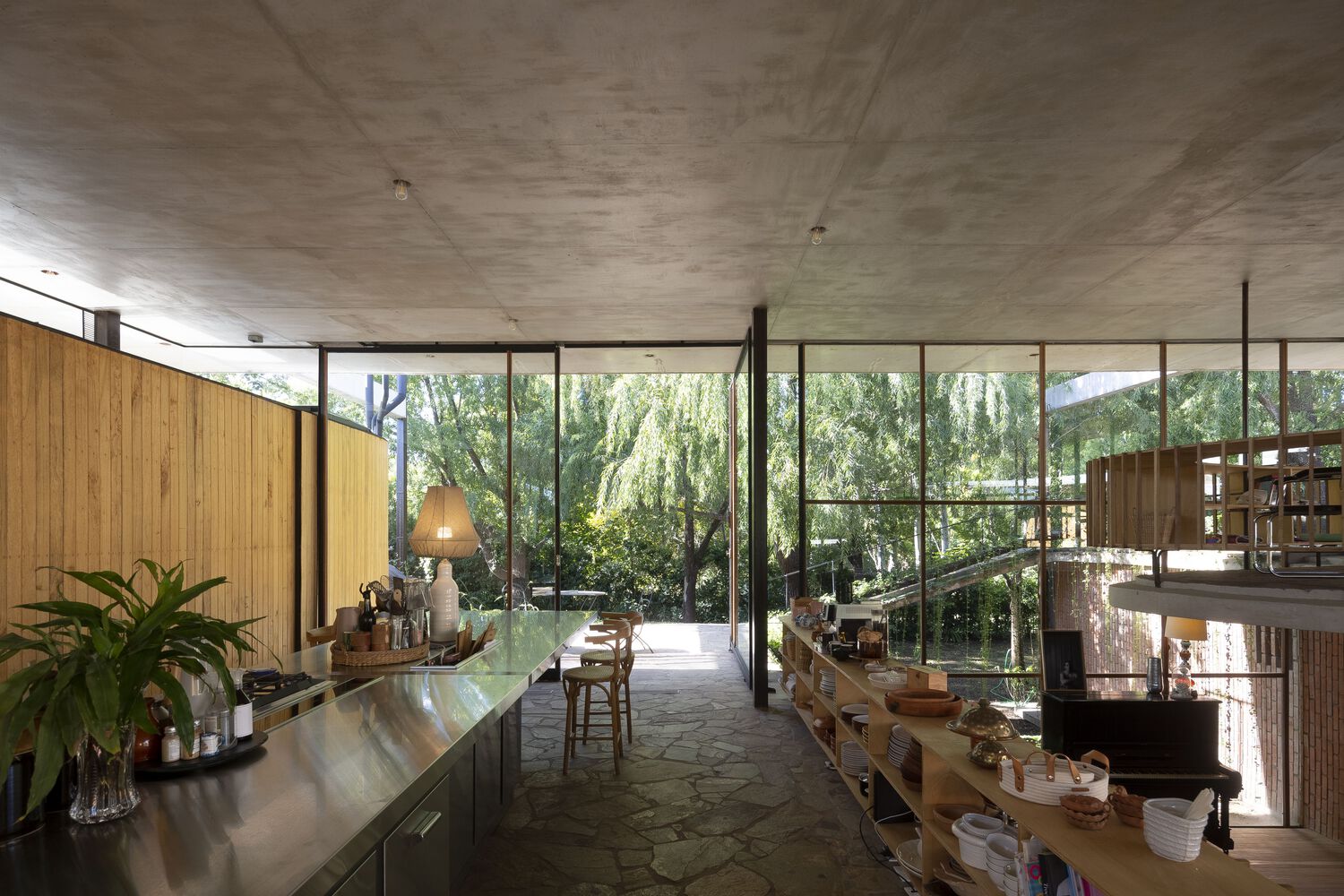 The land has 2,500 m and is located in a private condominium on the outskirts of Buenos Aires. The site where aged trees predominate was respected in its entirety for the location of the house.