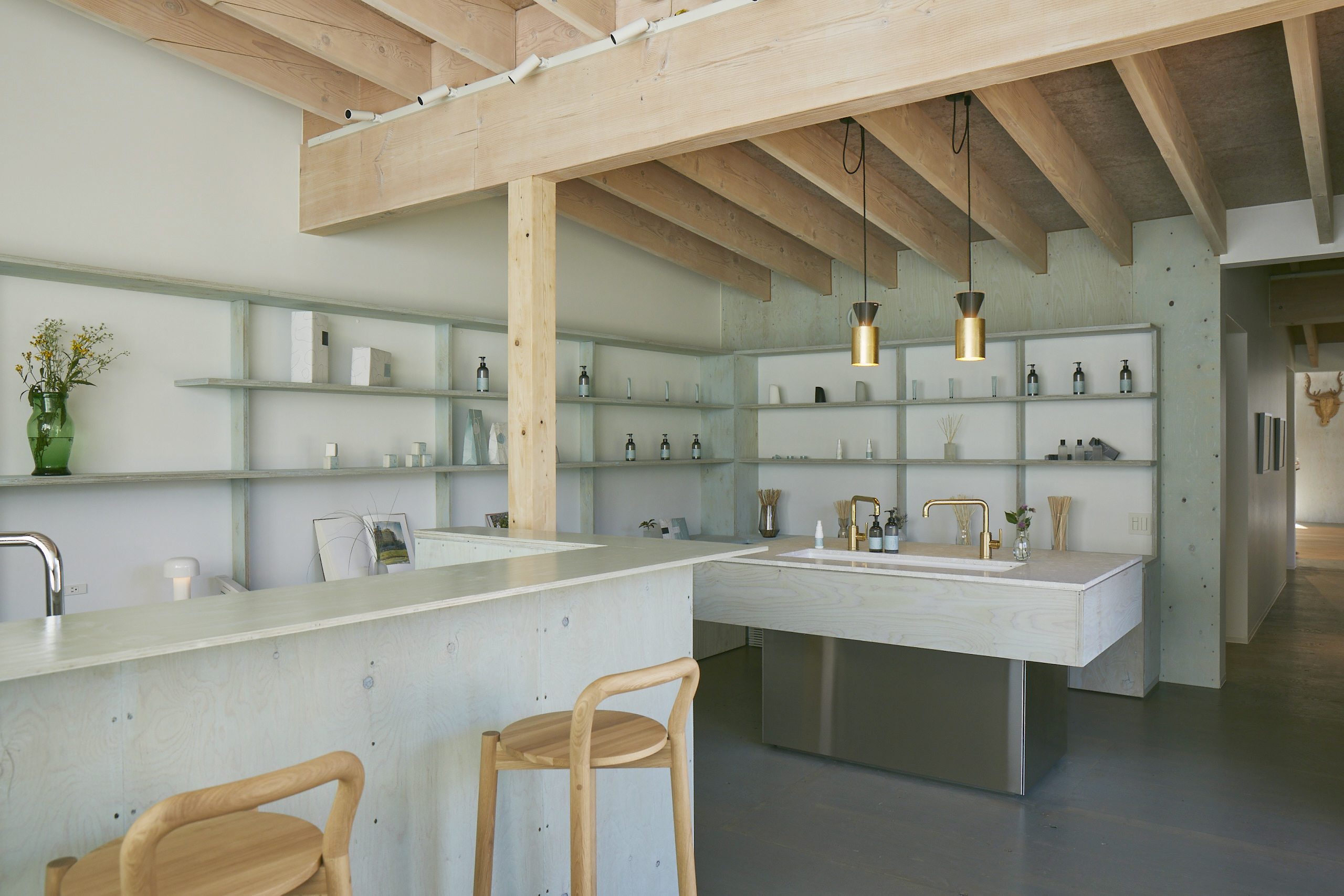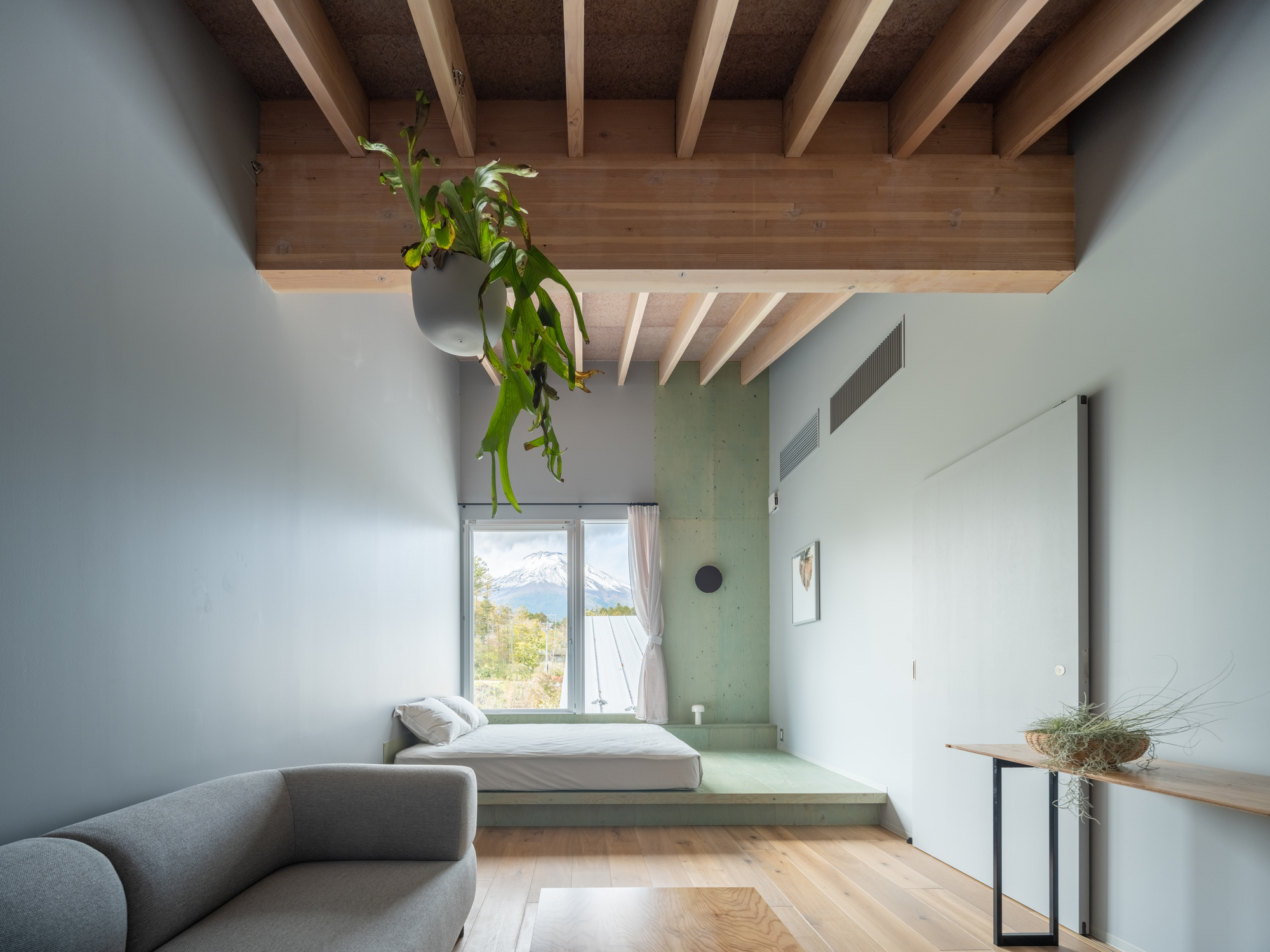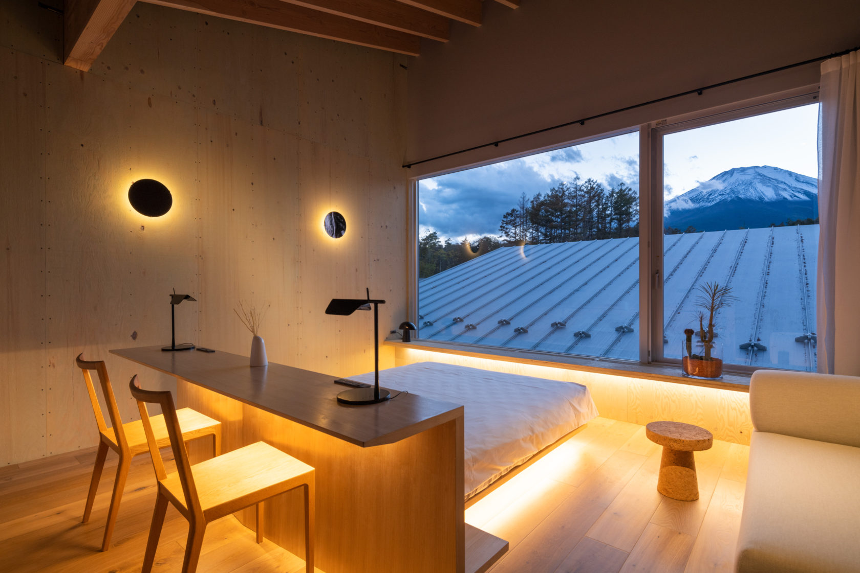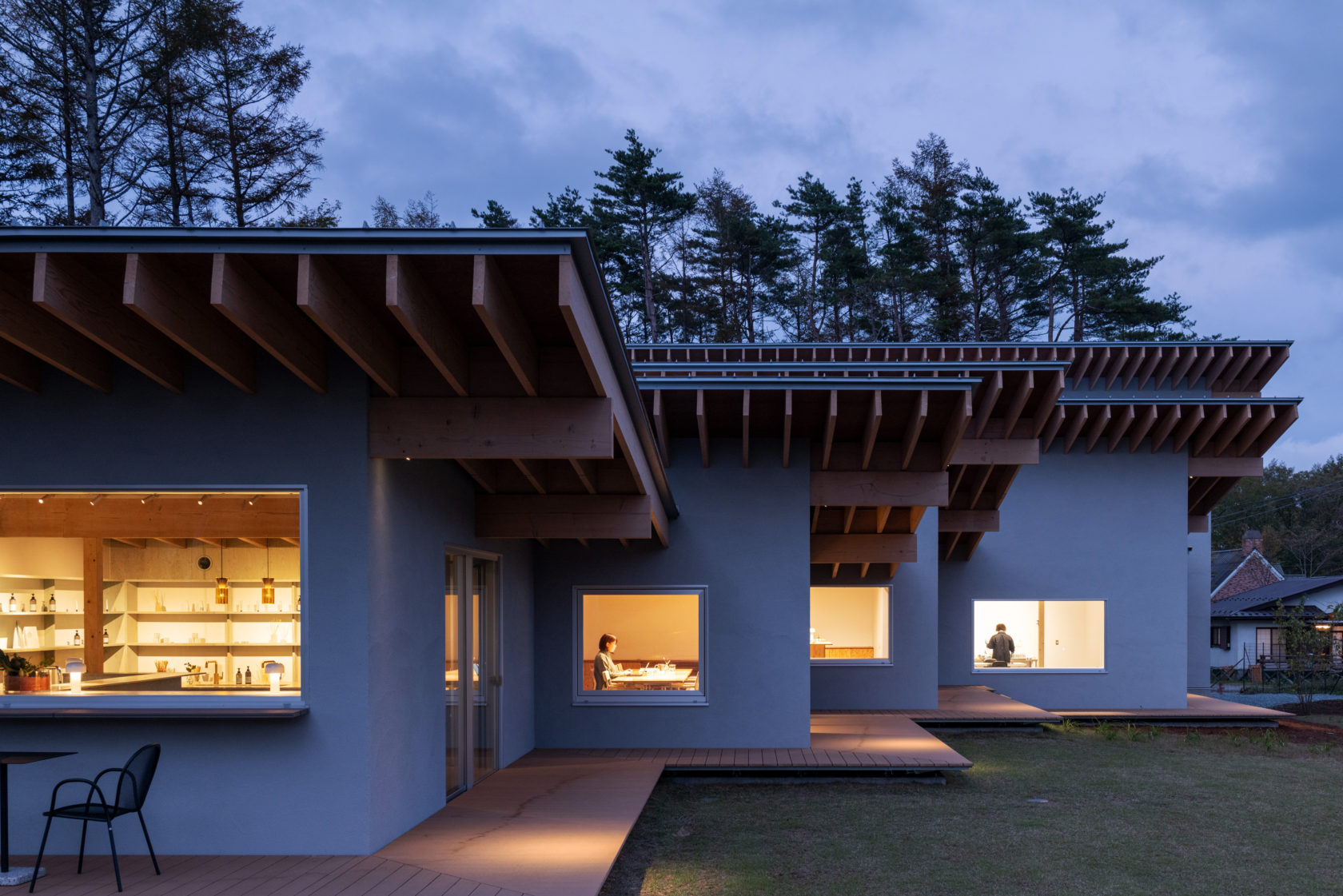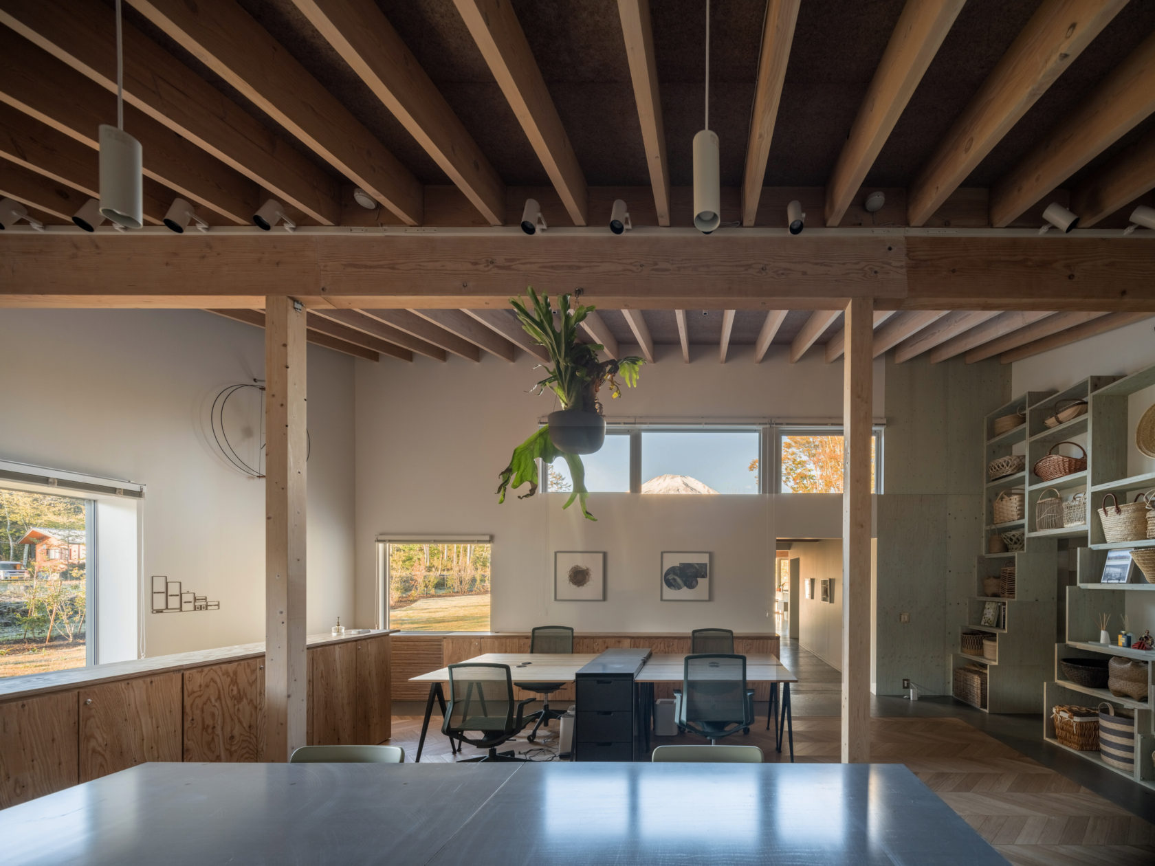 Atelier in Lake Yamanaka is a minimal architecture project located in Yamanashi, Japan, designed by ALA. The site has a fine view to Mt. Fuji and the client required a café, shop and guest rooms along with full factory functionality and a garden overlooking the mountain view. The company creates daily fragrance products with the concept of naturally, friendly ingredients integrated into human life and as such hoped to create a building as a symbol to which would attract people of the same mindset. The architects translated the required functions into five different volumes to avoid the typical feeling of a big factory space, while shifting both in plan and scale. The shifted composition allows the mountain views from all rooms so that they could put glazings within gaps between the volumes. The windows are in random proportions according to room function and show different framed mountain views. A garden for playground, for growing herbs is connected to the buildings by zigzag terrace.