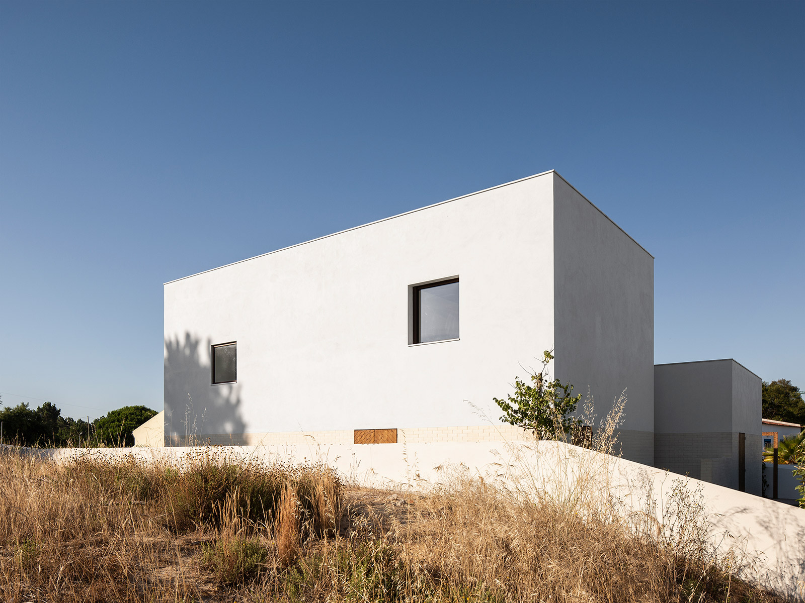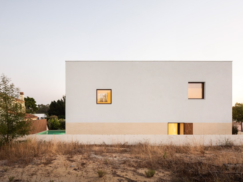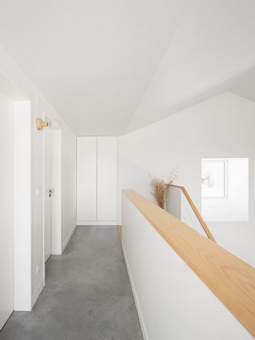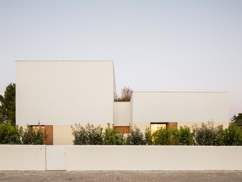 In the exterior, we tried to develop a markedly contemporary language with pure and simple forms, exploring the relationship between two rectangular volumes with distinct shapes. However, these modern volumes conceal an interior that exploits a spatiality that takes advantage of the two story roofs so characteristic of traditional country houses. However, despite a modern but elegant language, we have provided the exterior with materials that also explore the more artisan side of the country houses through the use of wood in the doorways and window frames, as well as the white ceramic brick. There is a compromise between traditional and popular architecture and the current architecture paradigm.
