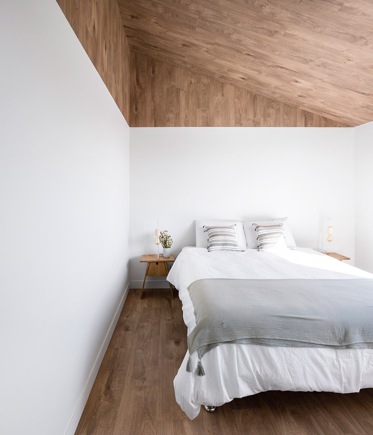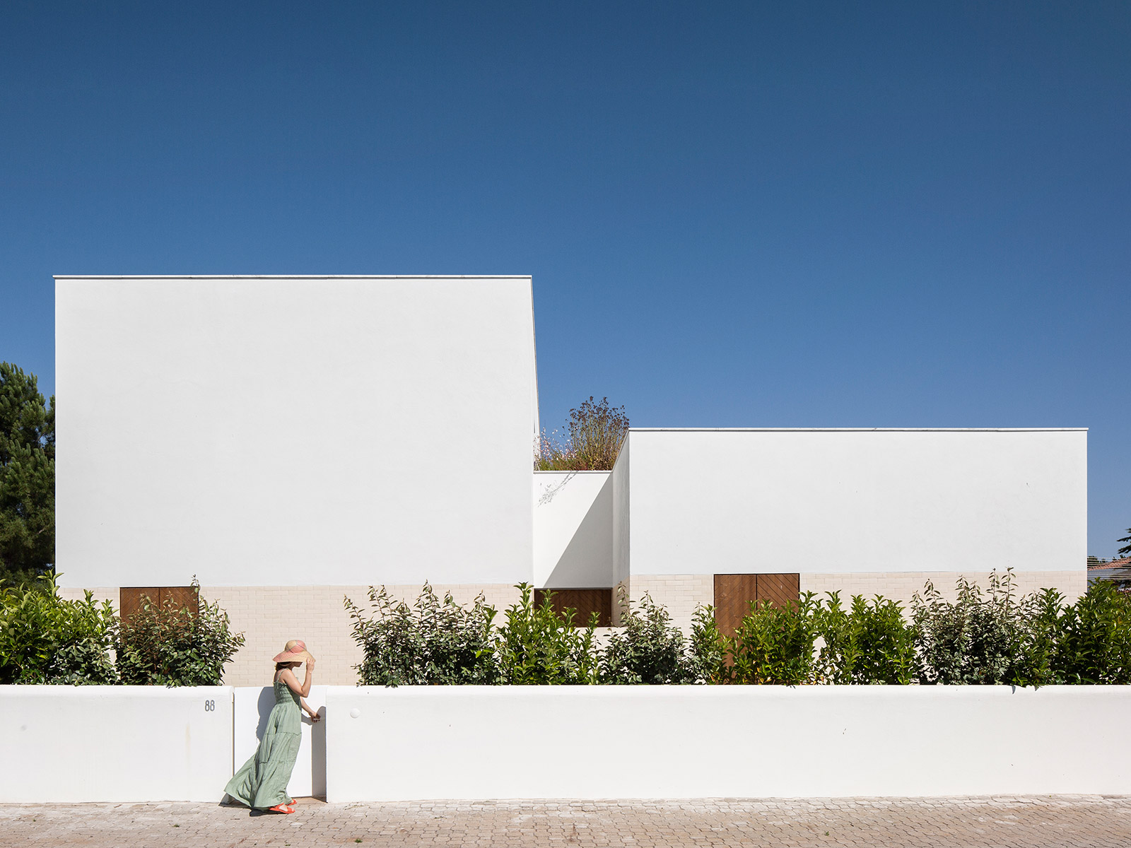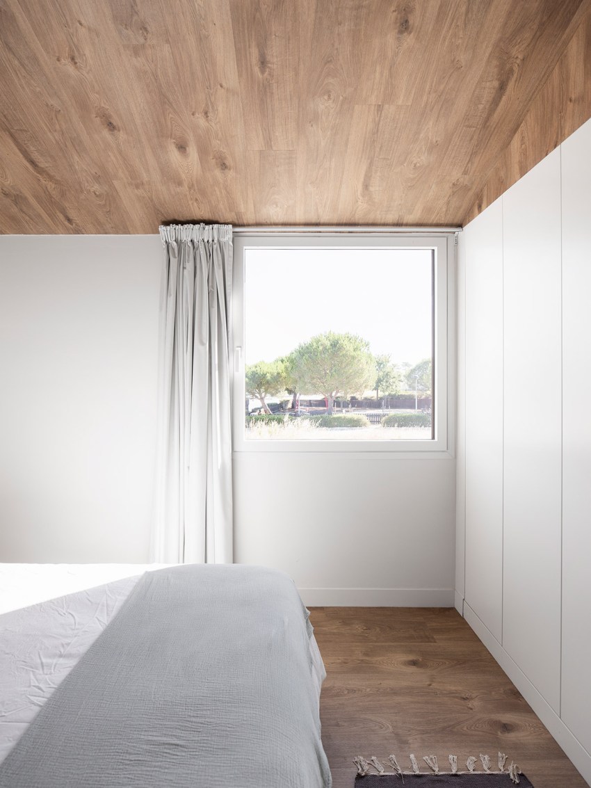 In the exterior, we tried to develop a markedly contemporary language with pure and simple forms, exploring the relationship between two rectangular volumes with distinct shapes. However, these modern volumes conceal an interior that exploits a spatiality that takes advantage of the two story roofs so characteristic of traditional country houses. However, despite a modern but elegant language, we have provided the exterior with materials that also explore the more artisan side of the country houses through the use of wood in the doorways and window frames, as well as the white ceramic brick. There is a compromise between traditional and popular architecture and the current architecture paradigm.