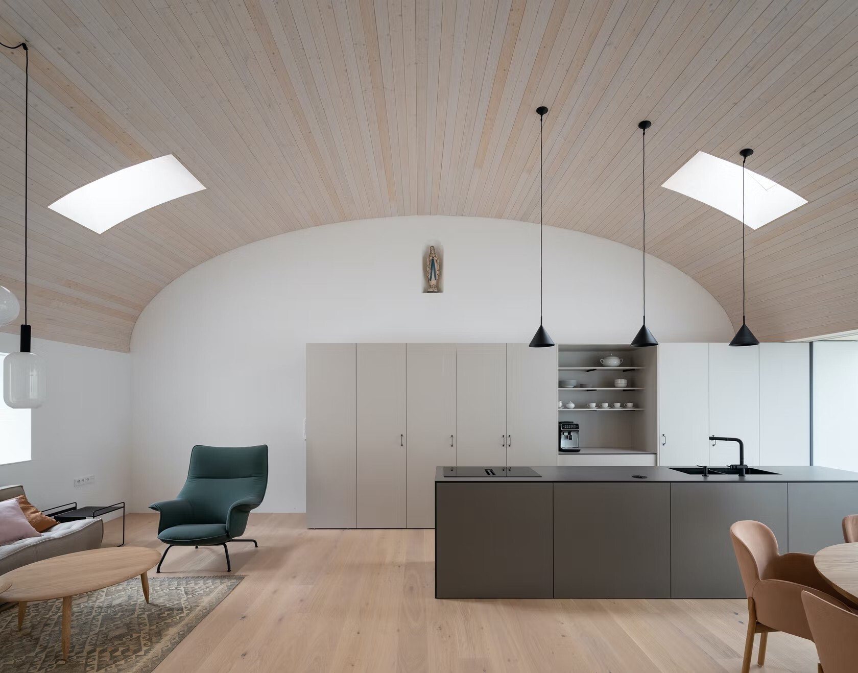 Dům na Kozině is a minimal home located in Trhové Sviny, Czechia, designed by ATELIER 111 architekti. The new home was created in a historical part of a small South Bohemian town, which, although neglected, possesses a rather strong atmosphere and potential. The place attracted the architects from the beginning for its distinctive character and great location. In the narrow sleepy streets, next to the grassy patch of the Kozina Square, they are hidden from the hustle and bustle of the surrounding traffic, while only a few steps separate us from the town center with shops, services and offices, schools, cinema, theater and railway station. On a significantly smaller area, the architects implemented a building program which includes a sufficiently large living room with an adjoining outdoor terrace, an attic with children’s rooms and a playroom, a bedroom with its own bathroom, a garden with fruit trees, two garage spaces and a large workshop with a car lift.