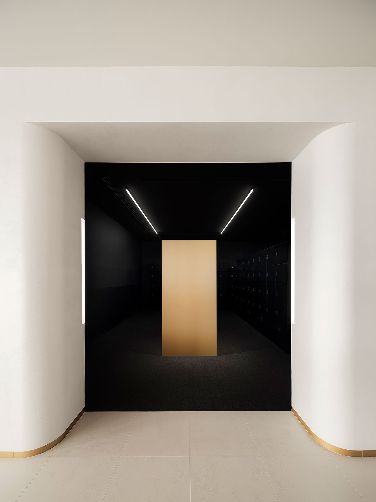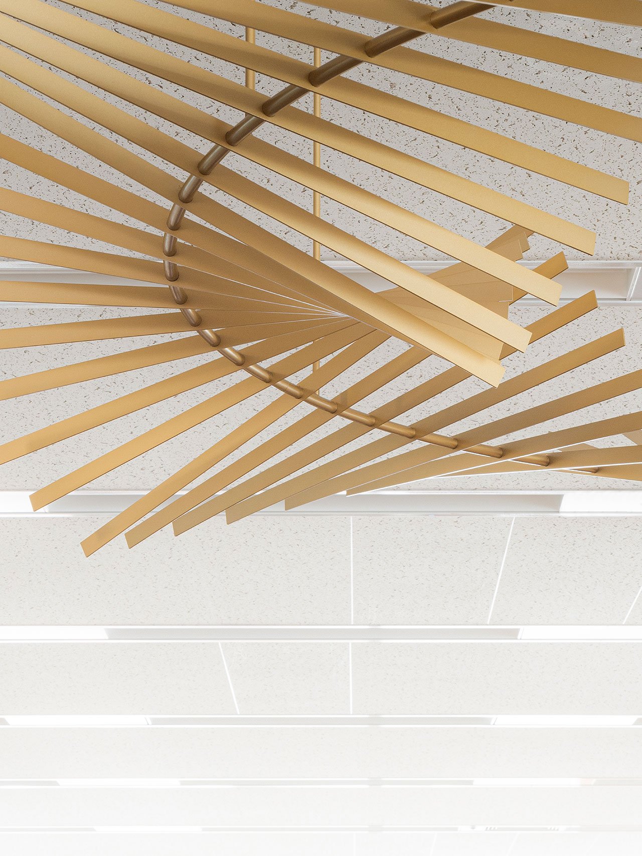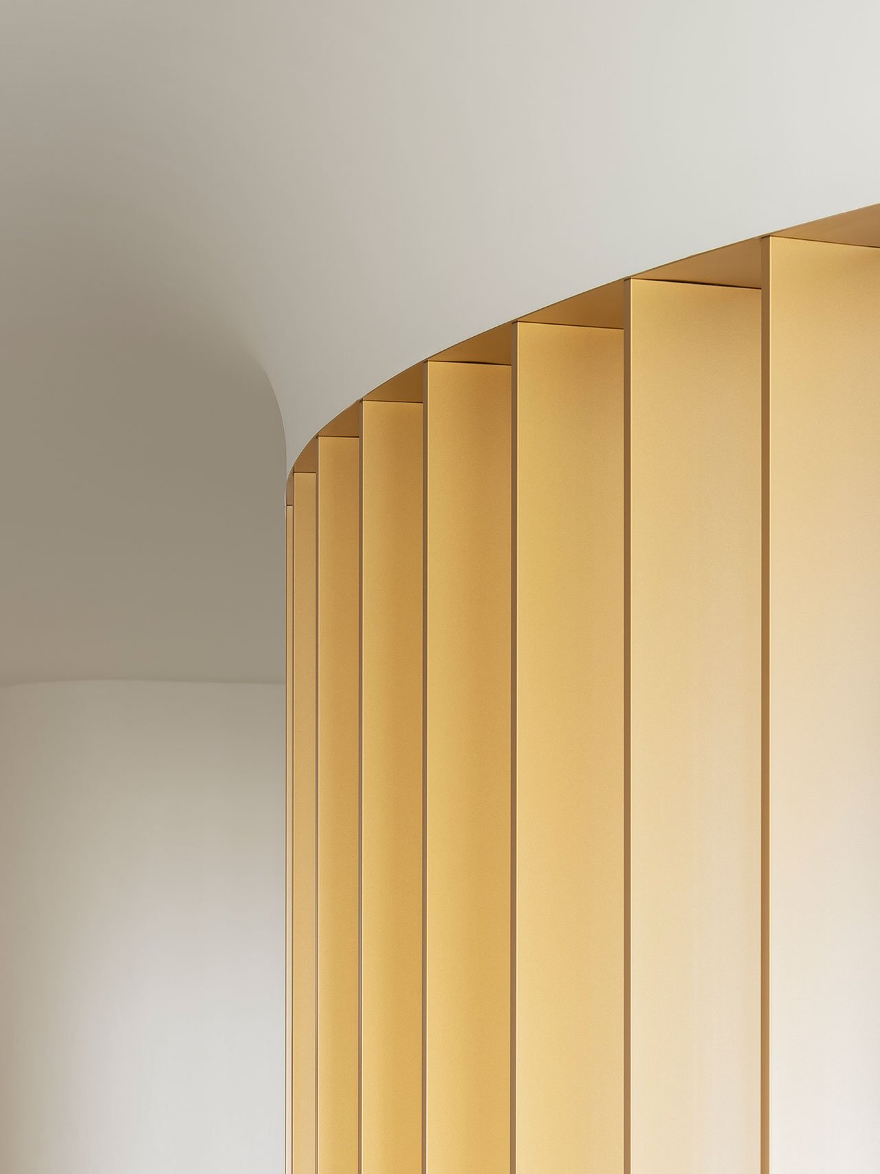 A gold leaf artwork by the entrance echoes the lounge’s round shape and further underlines the sense of luxury and craftsmanship, as does a custom chandelier in the main work area. Made of wave forming gold louvres, the chandelier crowns a circular communal desk featuring matching gold strips that demarcate individual workstations, and a central planter that adds a dash of greenery.