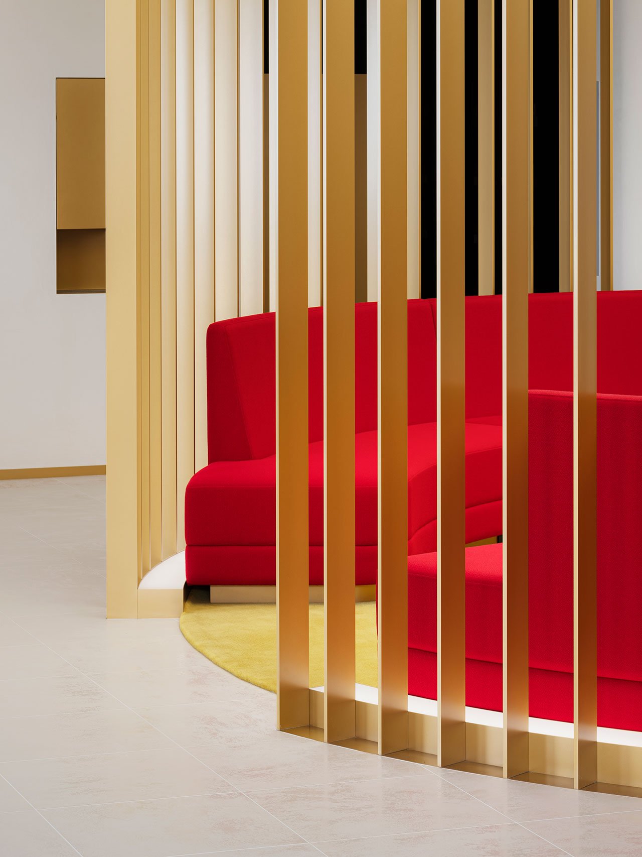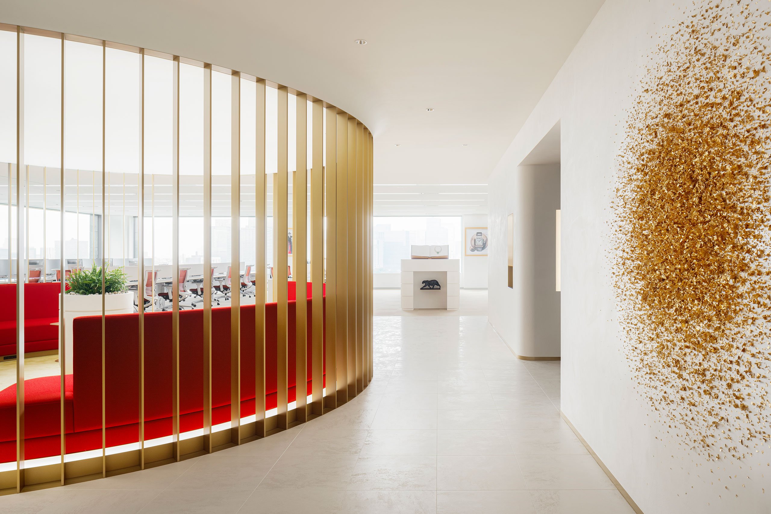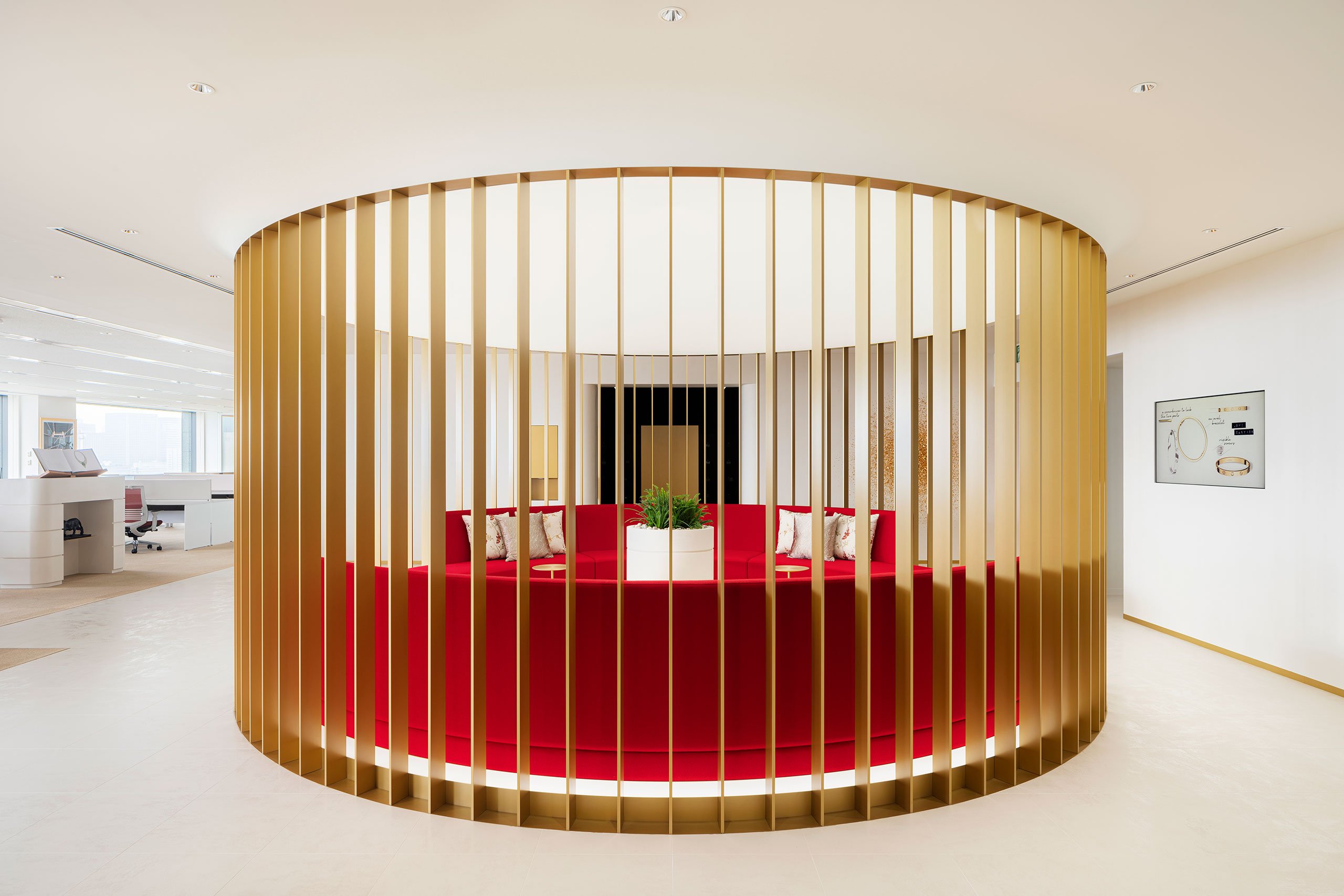 럭셔리와 우아함. 프랑스 쥬얼리 브랜드 까르띠에를 부르는 말이다. 이번 도쿄 오피스는 브랜드를 상징하는 고급스러움과 우아함을 인테리어 디자인 요소로 적용, 우아한 미니멀 공간을 완성한다. 포인트 컬러로 적용된 골드와 레드는 원형 쇼파를 감싸는 핀루버로 확장되는 동시에 레드 쇼파와 다다미룸으로 표현된다.