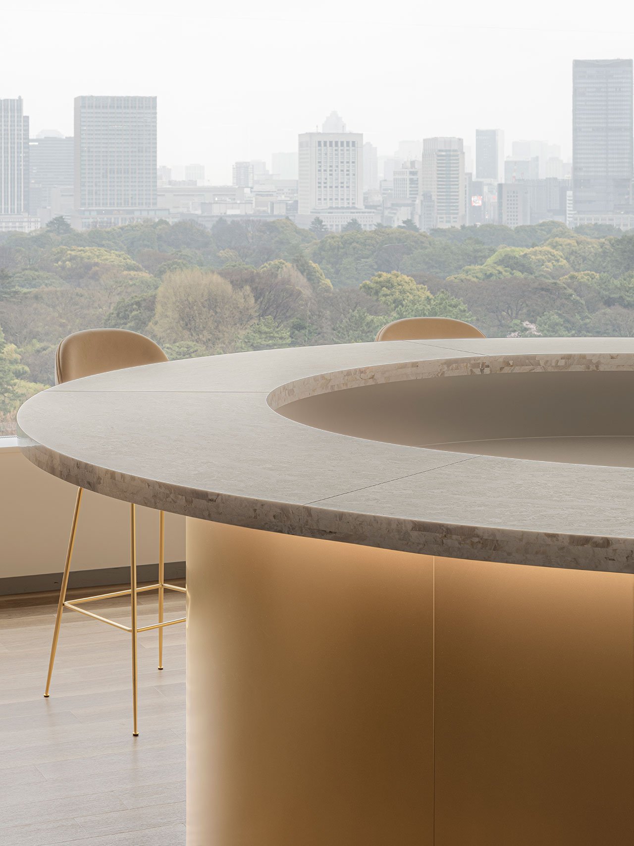 Blessed with verdant views of the Imperial Palace’s gardens, the space combines the calming minimalism of Japanese aesthetics with the French company’s visual identity, design sophistication and savoir faire through a series of bespoke furniture, lighting and artworks. Coupled with flexible workstations, plush lounge areas and bold red and champagne-gold accents, Cartier’s Tokyo headquarters is yet another example of how the Maison’s vision for beauty goes hand in hand with its forward-looking sensibility.
