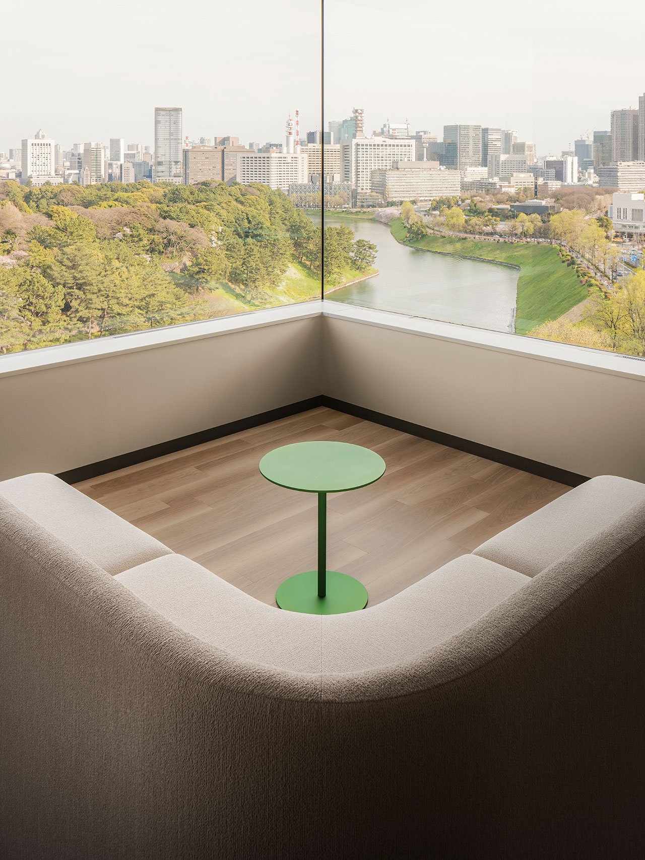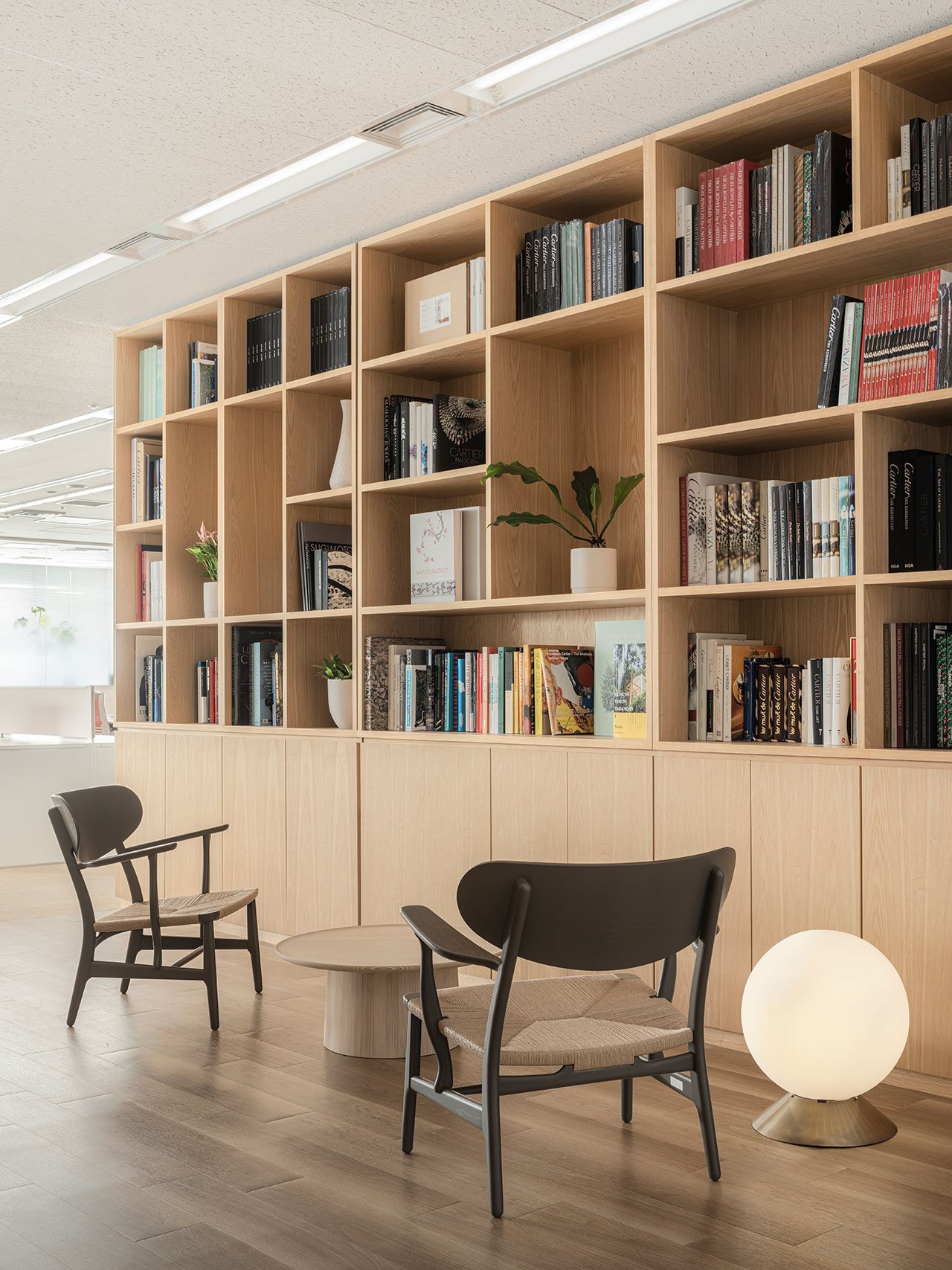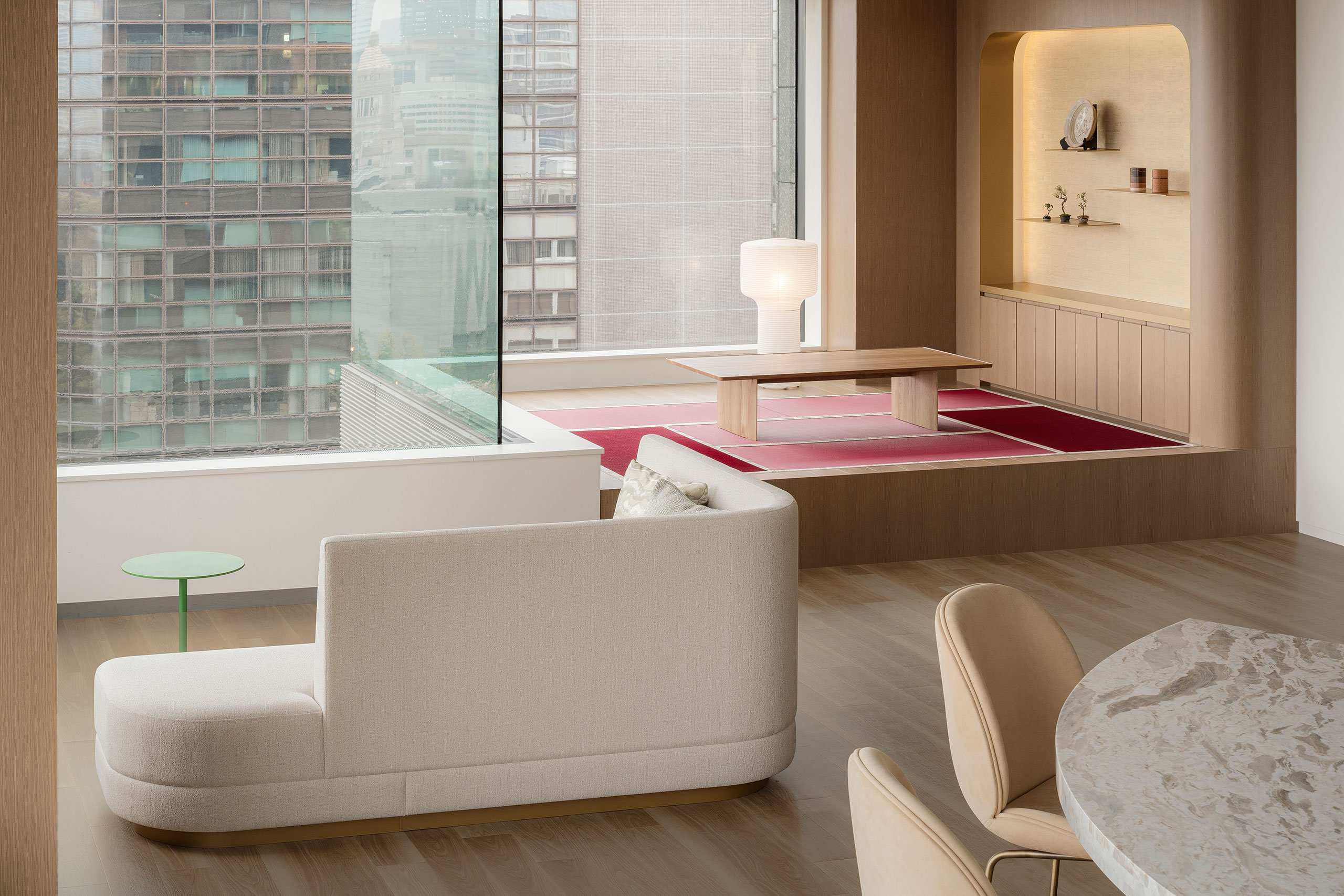 The office feels light and airy thanks to abundant natural light streaming in from the full-height windows, an open-plan configuration, and a muted palette of white, cream and light toned natural wood. Stepping inside, you are welcomed by a circular lounge encased in vertical, floor-to-ceiling louvre panels. Swathed in the brand’s signature red hue, the two semicircular sofas by Tokyo-based Time & Style make for a bold statement, while the diffused illumination and plush textures convey a sense of calmness and comfort.