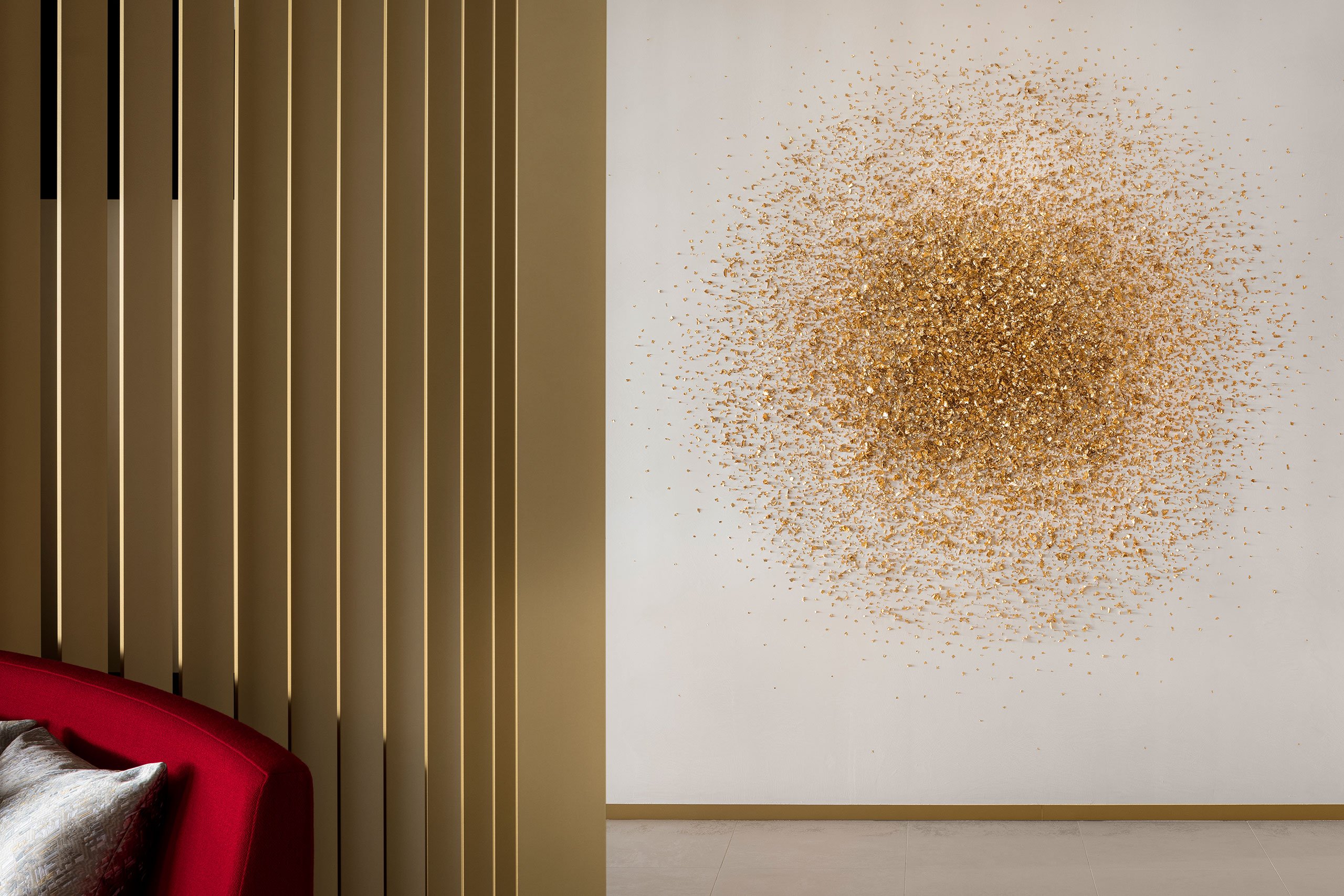 A gold leaf artwork by the entrance echoes the lounge’s round shape and further underlines the sense of luxury and craftsmanship, as does a custom chandelier in the main work area. Made of wave forming gold louvres, the chandelier crowns a circular communal desk featuring matching gold strips that demarcate individual workstations, and a central planter that adds a dash of greenery.