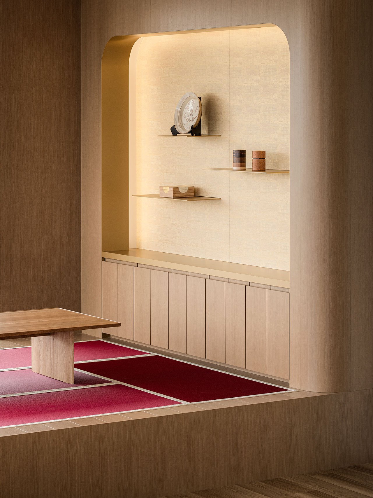 럭셔리와 우아함. 프랑스 쥬얼리 브랜드 까르띠에를 부르는 말이다. 이번 도쿄 오피스는 브랜드를 상징하는 고급스러움과 우아함을 인테리어 디자인 요소로 적용, 우아한 미니멀 공간을 완성한다. 포인트 컬러로 적용된 골드와 레드는 원형 쇼파를 감싸는 핀루버로 확장되는 동시에 레드 쇼파와 다다미룸으로 표현된다.