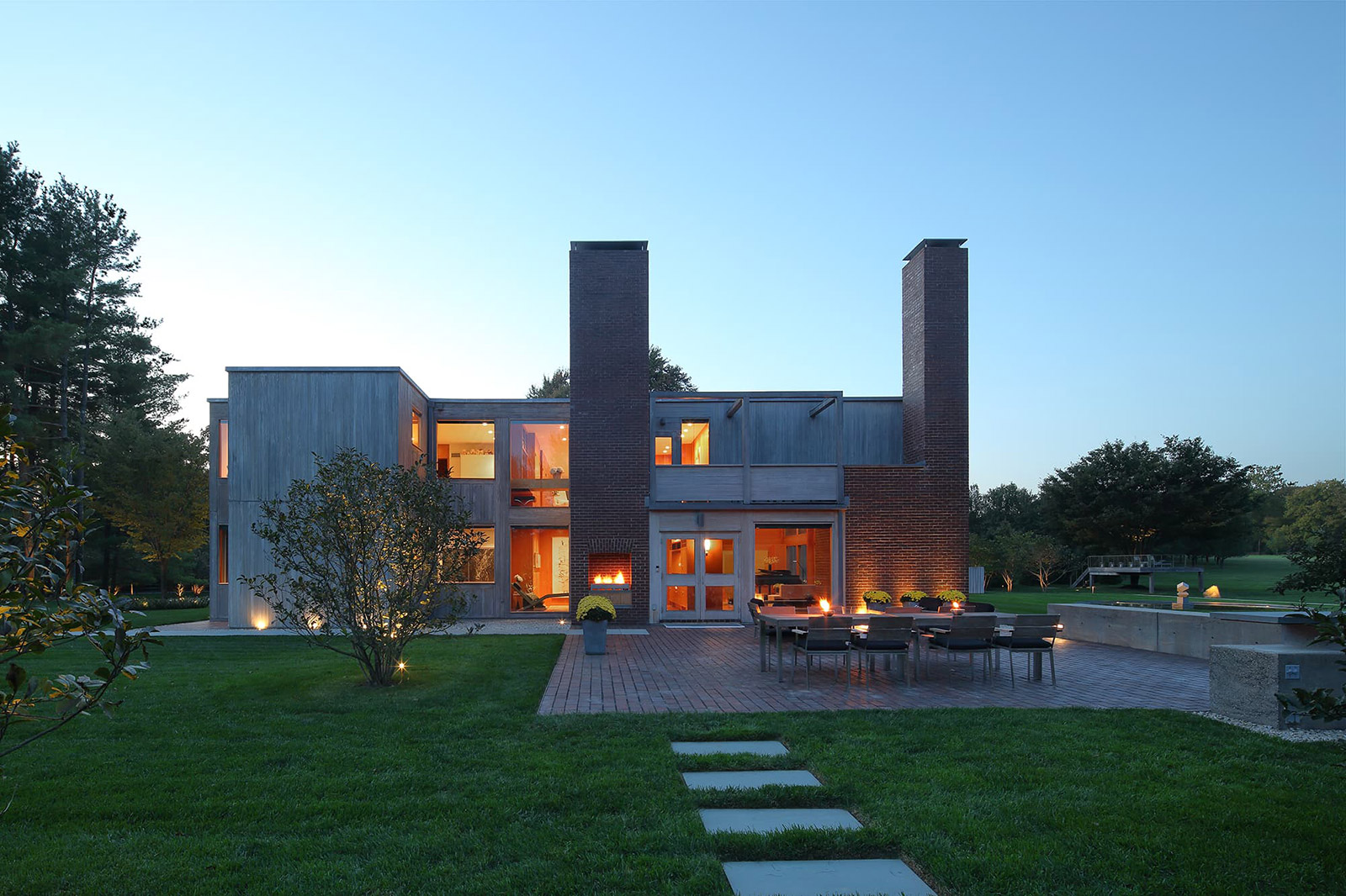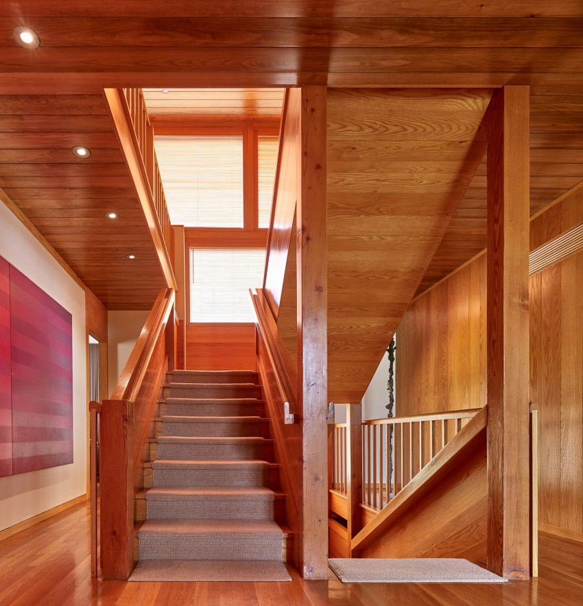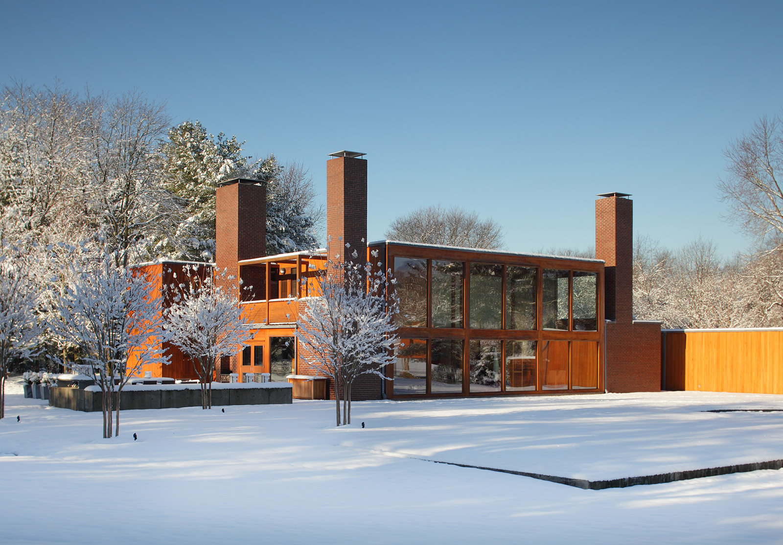 The Korman house is the largest and most glamorous of the private homes Kahn built, with nine bathrooms, six bedrooms, and a two-story, glass walled living room. The house showcases exquisite materials, with its exterior made of cypress, glass, and brick, three 30 ft. brick chimneys, and a concrete foundation. The interior comprises douglas fir beams, white oak, and pine ceilings.