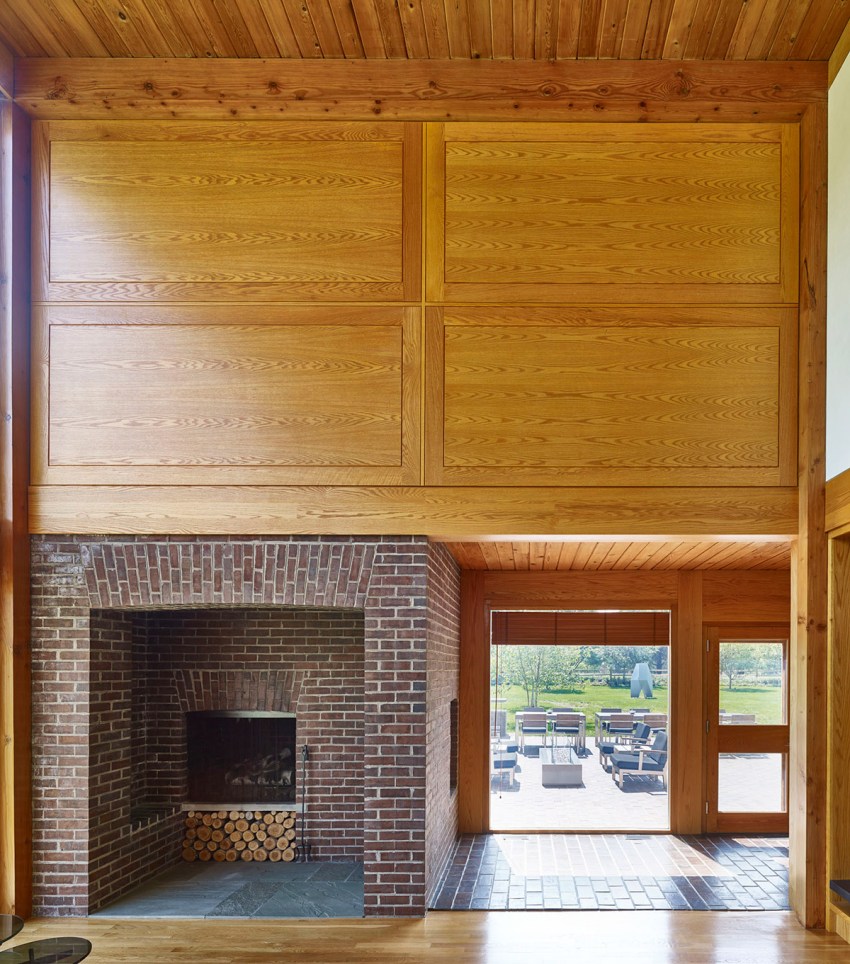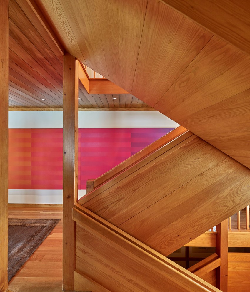 The entry hall’s focal point is its staircase; beams of douglas fir extend from the basement to the second floor, elegantly defining the space. A left turn from the entrance leads into the living and dining spaces. Instead of giving us the sense that we’re traveling deeper into the house and further from outdoors, entering the double-height room brings us back to the land: floor-to ceiling windows reveal the open field behind the house, fully visible for the first time. The living room has privacy but also a feeling of openness: the room isn’t closed off from the larger living area or the outdoors.