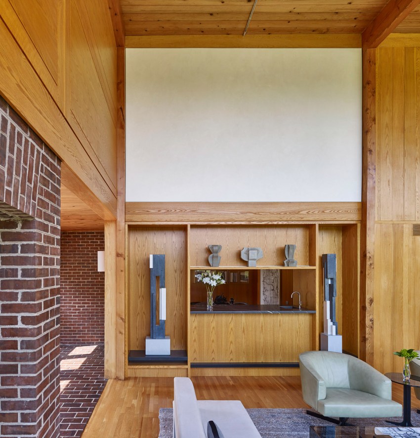 The entry hall’s focal point is its staircase; beams of douglas fir extend from the basement to the second floor, elegantly defining the space. A left turn from the entrance leads into the living and dining spaces. Instead of giving us the sense that we’re traveling deeper into the house and further from outdoors, entering the double-height room brings us back to the land: floor-to ceiling windows reveal the open field behind the house, fully visible for the first time. The living room has privacy but also a feeling of openness: the room isn’t closed off from the larger living area or the outdoors.