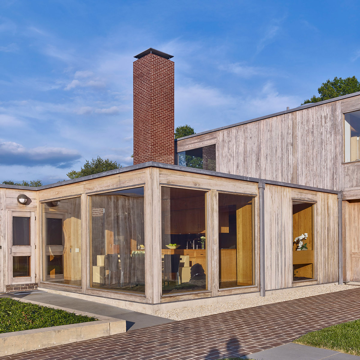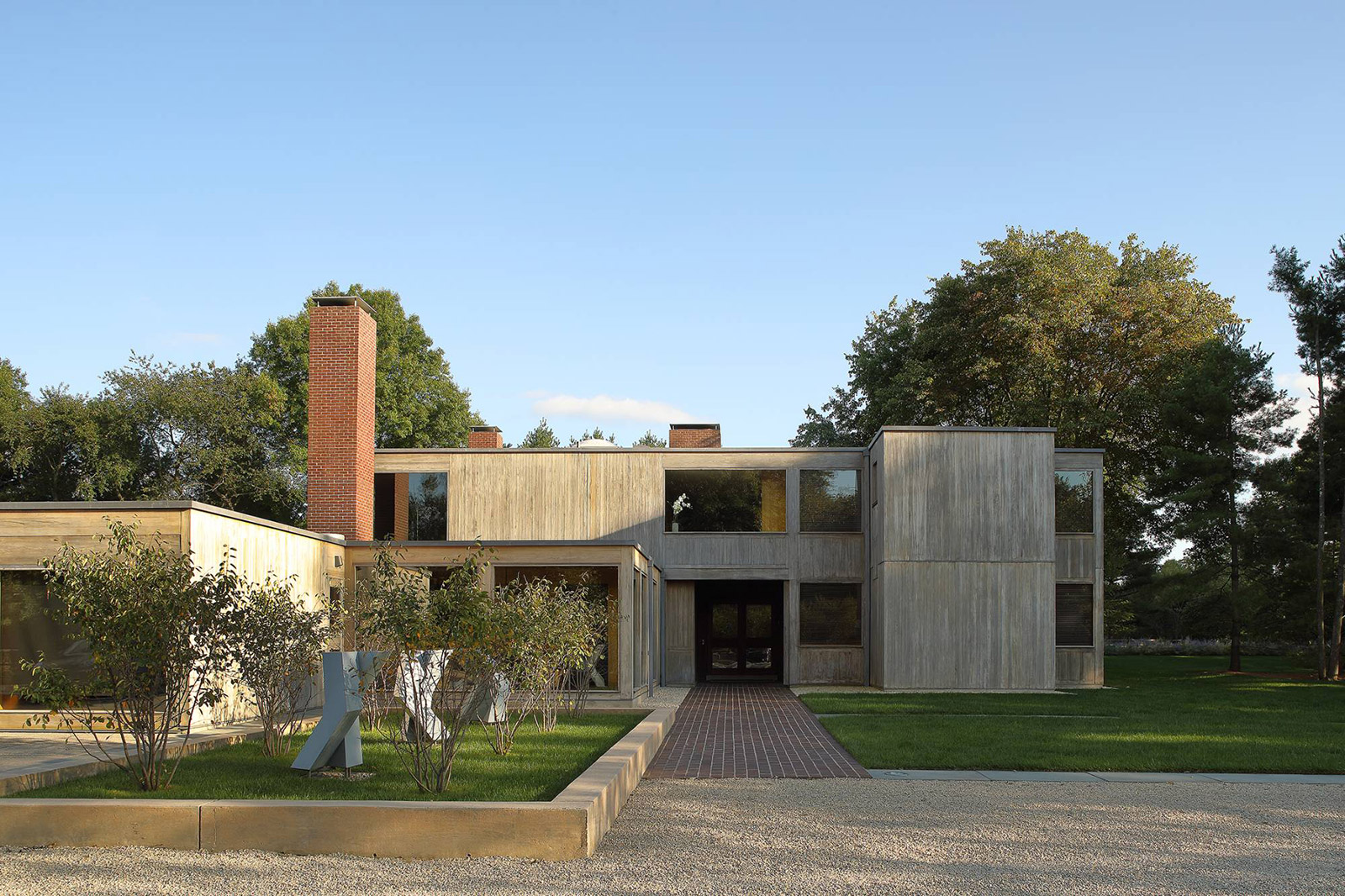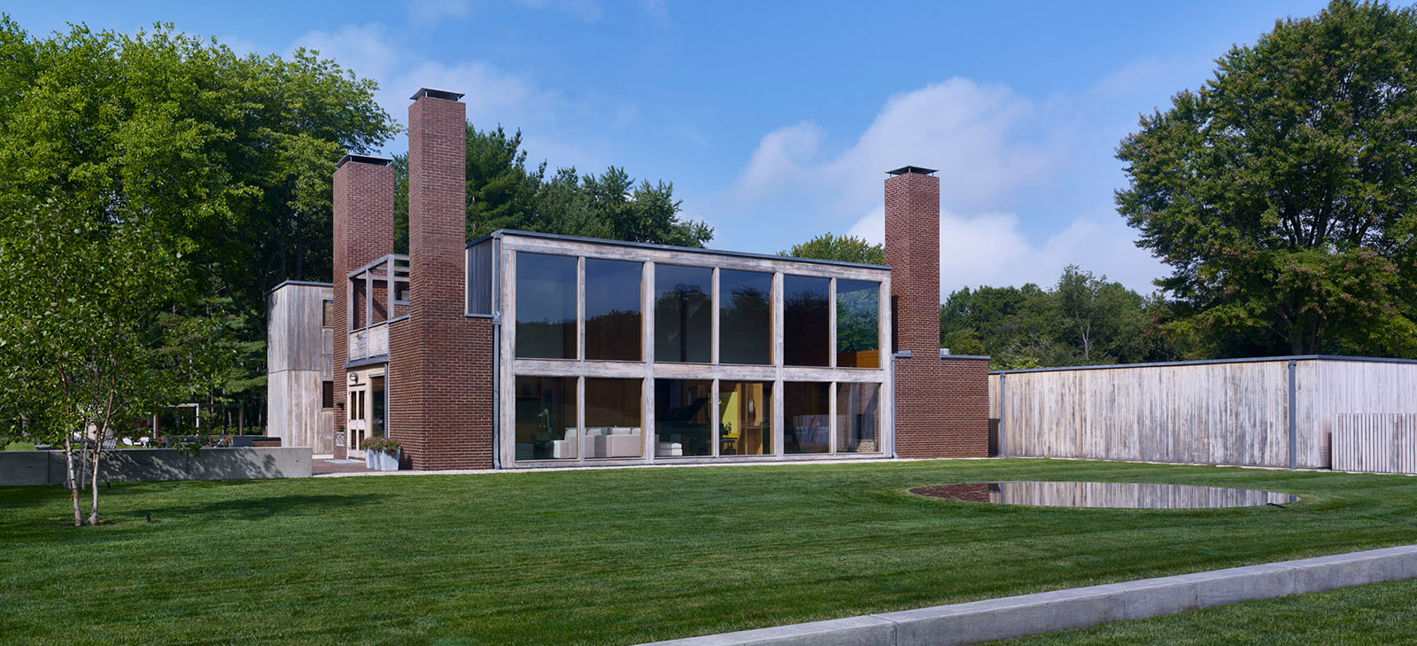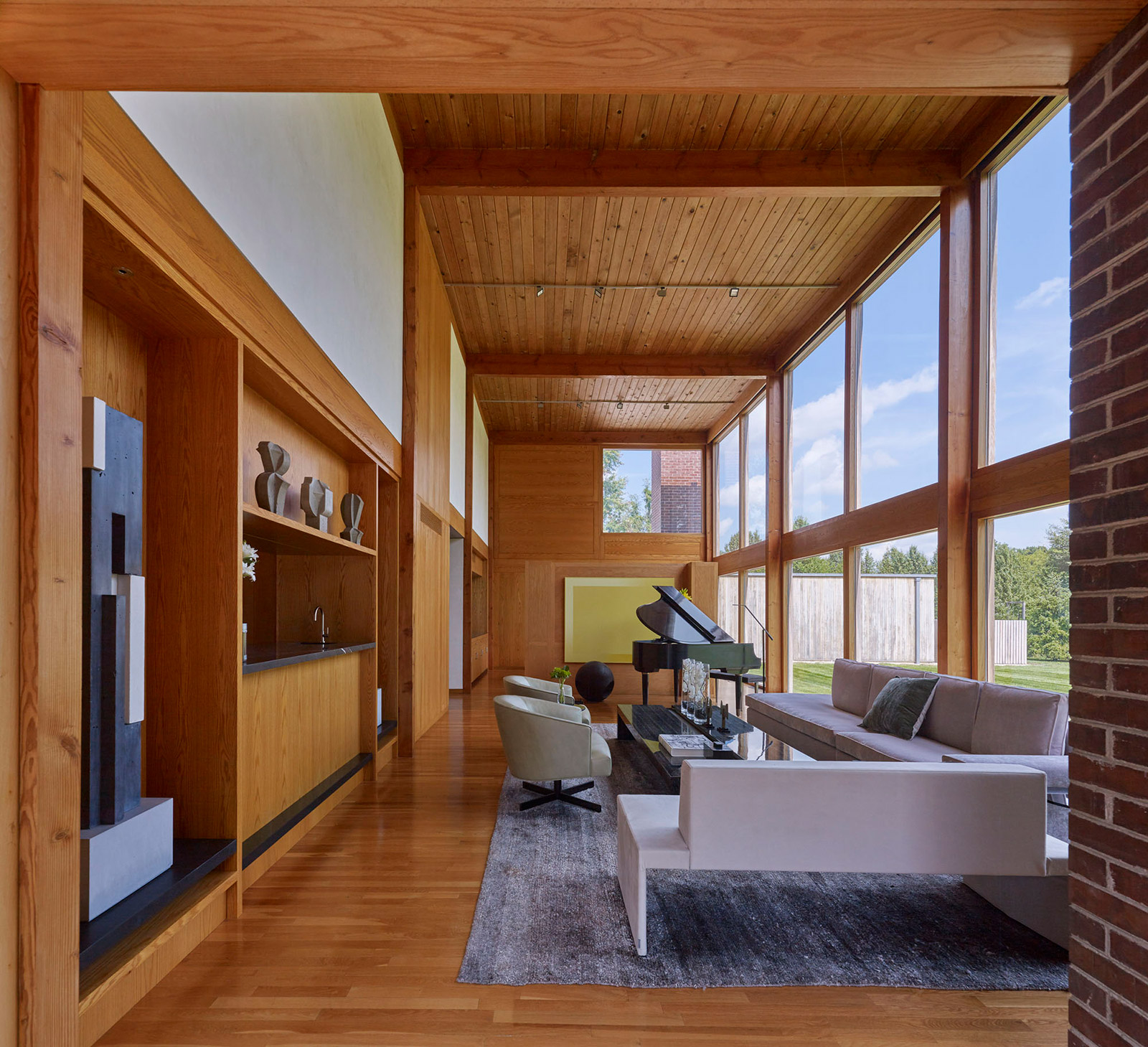 The Korman house is the largest and most glamorous of the private homes Kahn built, with nine bathrooms, six bedrooms, and a two-story, glass walled living room. The house showcases exquisite materials, with its exterior made of cypress, glass, and brick, three 30 ft. brick chimneys, and a concrete foundation. The interior comprises douglas fir beams, white oak, and pine ceilings.