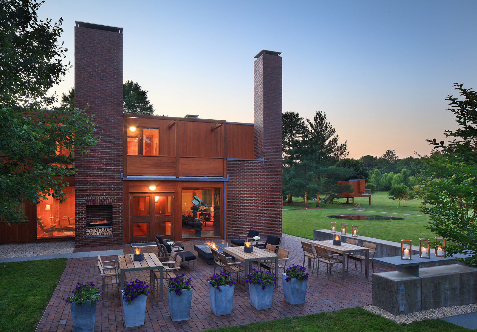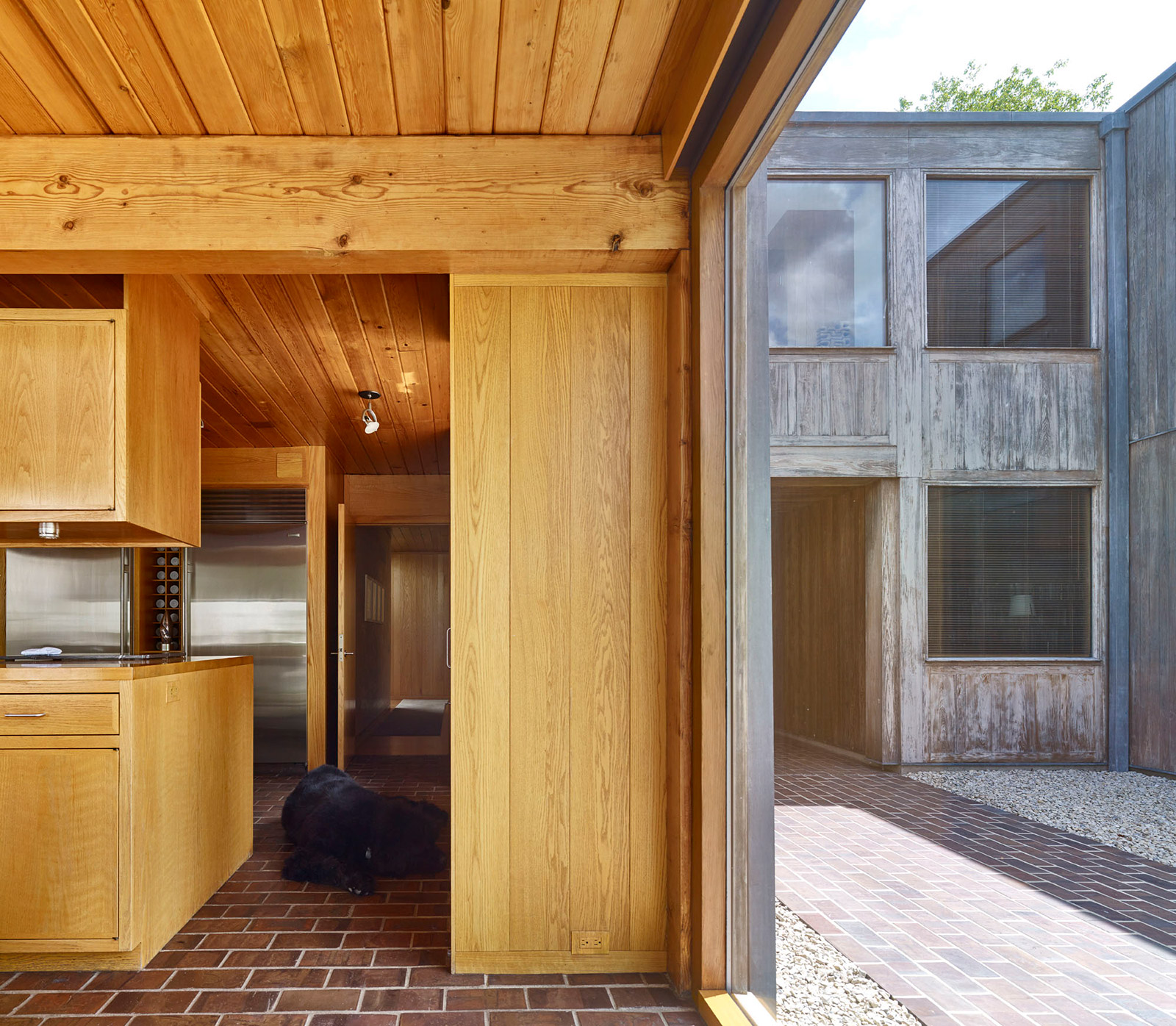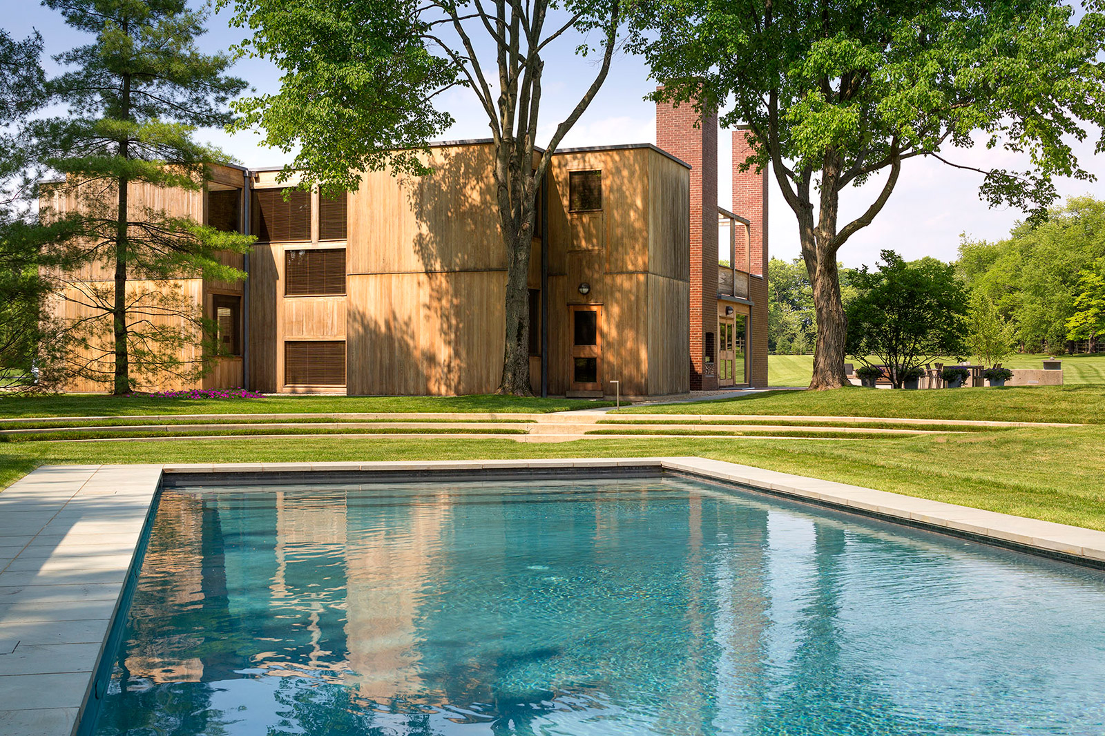 The Korman house is the largest and most glamorous of the private homes Kahn built, with nine bathrooms, six bedrooms, and a two-story, glass walled living room. The house showcases exquisite materials, with its exterior made of cypress, glass, and brick, three 30 ft. brick chimneys, and a concrete foundation. The interior comprises douglas fir beams, white oak, and pine ceilings.
