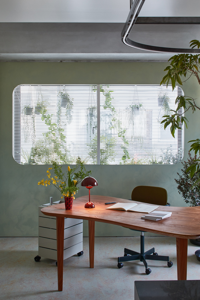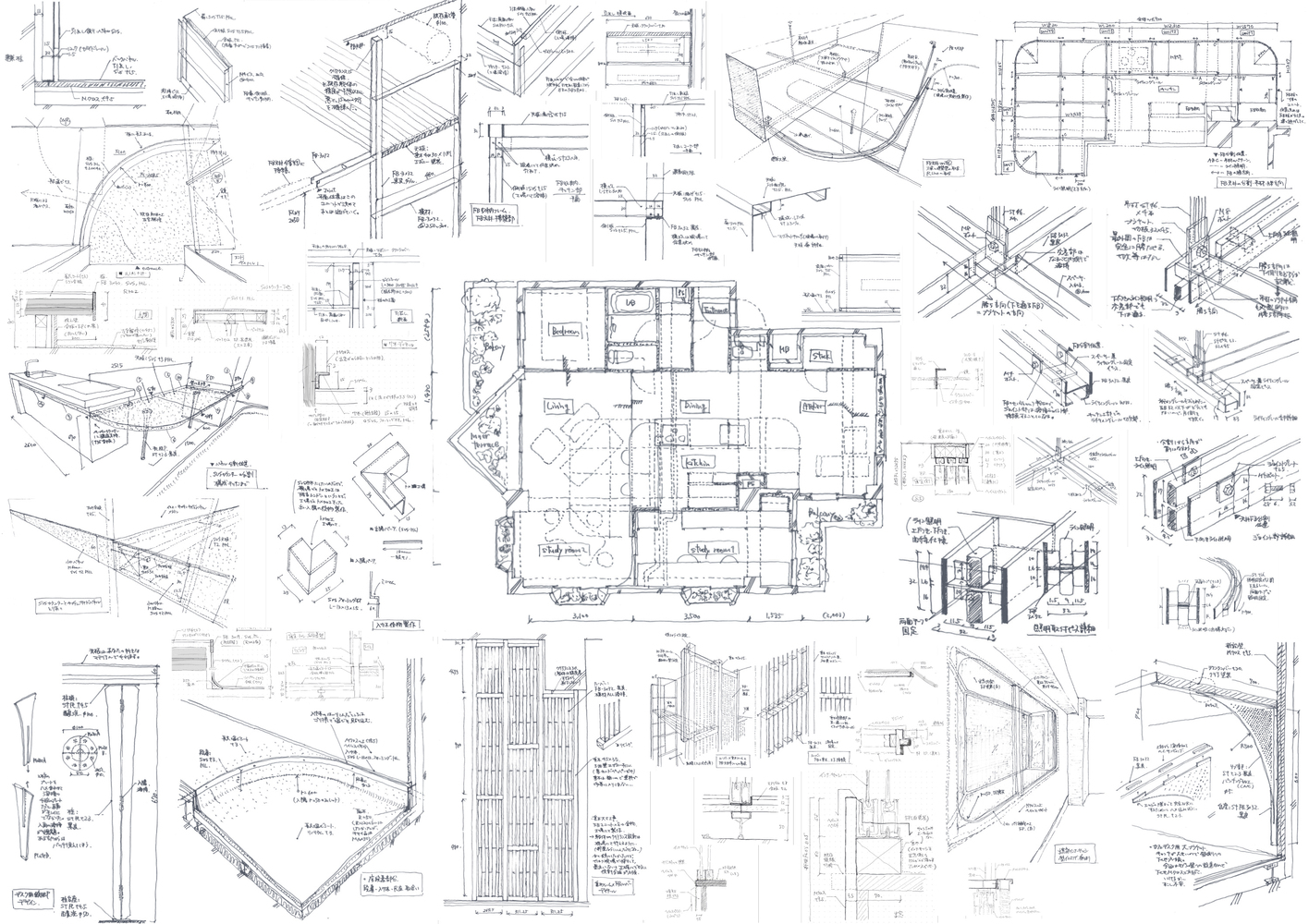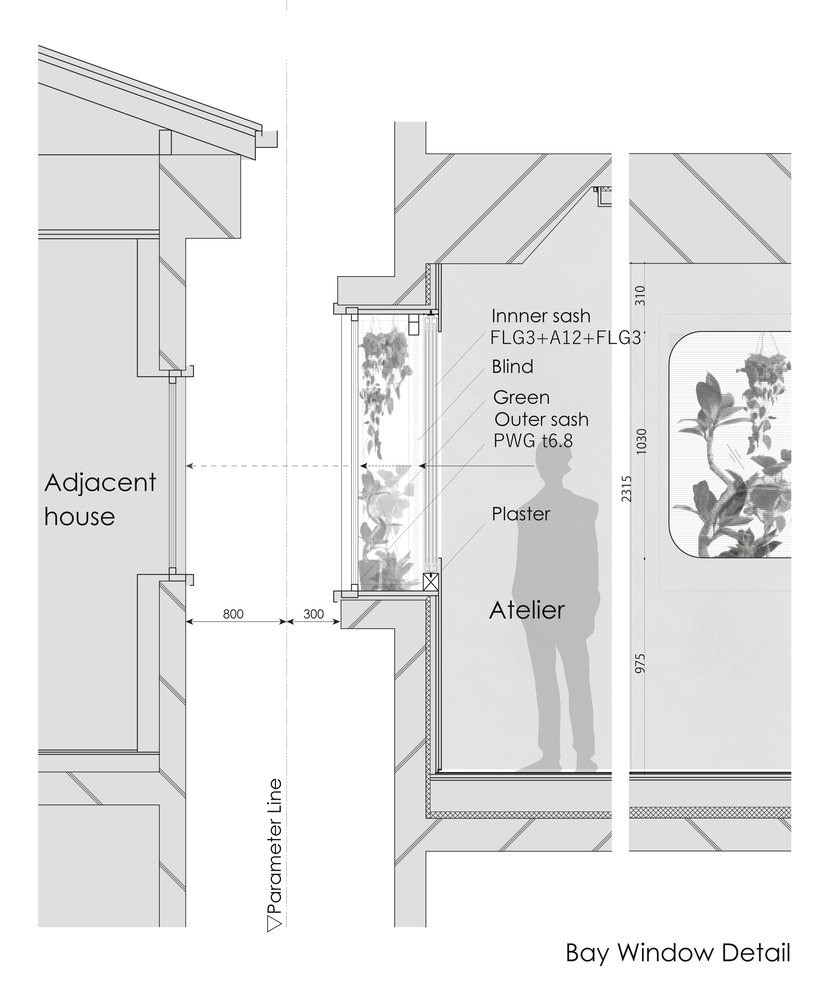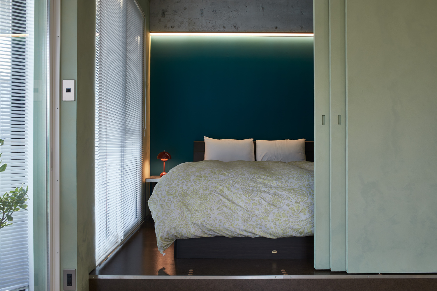 The distance from the neighborhood is an extremely important theme when living in the high density residential area of Tokyo. We planned a "Green Back" as a background surrounding the one-room. Using the existing bow window, the green layer made by plants was put together, partitioned by an inner sash. the sash was hidden by covering the inner wall from the inside, and it was set up as an opening with rounded corners. The four layers avoid the direct line of sight with the neighbors while controlling direct light and improving thermal insulation. The building is designed to be a comfortable and attractive space at the same time. The idea was to create a perimeter that is derived from the central Linkaged Ring, and which can be continuously experienced as a single enclosure up to the exterior walls of the neighborhood filtered by the Green Back.
