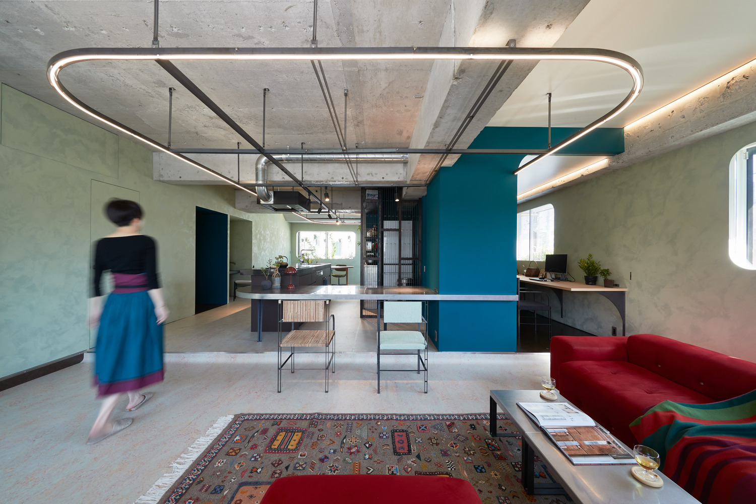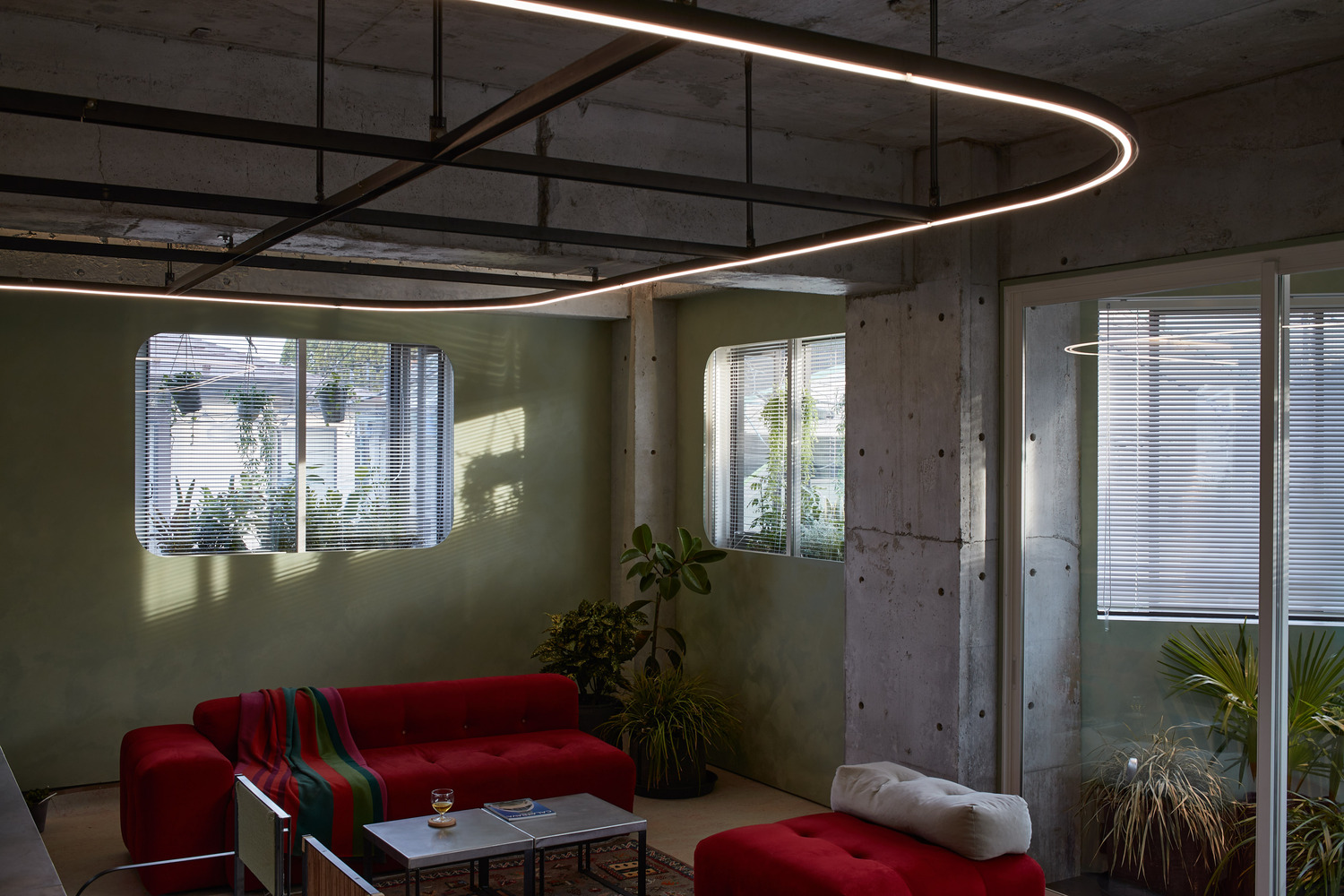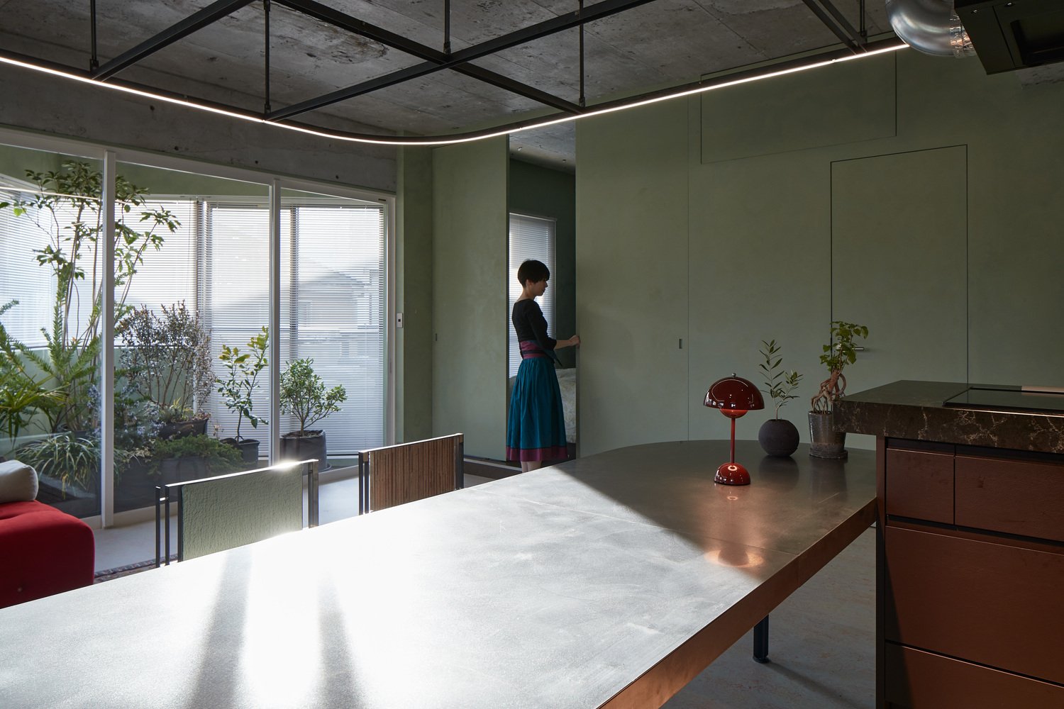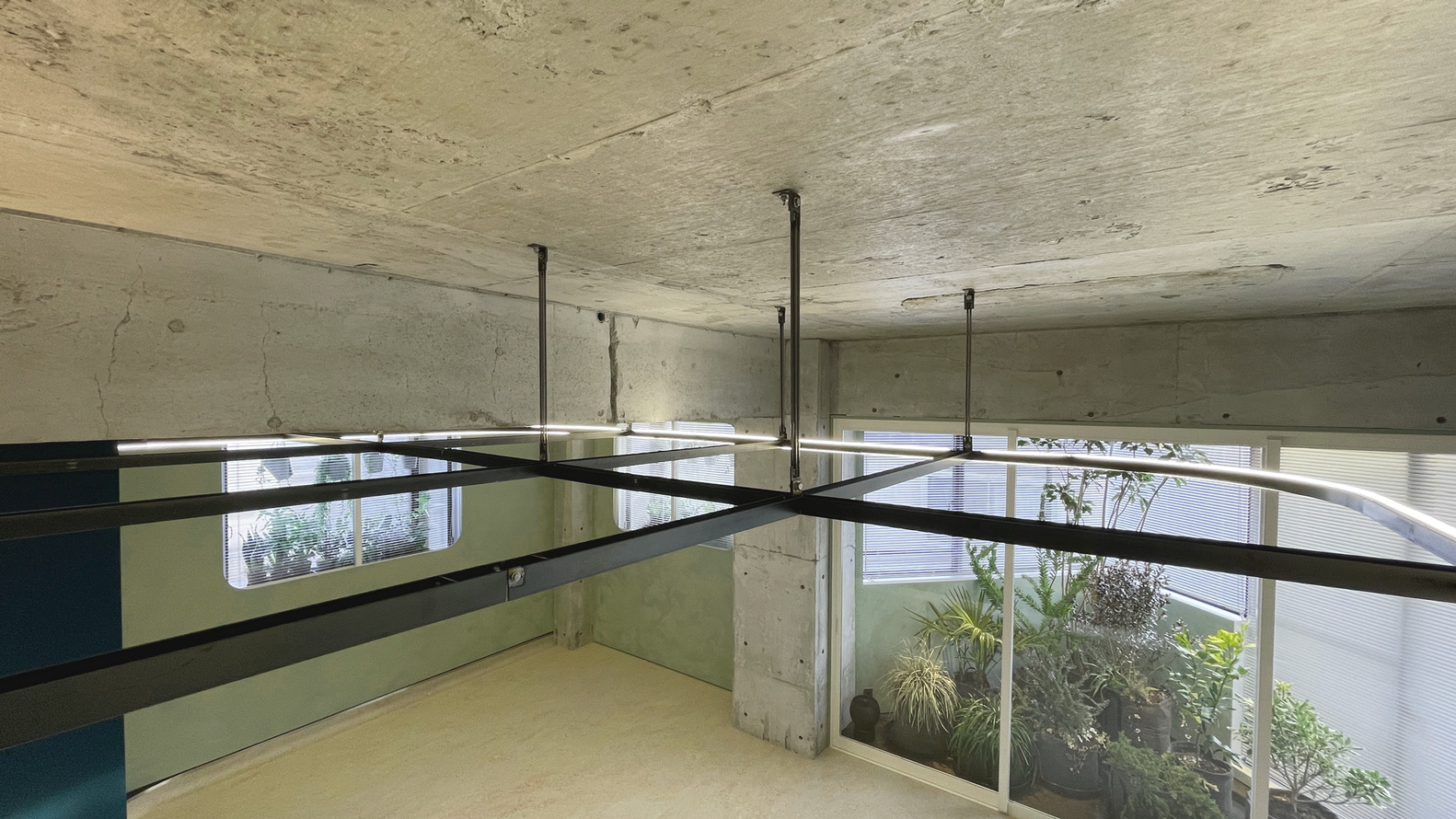 A " Linkaged Ring" was planned in the center of the plan as hardware suspended from the existing ceiling, crossing the kitchen, dining room, living room, and studio, which are all arranged in one room. It is composed of two flat bars, with lighting fixtures placed above and below. When used as a studio, it can be utilized as a lighting baton. The design contrasts the irregular and strong existing frame with the sharp straight lines of the steel frame passing through FL+2050, and the integrated lighting brings them both to attention.