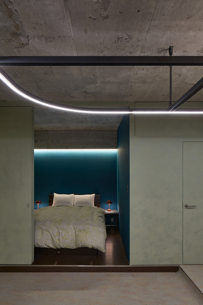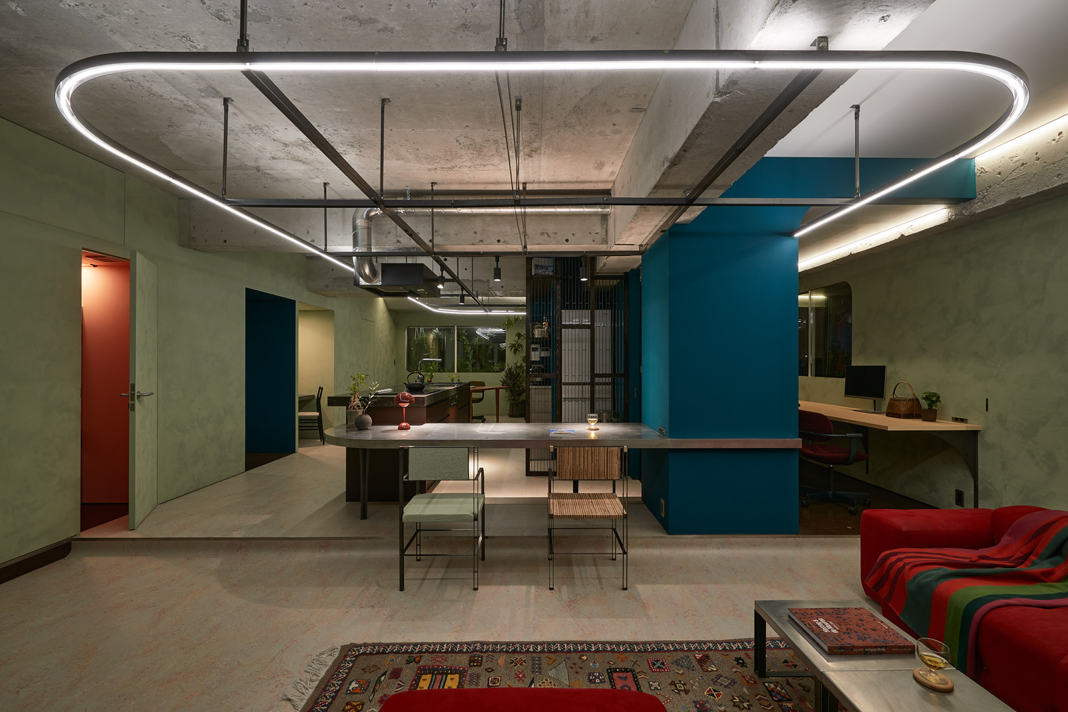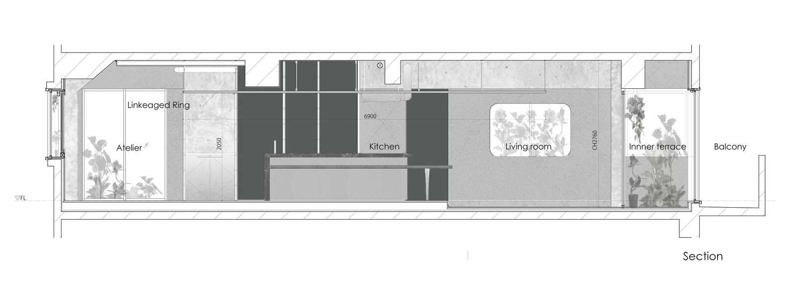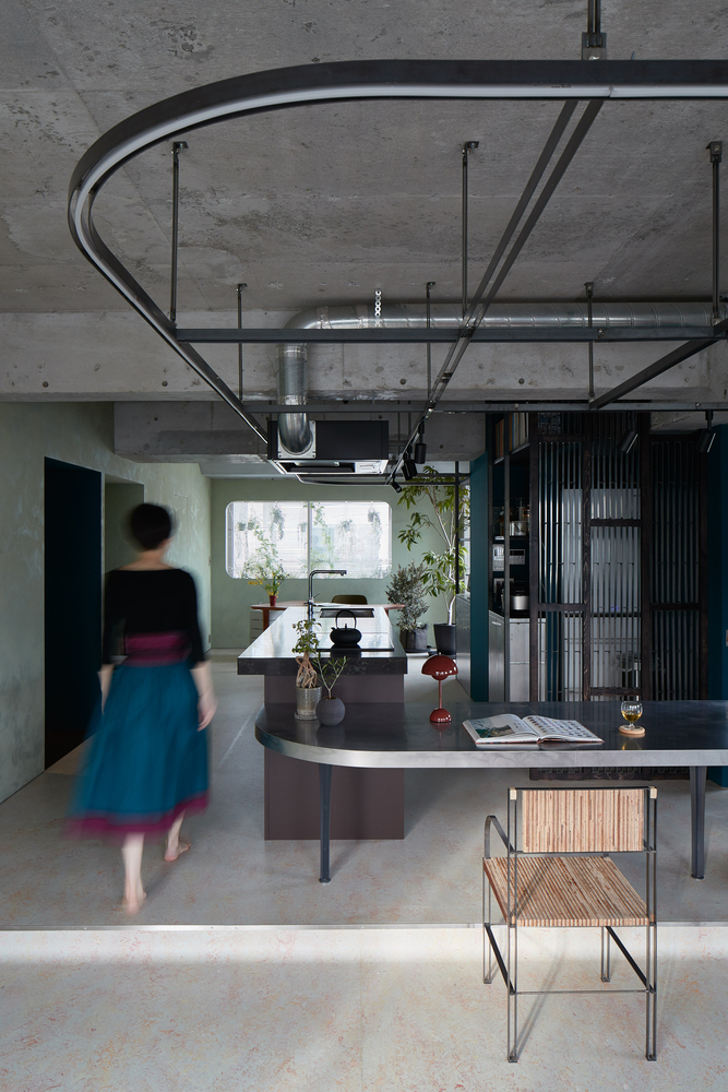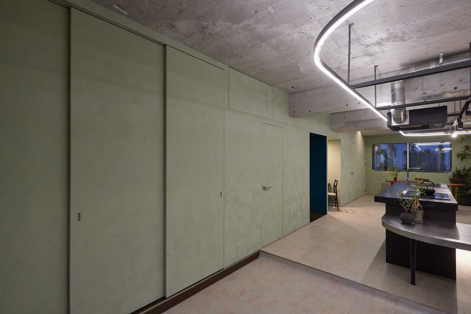 A " Linkaged Ring" was planned in the center of the plan as hardware suspended from the existing ceiling, crossing the kitchen, dining room, living room, and studio, which are all arranged in one room. It is composed of two flat bars, with lighting fixtures placed above and below. When used as a studio, it can be utilized as a lighting baton. The design contrasts the irregular and strong existing frame with the sharp straight lines of the steel frame passing through FL+2050, and the integrated lighting brings them both to attention.