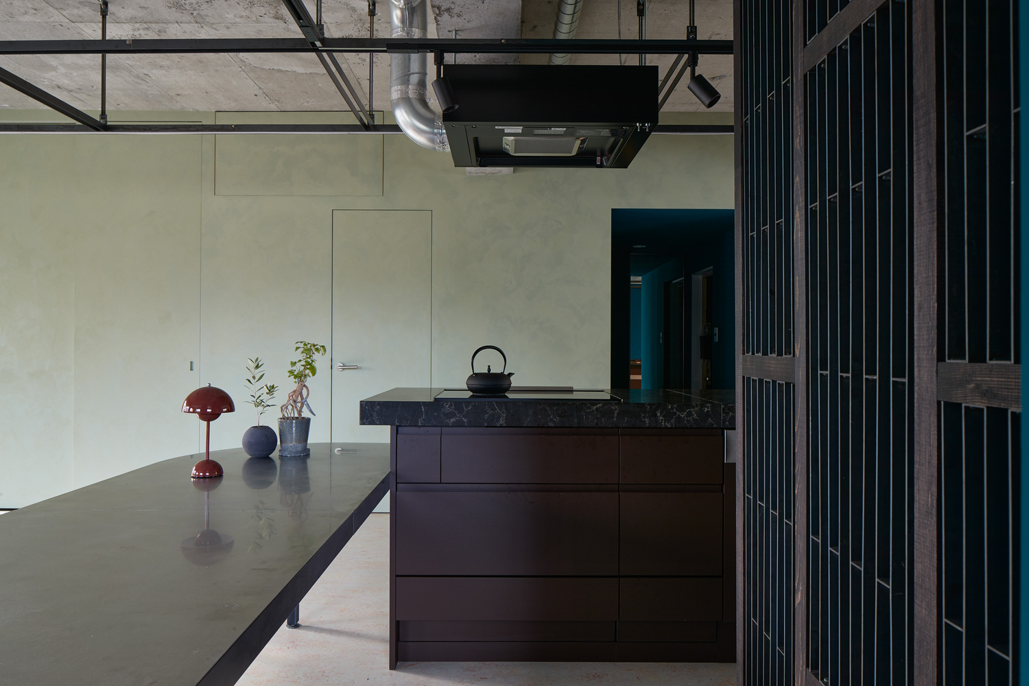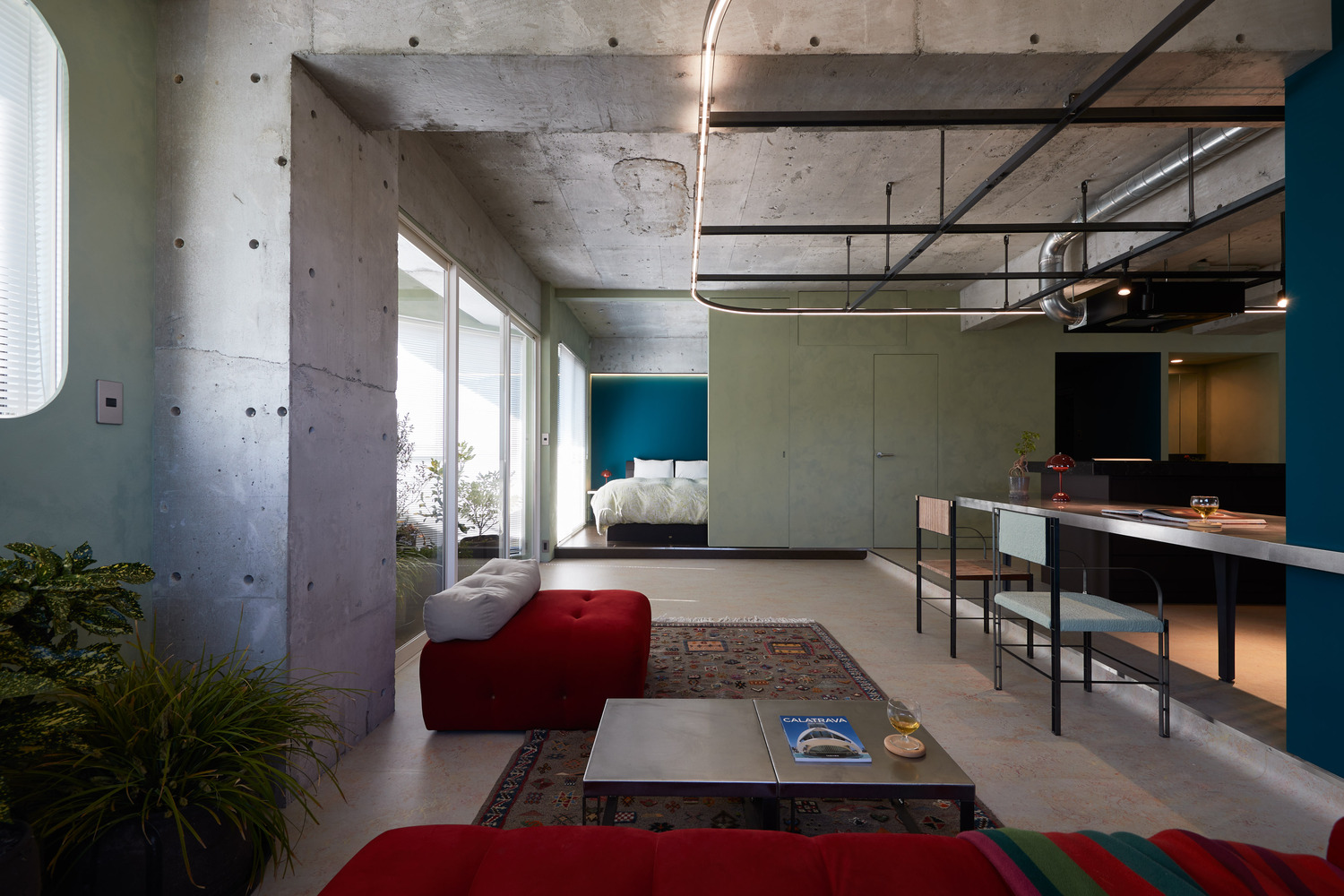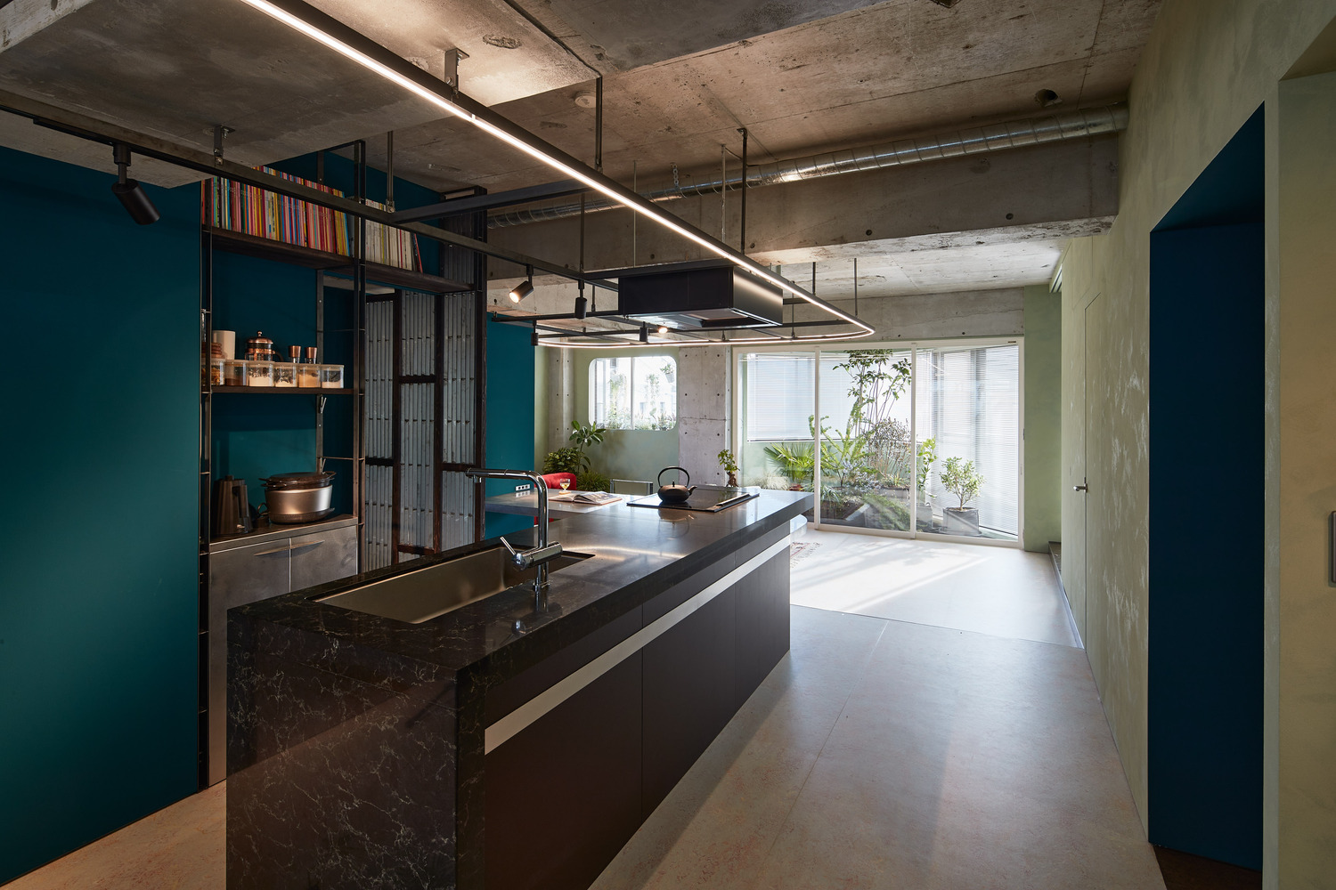 We carefully read the existing conditions and proceeded with the renovation plan, respecting "a bright space with eight openings" and "the materiality of the aged concrete". In order to utilize the eight openings, after a large number of design studies to maximize air volume and line of sight, a one room was adopted merging of dining and living room and kitchen and atelier that can be partitioned by sliding doors. Furthermore, to maximize the presence of the existing concrete structure, steel flat bars were inserted to create a contrasting relationship between the materials and structural members.