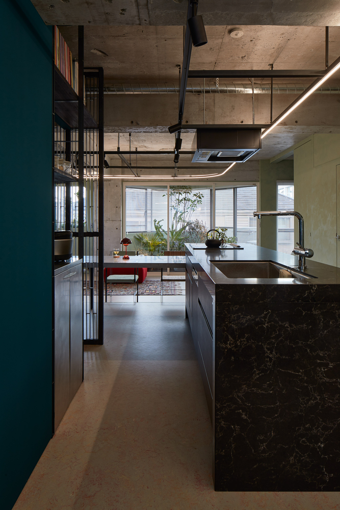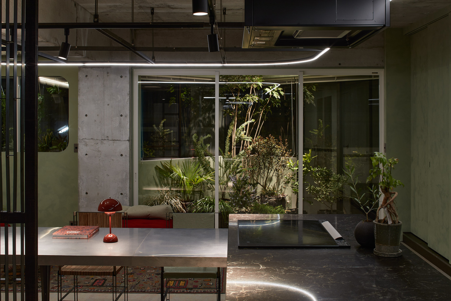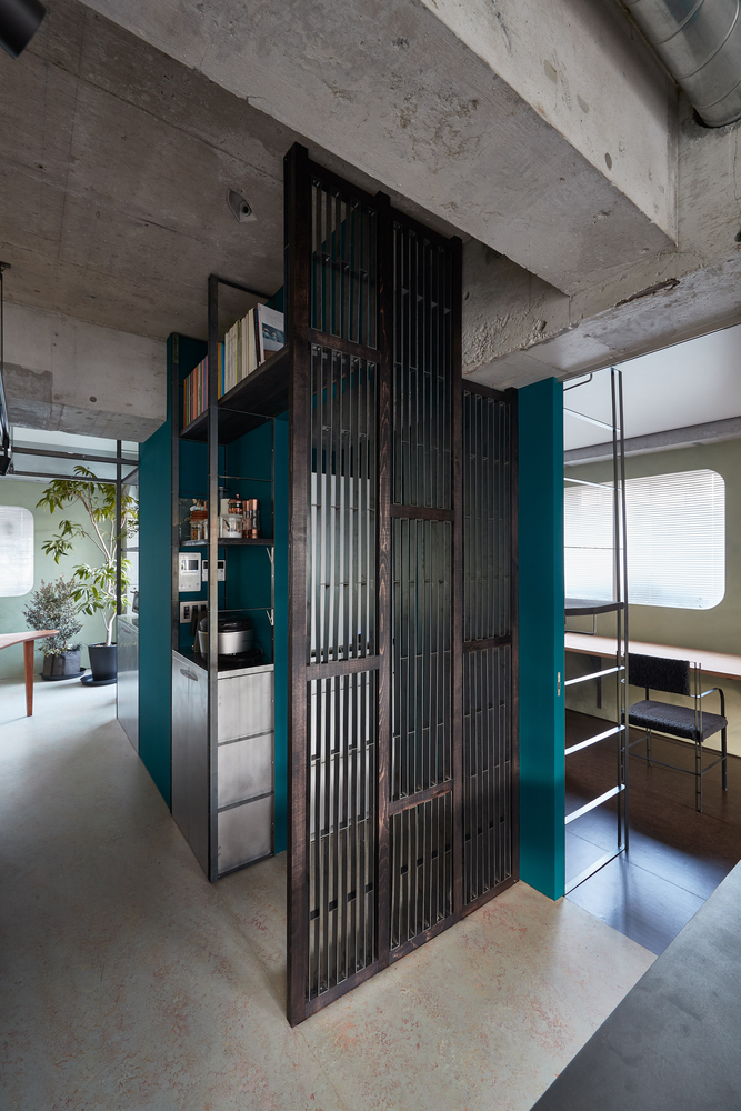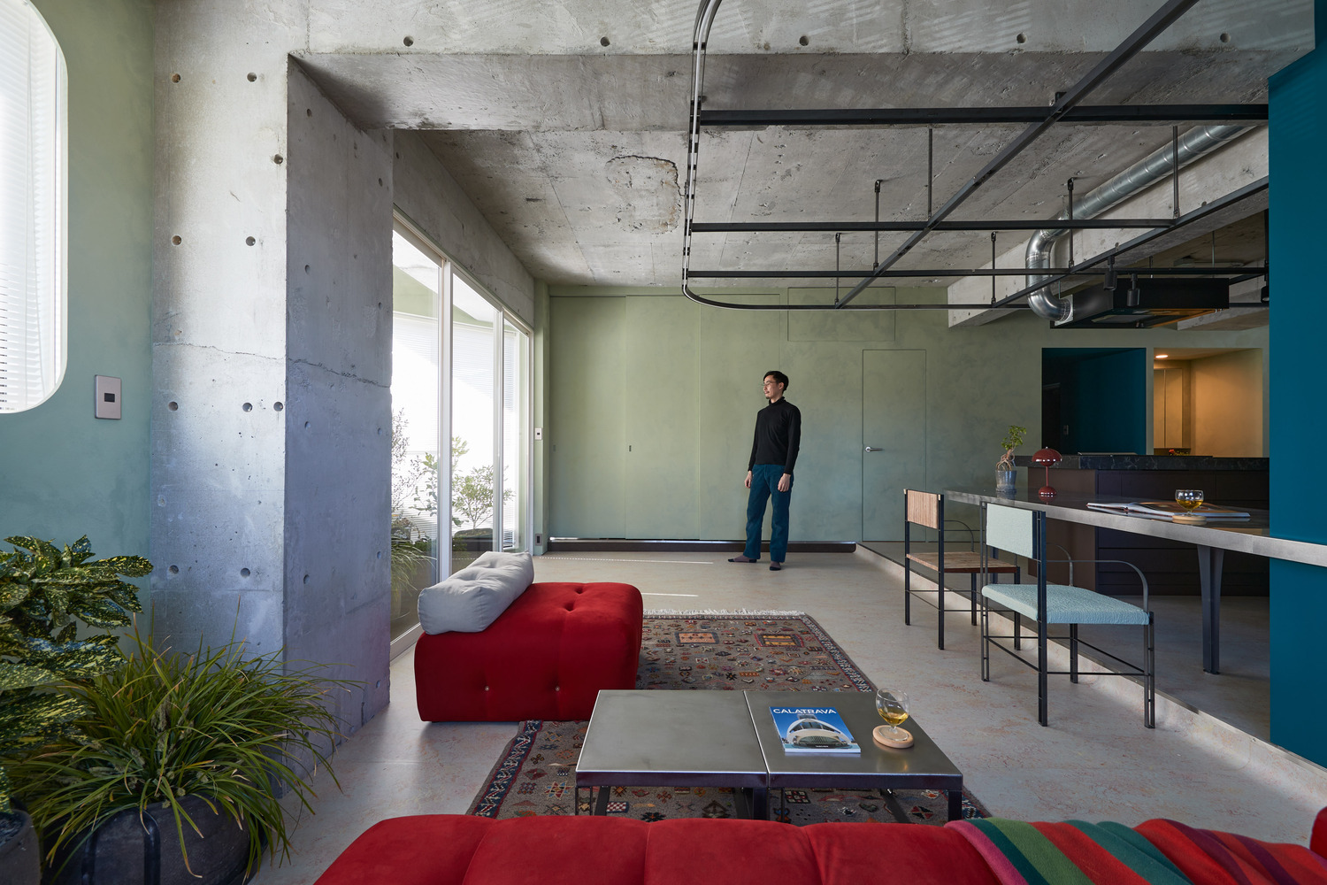 We carefully read the existing conditions and proceeded with the renovation plan, respecting "a bright space with eight openings" and "the materiality of the aged concrete". In order to utilize the eight openings, after a large number of design studies to maximize air volume and line of sight, a one room was adopted merging of dining and living room and kitchen and atelier that can be partitioned by sliding doors. Furthermore, to maximize the presence of the existing concrete structure, steel flat bars were inserted to create a contrasting relationship between the materials and structural members.