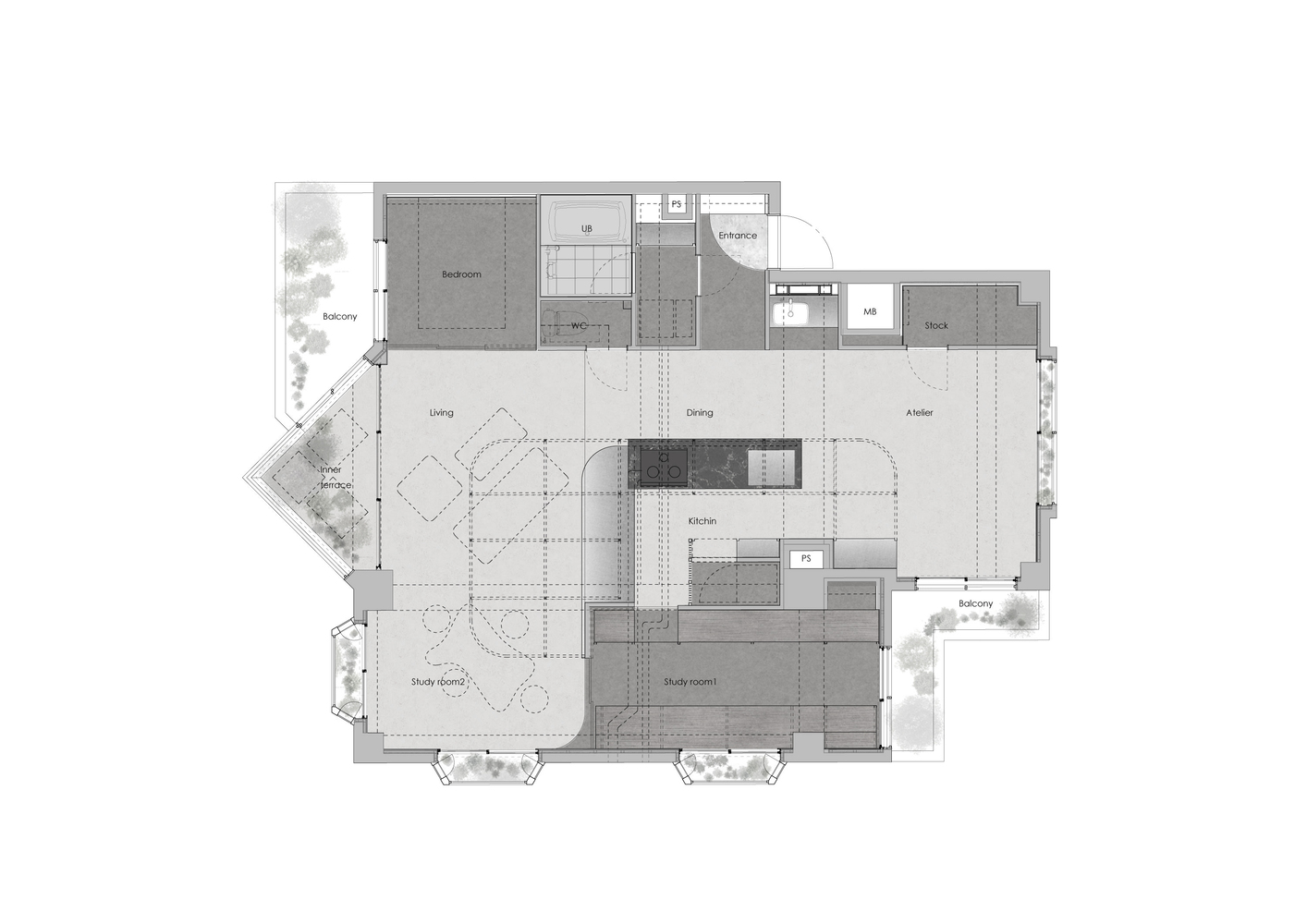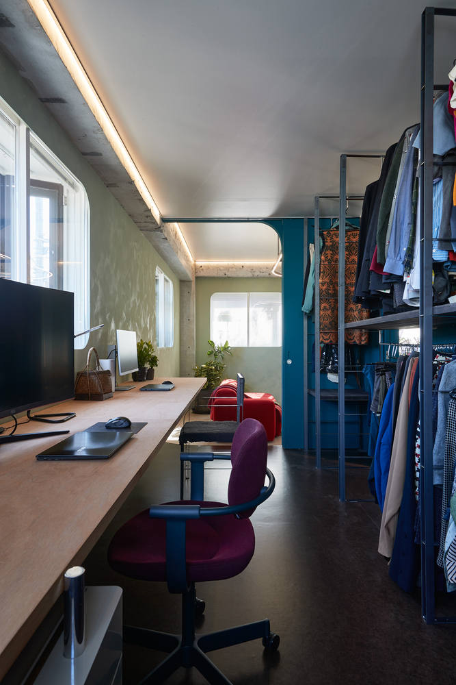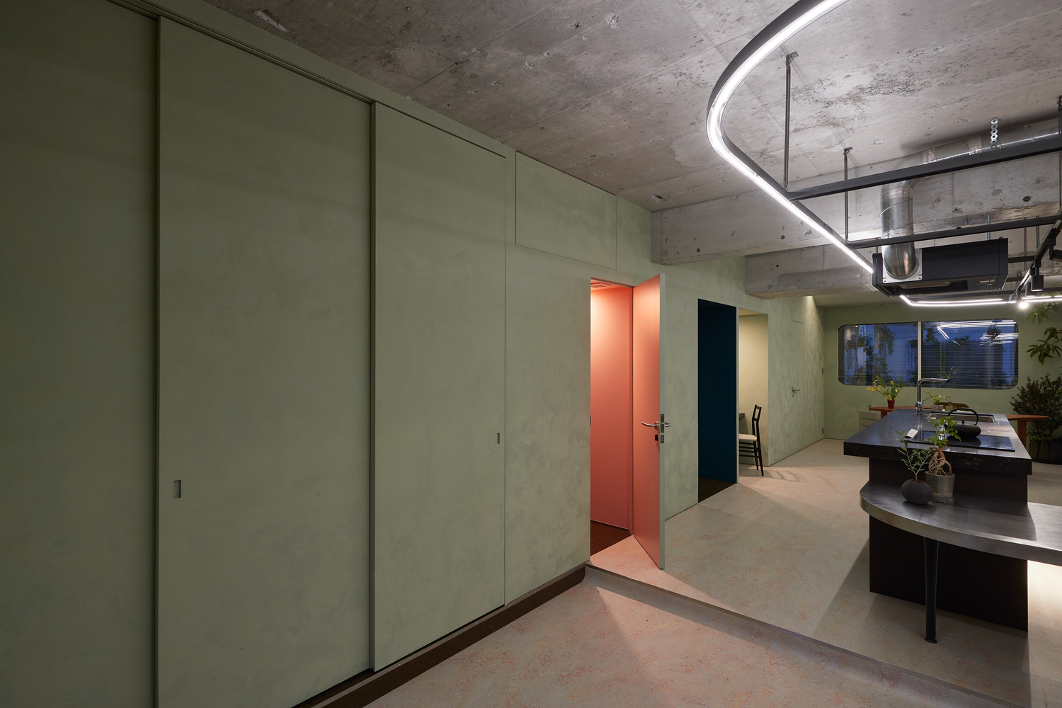 This is a renovation project of an architect's own residence. The 90 ㎡ floors on the second floor of the apartment building in a high density residential area was planned as a base for the diverse activities of the architect: a residence, an office, a studio, and a showroom.