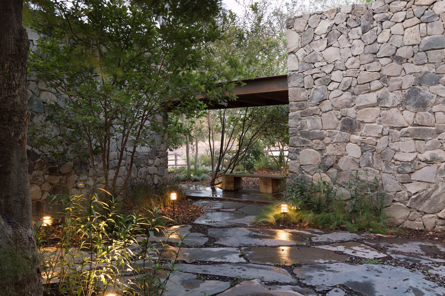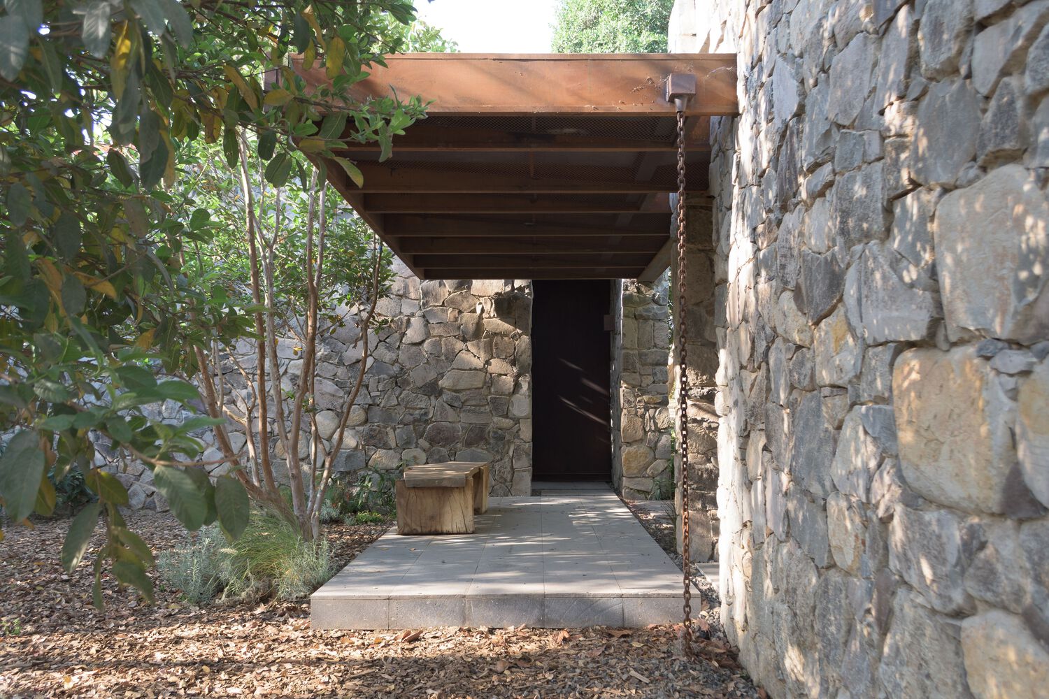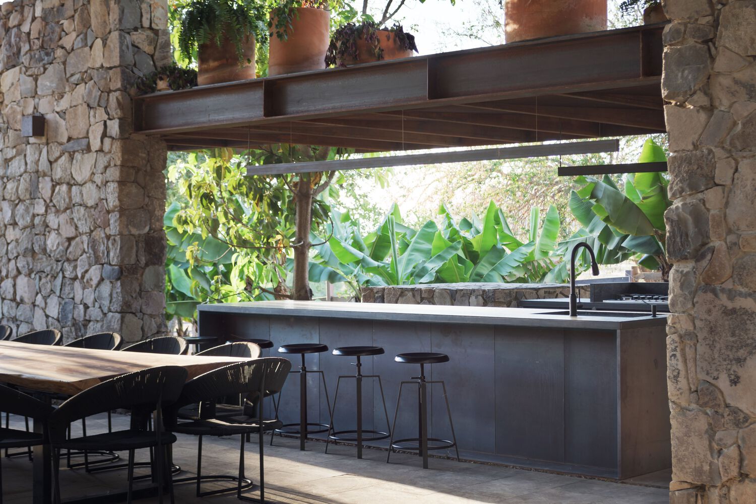 In response, the proposal was to articulate both scales of the program by creating a void that connects the landscaped area with the terrace and around which the different parts of the program were developed. The location of this patio was determined also by the pre existence of a Jacaranda tree that provides shade and color to the space during its flowering stage. The volumetry of the project is made up of three main elements. Two stereotomic stone prisms build up the east and north façade of the central patio, inside which are the restrooms and the cellar area. And the third volume with a tectonic character and slender columns that structure a perimeter at the top to visually order the traces of the pre-existing roof. This volume houses the living areas and forms the west facade of the central courtyard. The project can be completely transited through roofed circulations, but it is developed to live in constant contact with the outside.