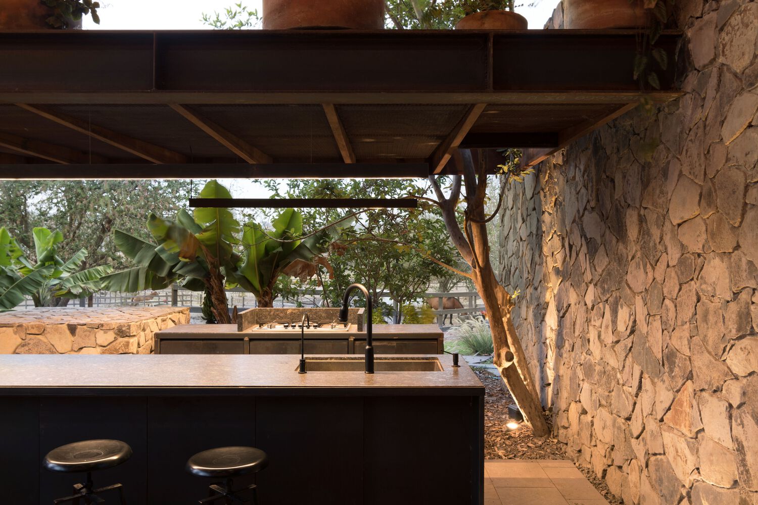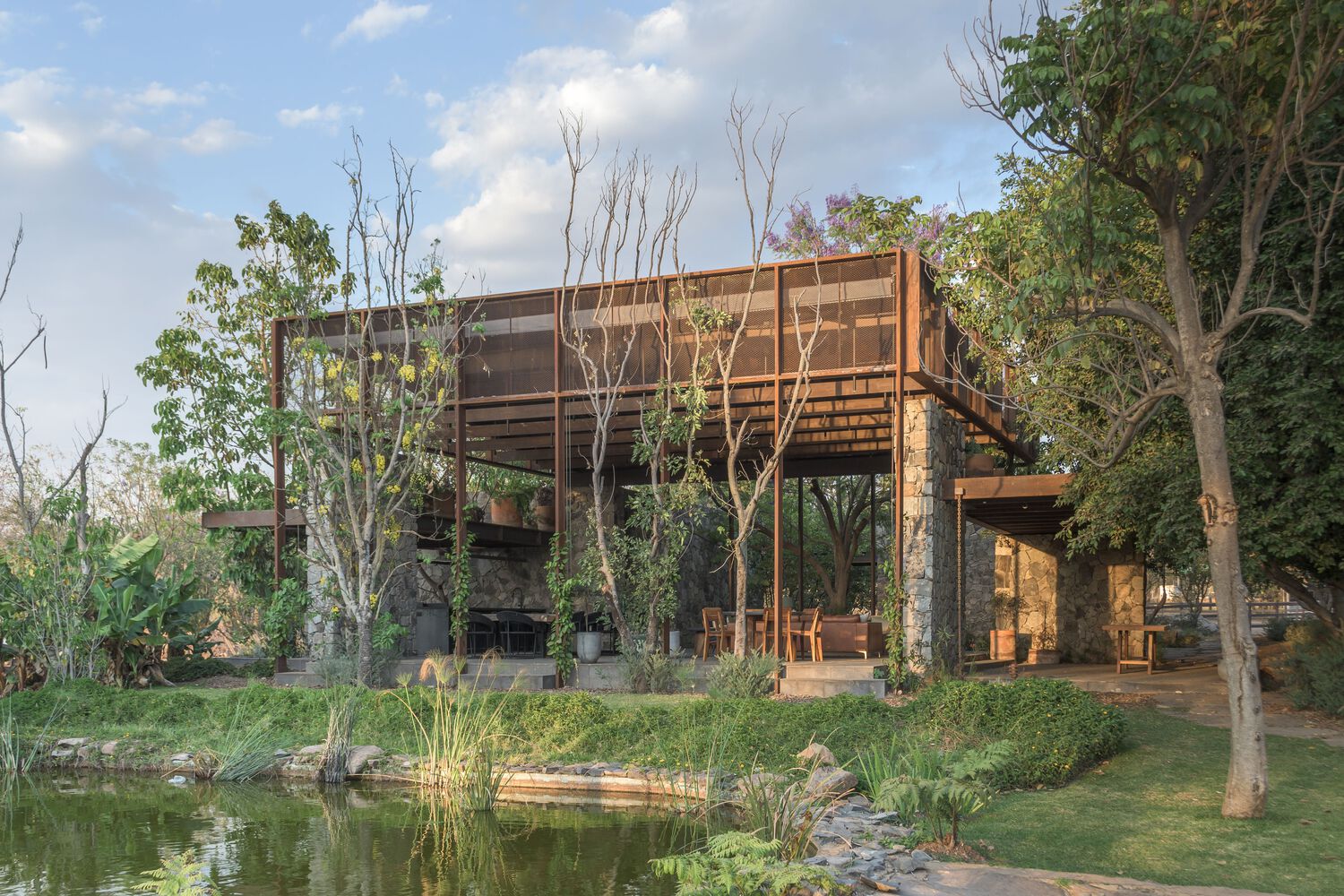 The project is located on the outskirts of the Guadalajara Metropolitan Area, within a ranch with an equestrian vocation. The office was asked to take advantage of an existing roof and base next to a pond and a densely wooded area to develop a terrace for mainly family use, contemplating the possibility that the restroom area could be used in larger events that happen sporadically in the adjoining landscaped area