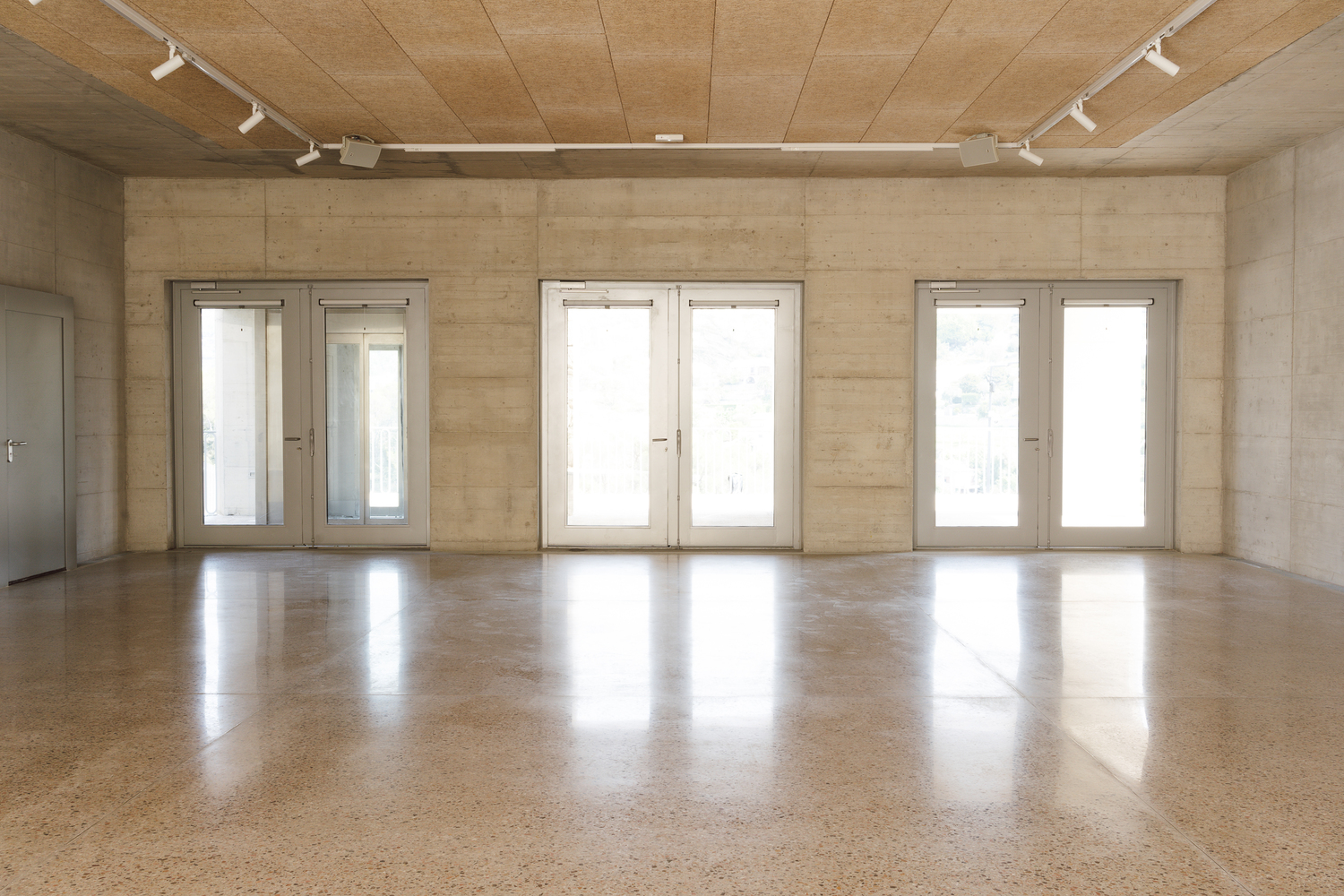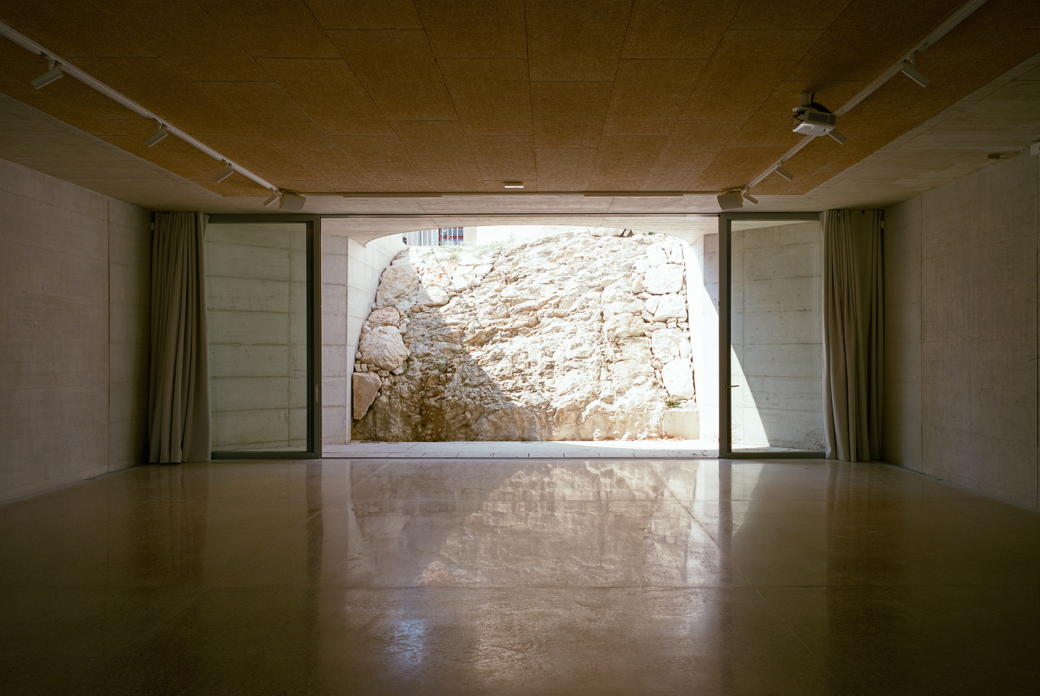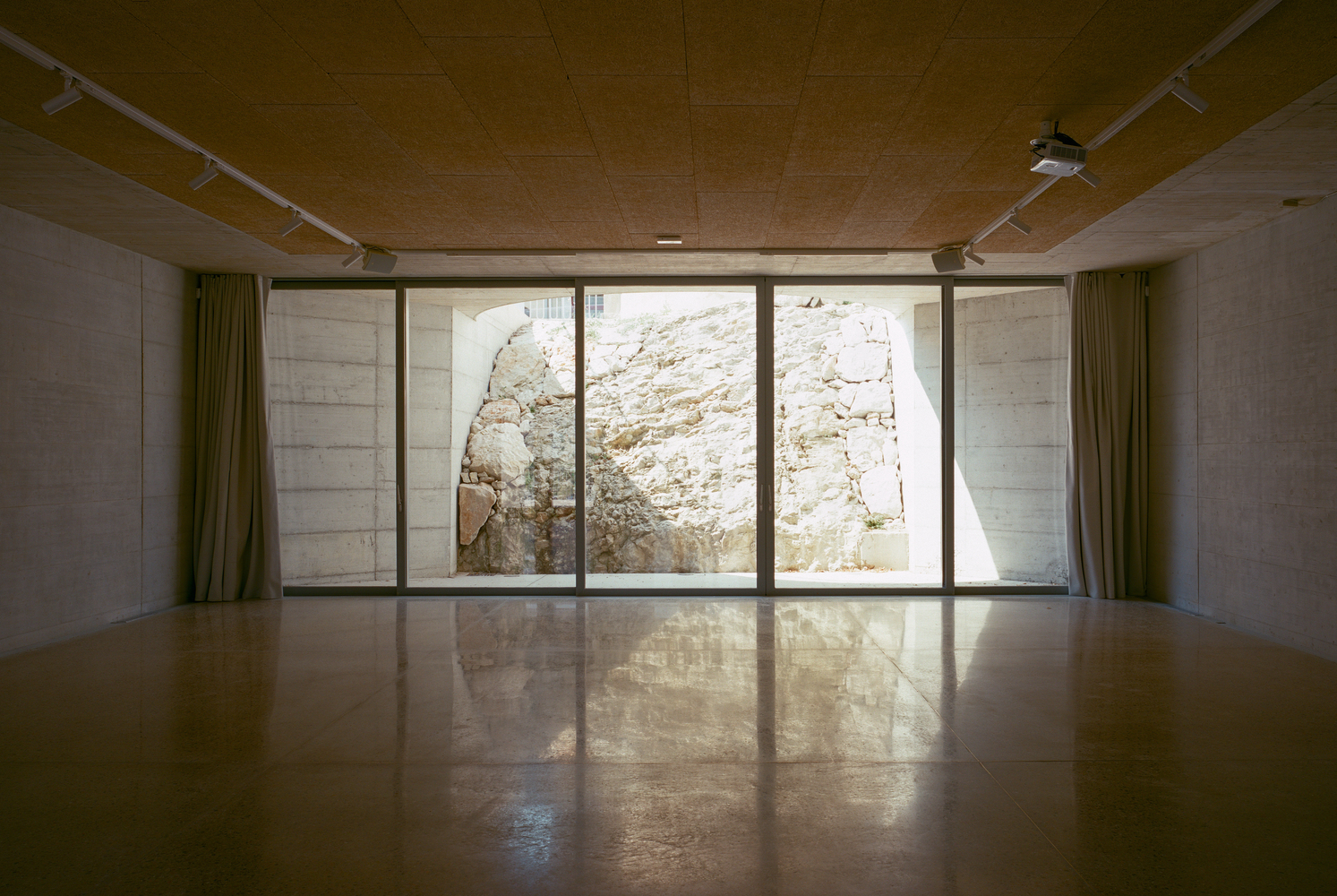 The interior of the meeting room highlights the nature of the ground by revealing the rock at the foot of the chapel through a rear patio.