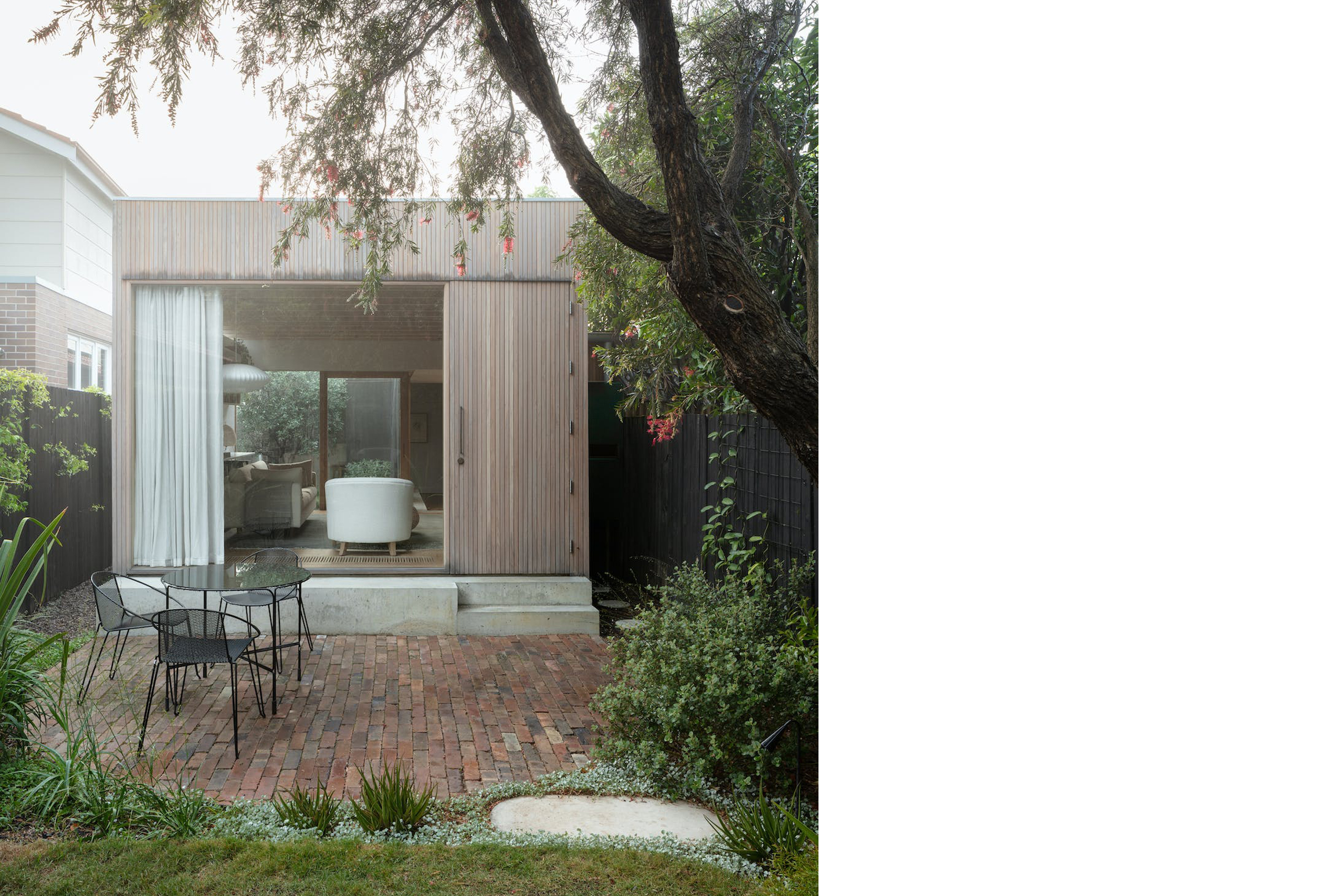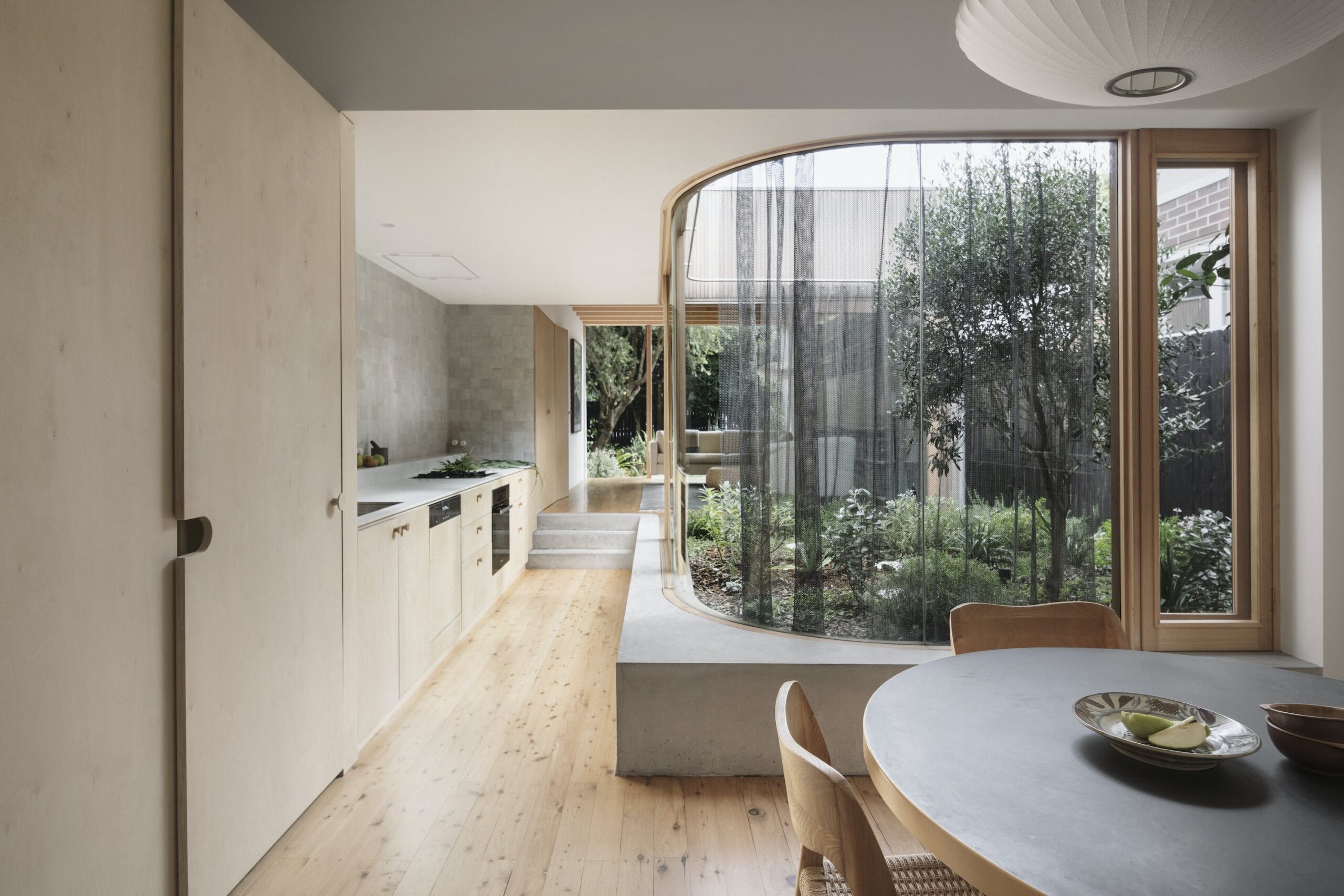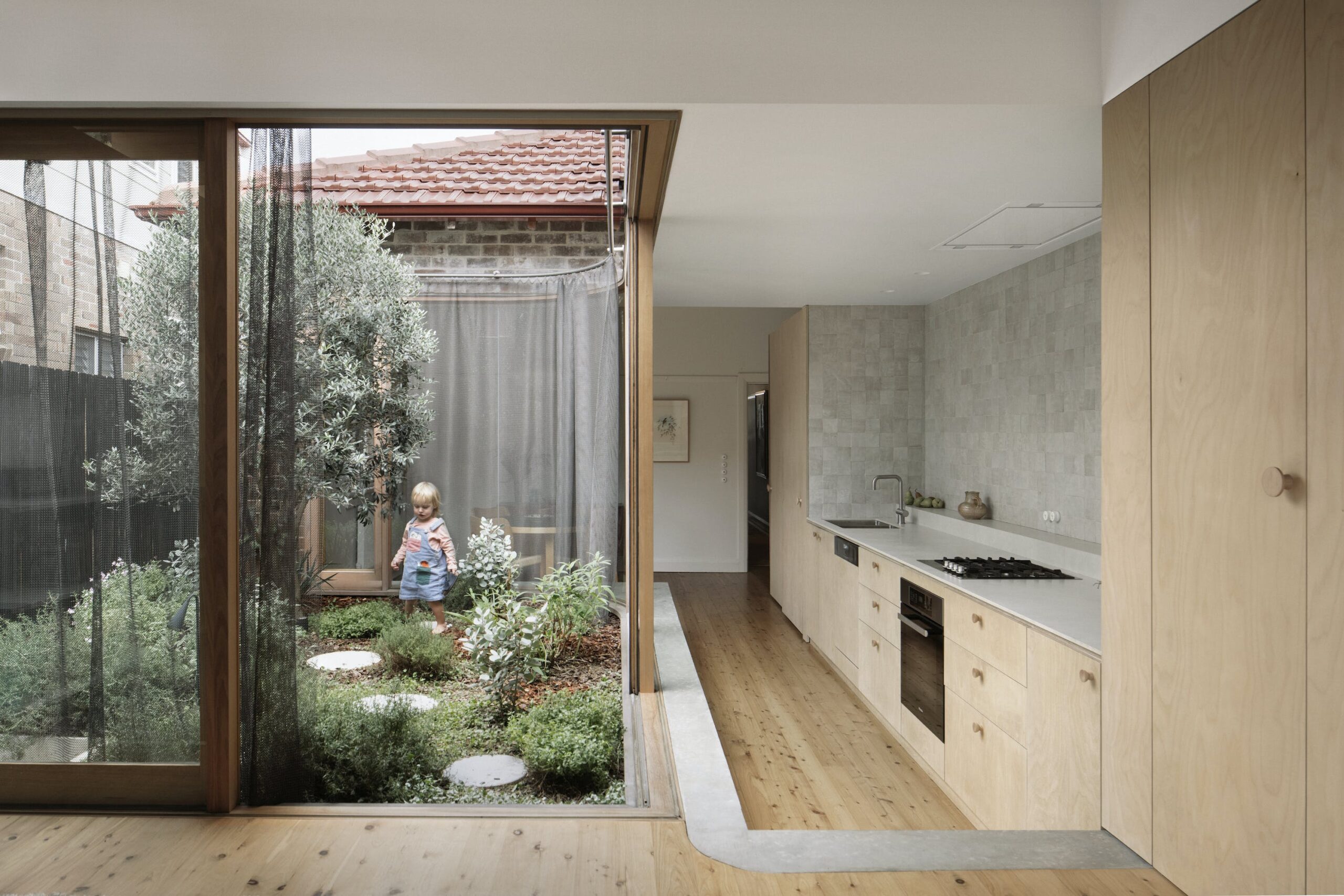 House for a Garden is a minimal home located in Lilyfield, Australia, designed by Retallack Thompson. With a brief to provide a home to create a Garden, House for a Garden removes the rear of a Federation era semi detached bungalow and provides a new courtyard around which the new living areas are oriented. The project takes the approach of providing less house, more garden. Each room is provided with a connection to a garden of varying character; Australian native bird watching garden to the front, a productive garden to the courtyard adjacent to the kitchen and shaped paving and lawn for entertaining at the rear. The actual internal floorspace was only marginally increased with the design focusing on the rearrangement of rooms rather than the provision of additional “area”. Spatially, the requirements were simple; a place to sleep, to cook, to eat, to read and listen to music.