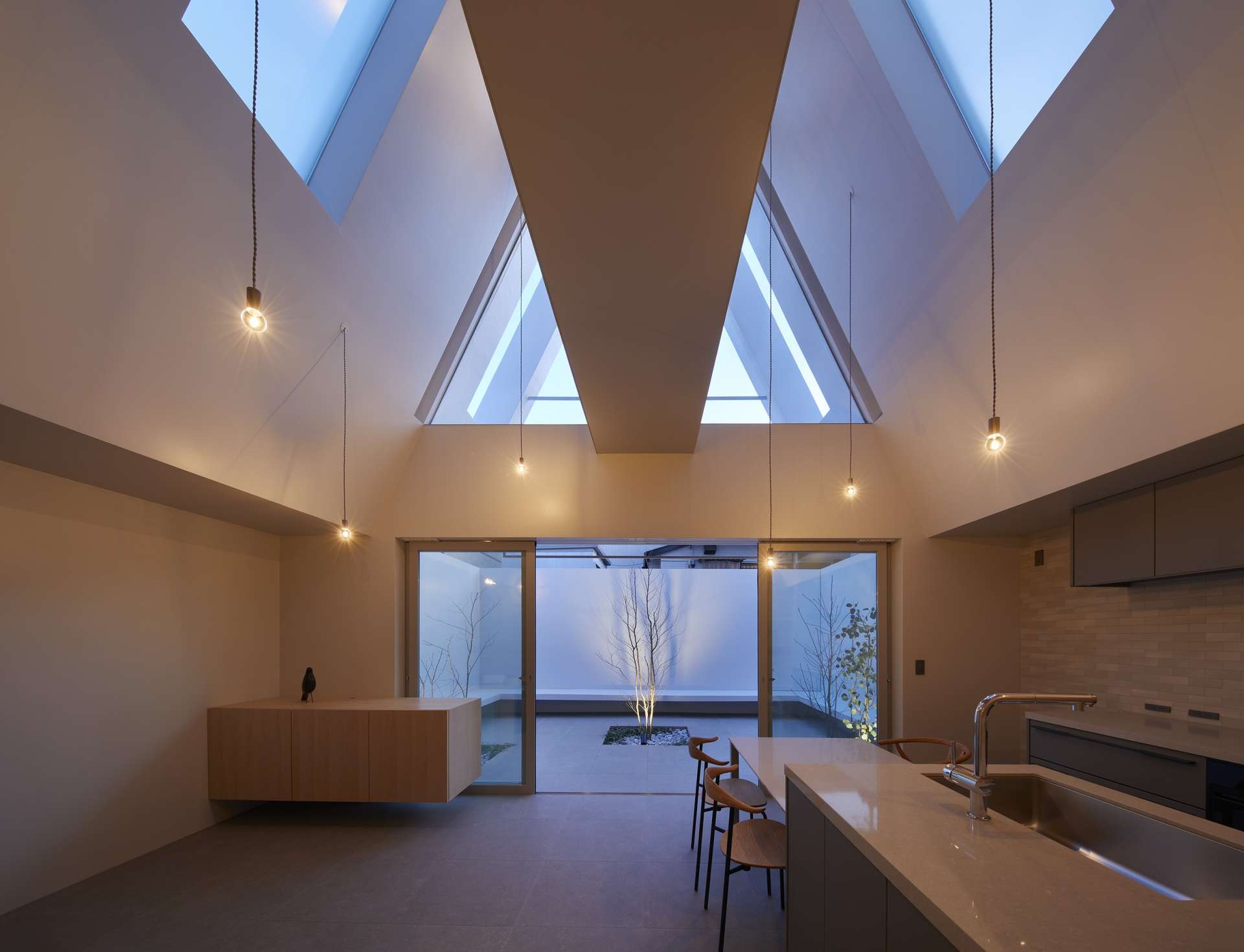 공간을 지배하는 빛. 적극적인 채광을 유도한다. 그렇게 유입된 빛은 박공지붕의 적극적인 건축언어를 통해 완성되며, 그 언어 또한 빛으로 완성된 거주공간을 위해 사용된다.