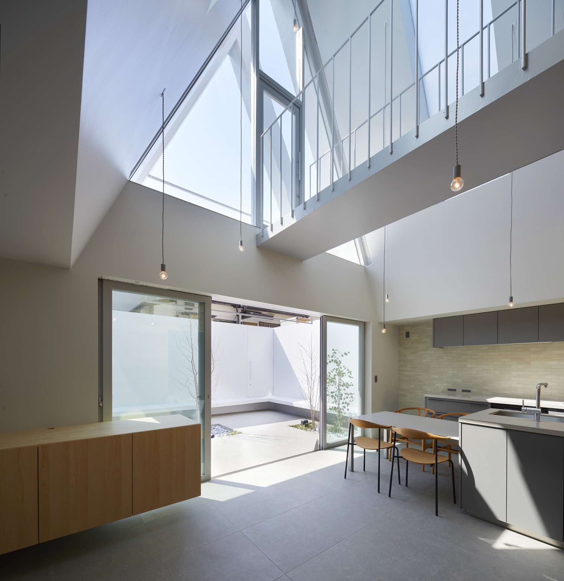 There is an LDK, an enclosed terrace, a moderately dark semi underground bedroom, etc., and the entrance lead from the road to the house is smooth with few steps. Also, rather than building a building on the original raised site, the volume of the adjacent land is generally about the height of a fence, giving the impression of less pressure. The second floor was designed so that the light from the slit-shaped top light could reach the LDK and the entrance on the first floor by placing a triangular volume on it to create a stairwell space inside. The angle of the triangle is extended to the heavens so that the light can be received firmly on the roof, and at the same time, a gap with the neighboring house is firmly provided so that the window of the neighboring house does not interfere with the lighting, and the clearance with the neighboring house as a cityscape.
