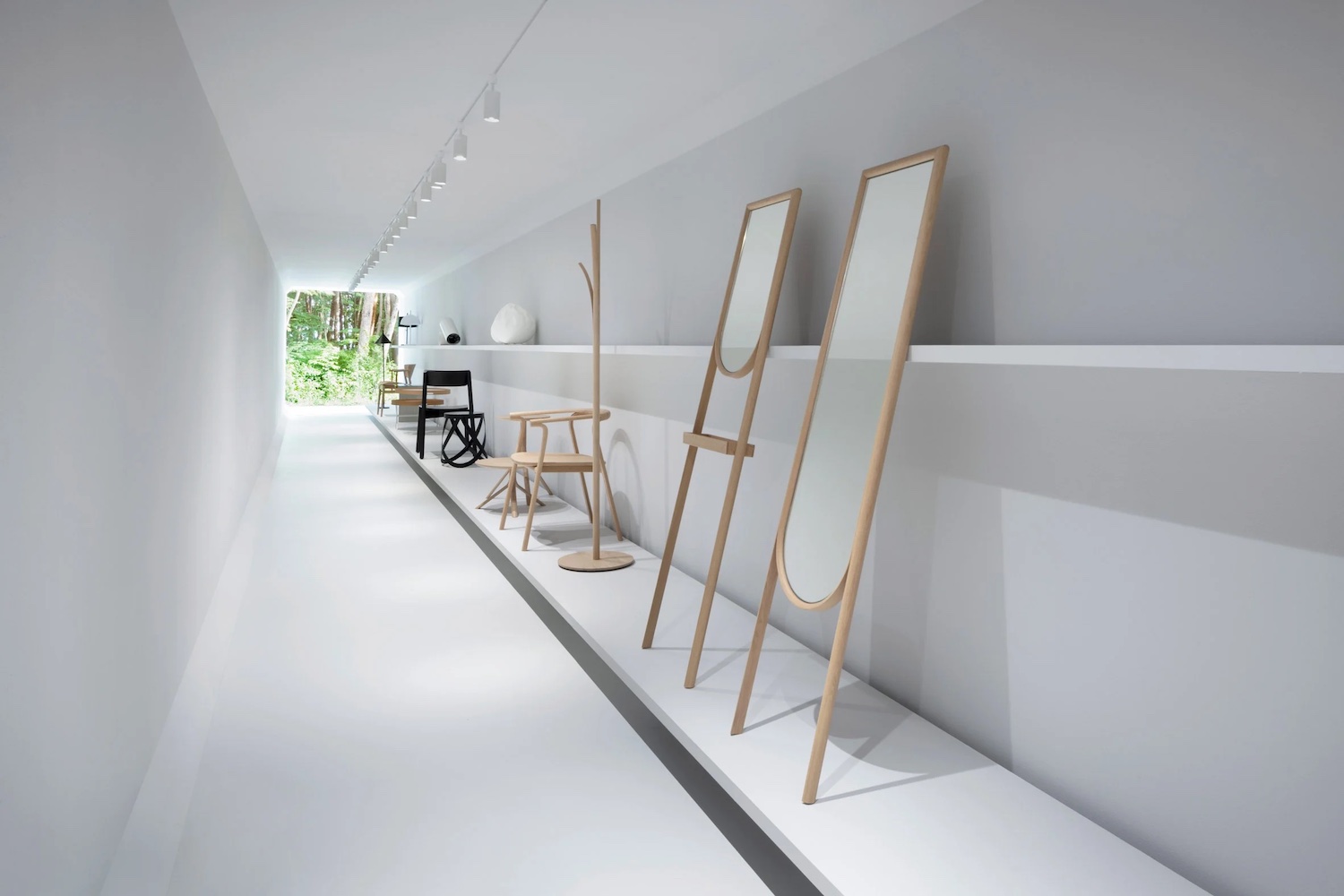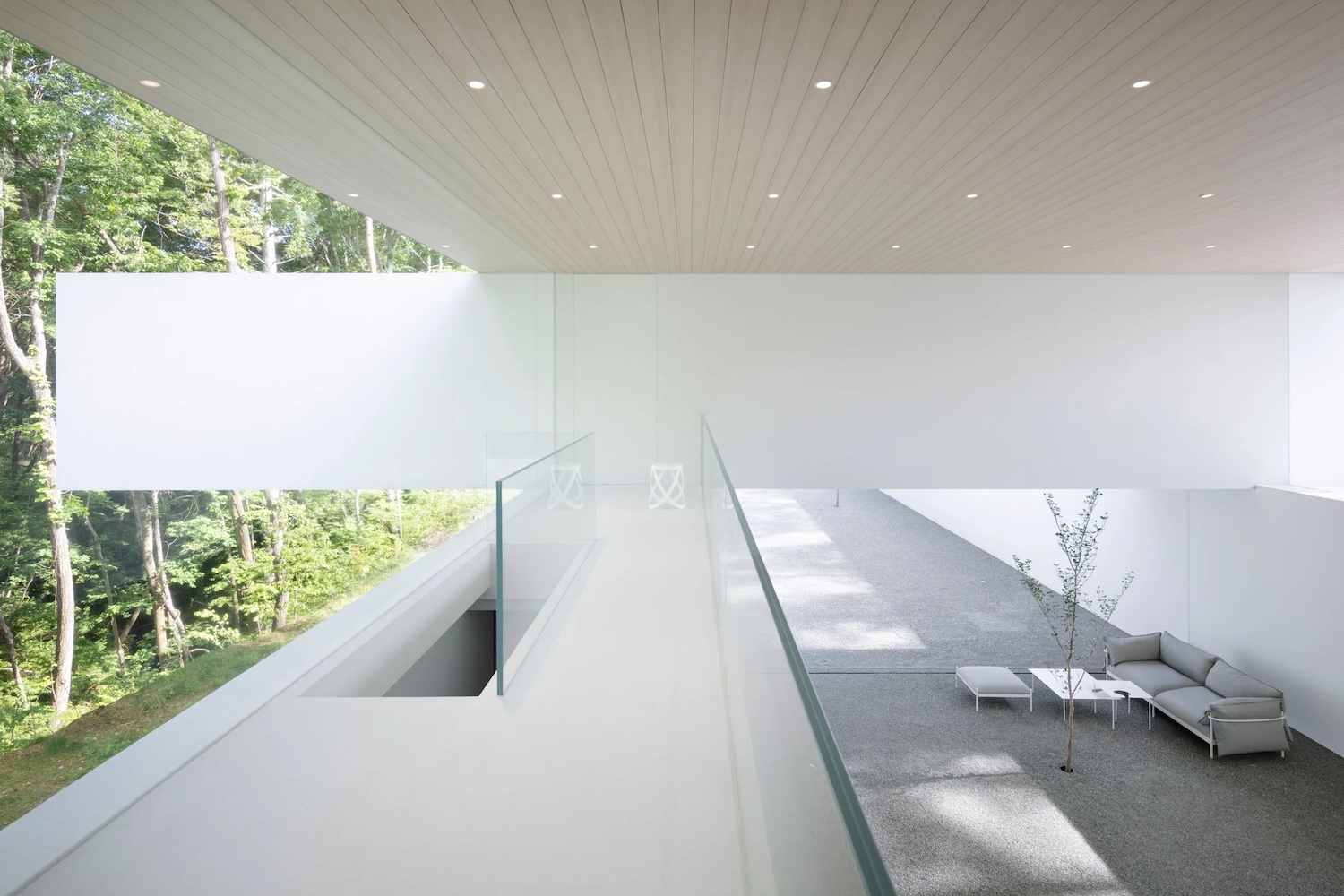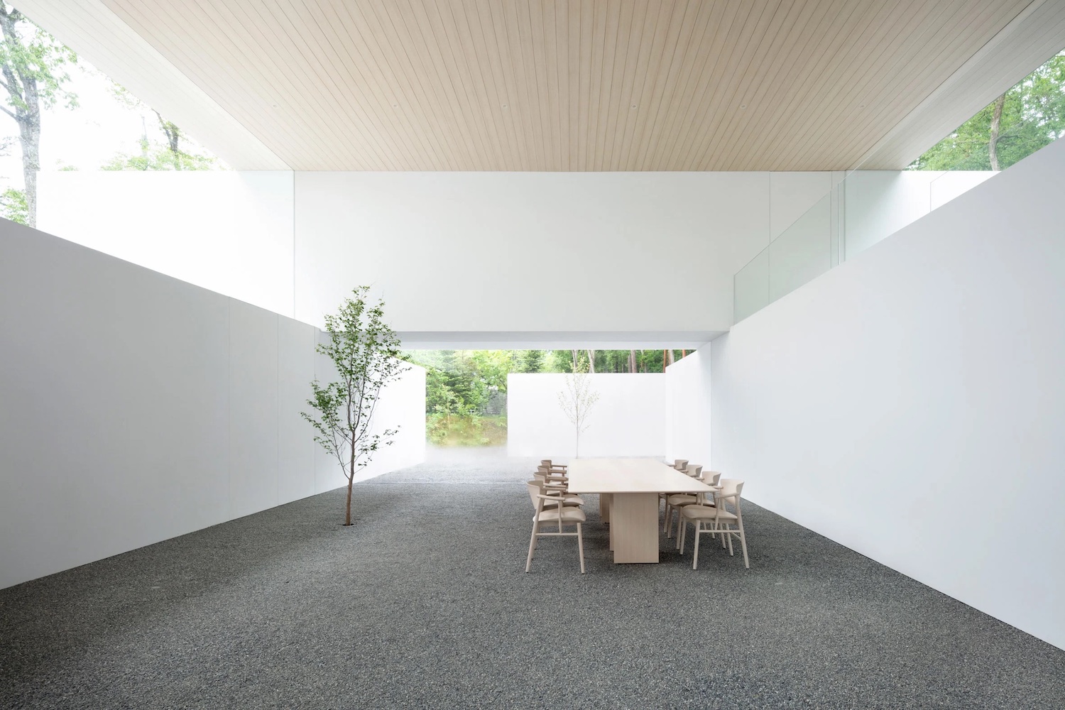 The work involved gradually tightening the wires over time until a tension of 46 tons was finally applied to each. The building is composed of four stacked “tunnels” covered with a roof in the center. In addition to a long, narrow storage room with a depth of approximately 40 meters, there are two smaller storage rooms, but it is envisioned that more will be added to the site in the future as the collection grows. The kitchen, bathroom, toilet, and other water facilities are concentrated on the first floor, and a compact bedroom and a study are located on the second floor. The windows were made without metal frames as much as possible, and high transparency glass measuring up to 10 meters in length was fixed into the grooves in the same manner as shoji screens. The gravel and plantings used in the exterior were also arranged in the interior to draw the outside environment into the interior.