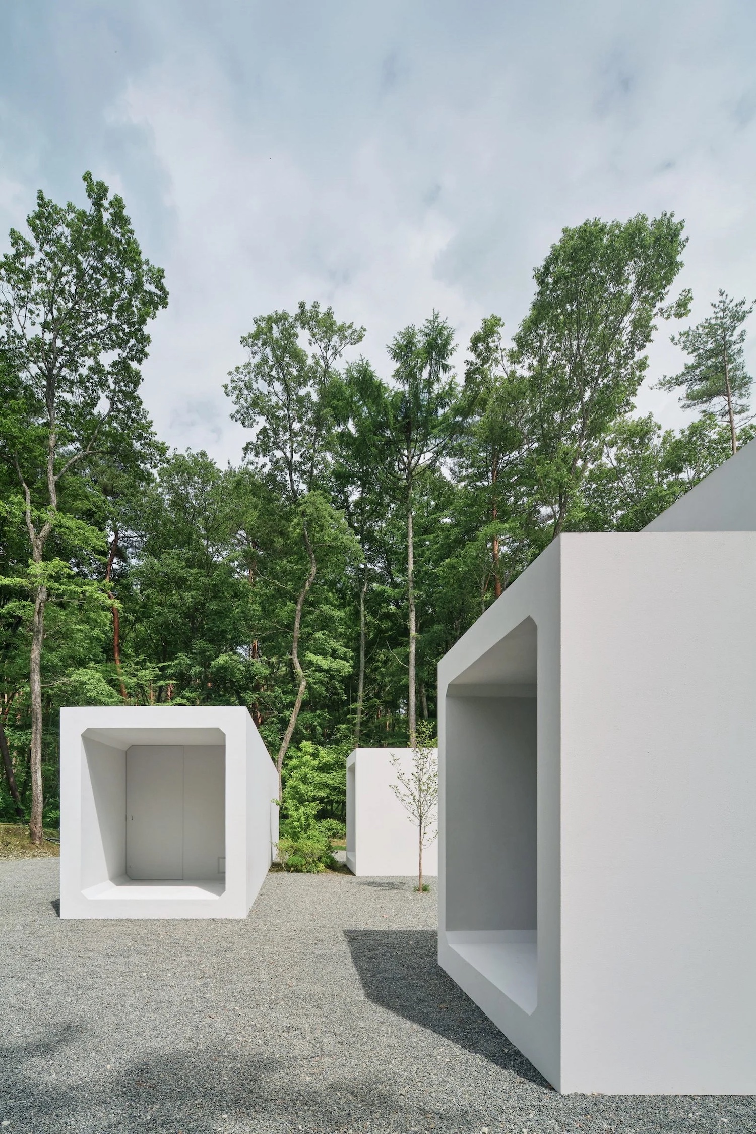 Culvert Guesthouse is a minimal guesthouse located in Nagano, Japan, designed by nendo. Located in a quiet and nature-rich environment where streams weave through a thick forest of red pine, the tunnel like architecture took shape through a combination of precast and prestressed construction methods. For precast construction, common parts are molded in a factory and assembled on site. An example of its applications in infrastructure projects is the box culvert (box-shaped concrete structures), used to store waterways, pathways, power lines, and communication lines buried underground. However, since the method itself does not provide a leak-free composition nor does it allow for stacking, both necessary for this architecture, prestressing was also used to connect the parts together.