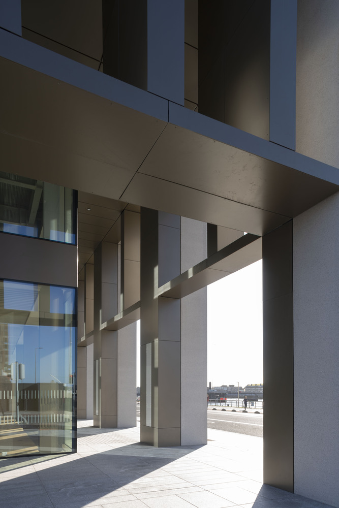 In recognition of the oft harsh environment of the quays, a generous double-height arcade on the ground floor provides generous, sheltered space for pedestrians to circulate. The ‘giant order’ of the colonnade provides an appropriate scale to the river and gives visual interest to passers by. The colonnade is terminated by an art gallery with a glazed corner window and bronze entrance screen while an opening at the first-floor level allows light from the east to enter the colonnade at a high level.