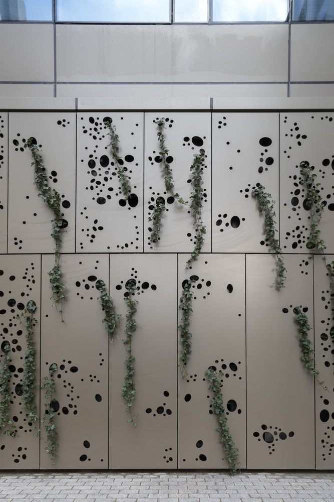 The façade is modulated through changes in the spacing of mullions and horizontal banding. A dense rhythm of mullions at 1.5-meter centers expresses the floor above the colonnade. This rhythm is changed to a 3 meter bay width on upper floors.