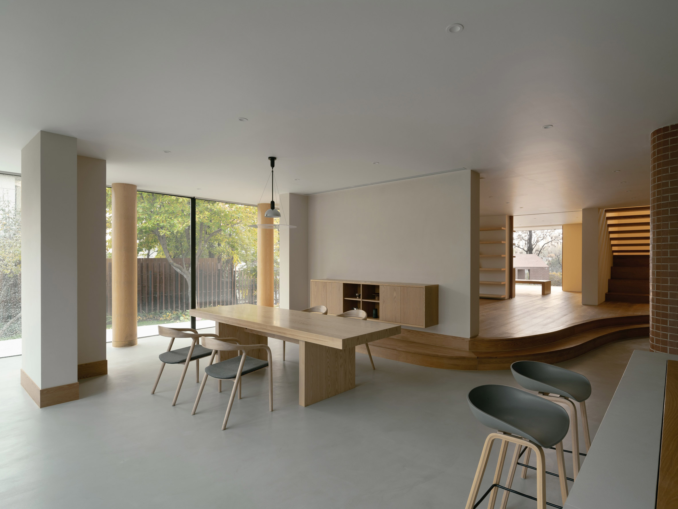 "At the same time, the landscaped elements of the curved staircase in the garden are continued in the interior space," it added.