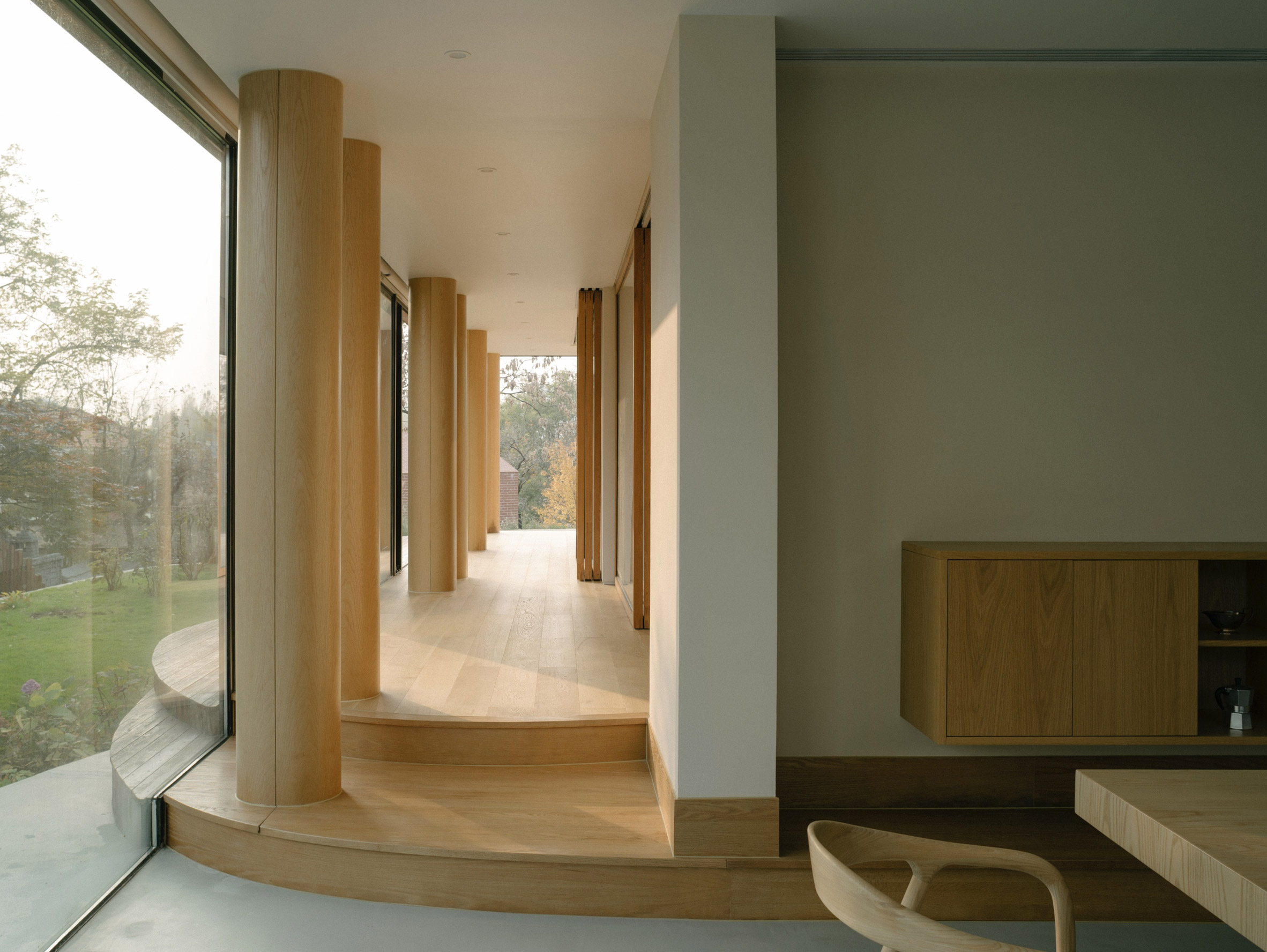 The garden covers an eight metre height difference and is traversed by a series of large, curved steps that continue into the home, intended to blur the boundary between inside and out.