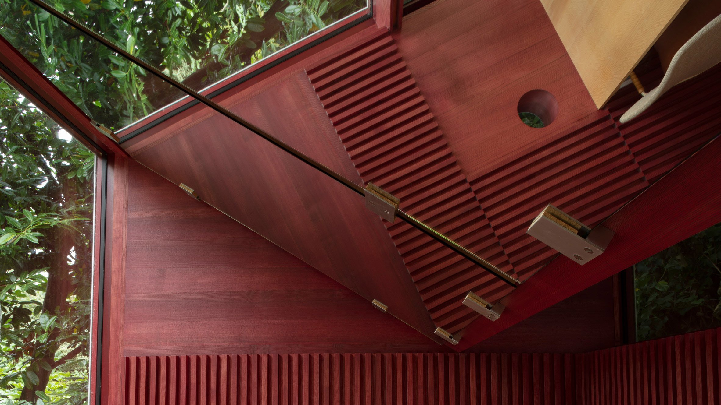 레드컬러로 인테리어된 작은 오두막은 앵귤러 작가를 위한 아주 작고 소중한 공간이다. 아일랜드 스튜디오, Clancy Moore Architects는 재활용 알루미늄과 레드컬러의 너도 밤나무를 이용, 더블린 주택 마당의 한켜에 작가를 위한 작은 서재를 제안한다. 기하학적인 외형은 v자 형태로, 내부 천장 거울로 구현된다.