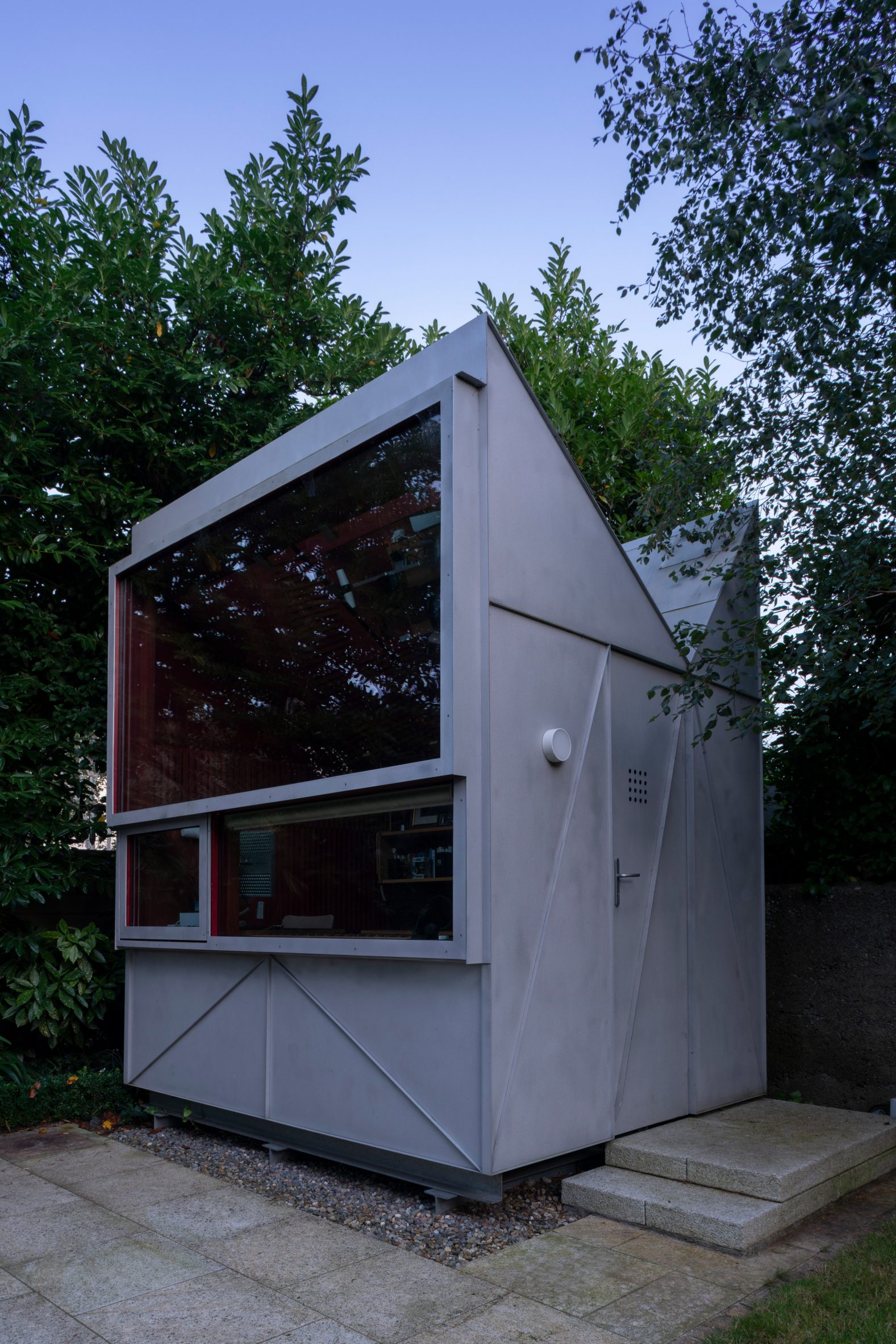 These design restrictions led to a geometric form clad in folded recycled sheet aluminium.