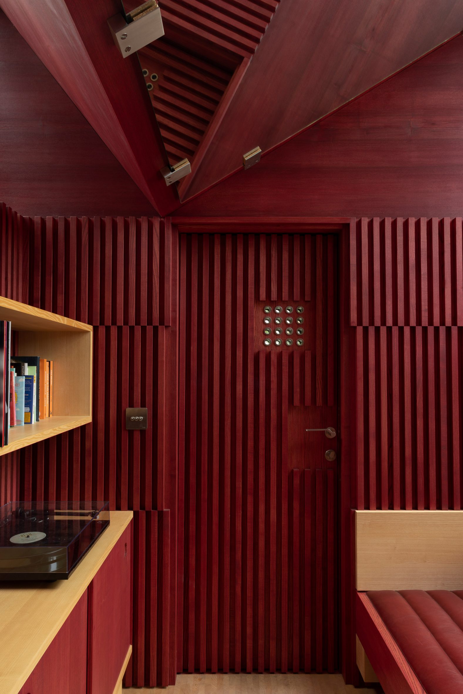 "[The timber] is applied in a rhythm of vertical strips to give a texture to the walls of the space," said Clancy. "This is in turn divided into horizontal bands, by stepping the strips each time."