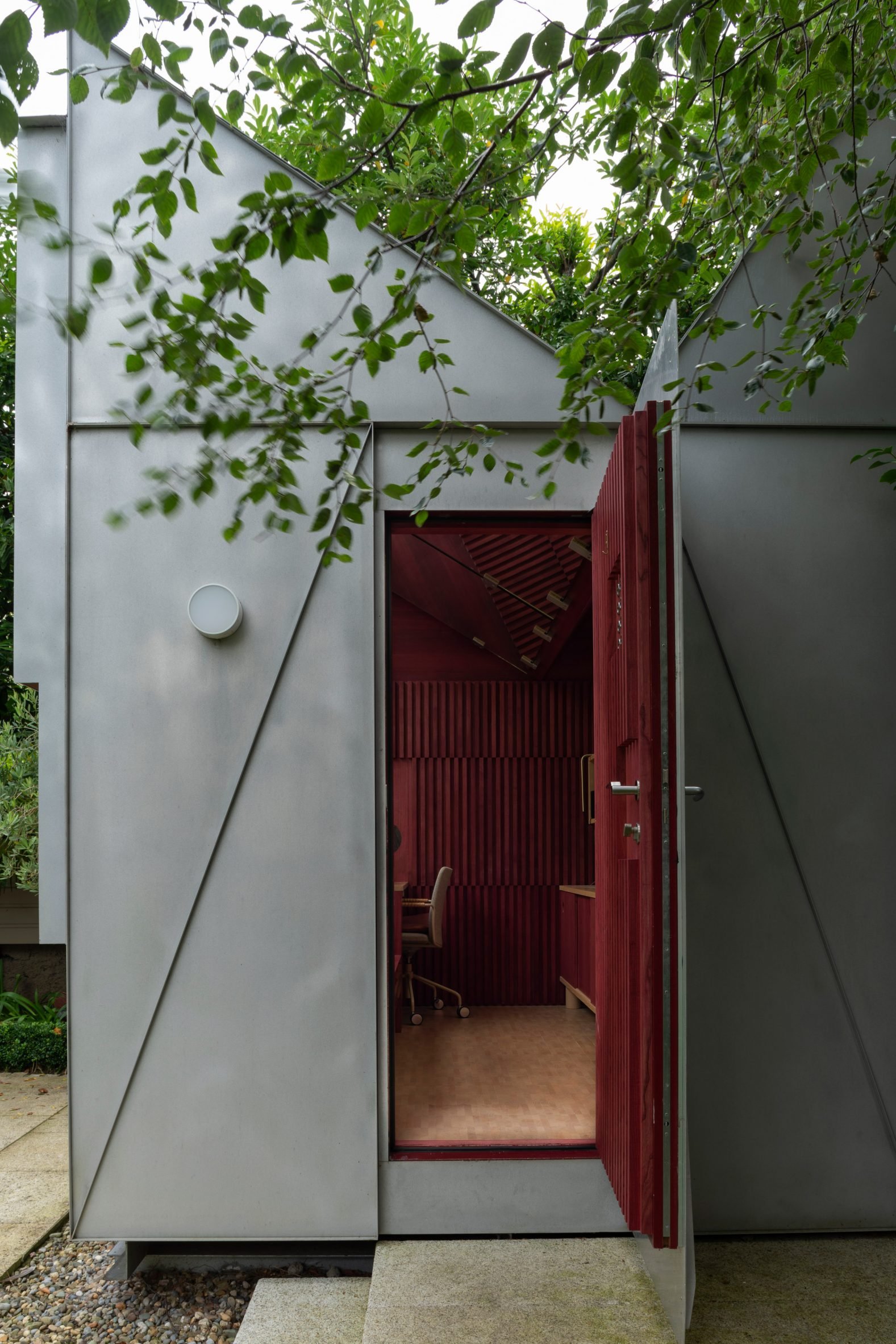 The structure, which was built off site and craned into the home's garden, has a geometric aluminium exterior, red timber walls and a V-shaped mirrored ceiling.