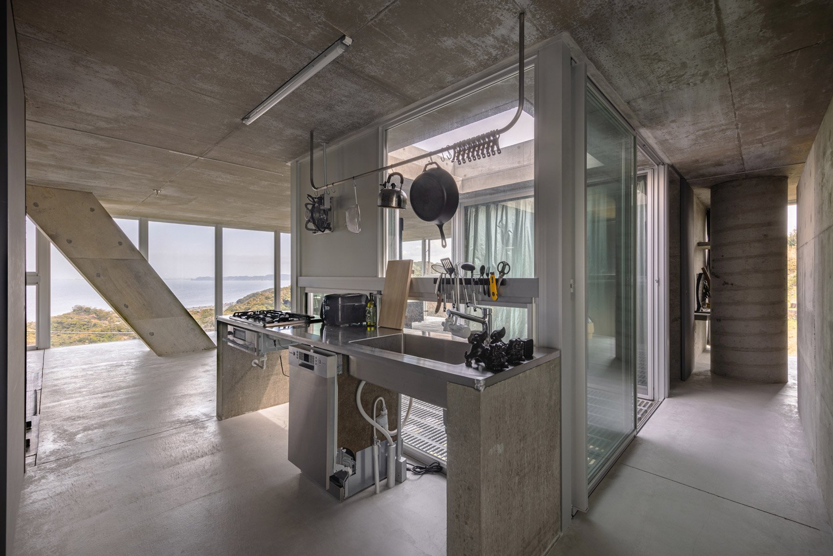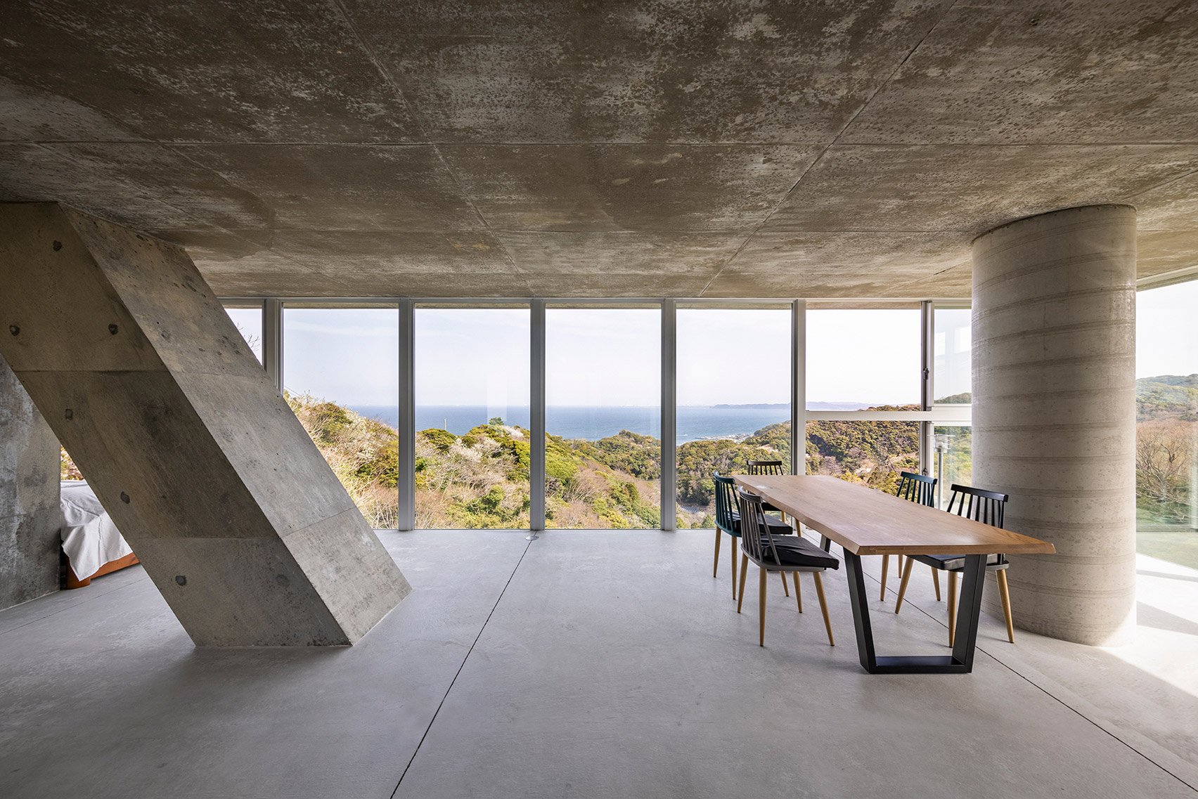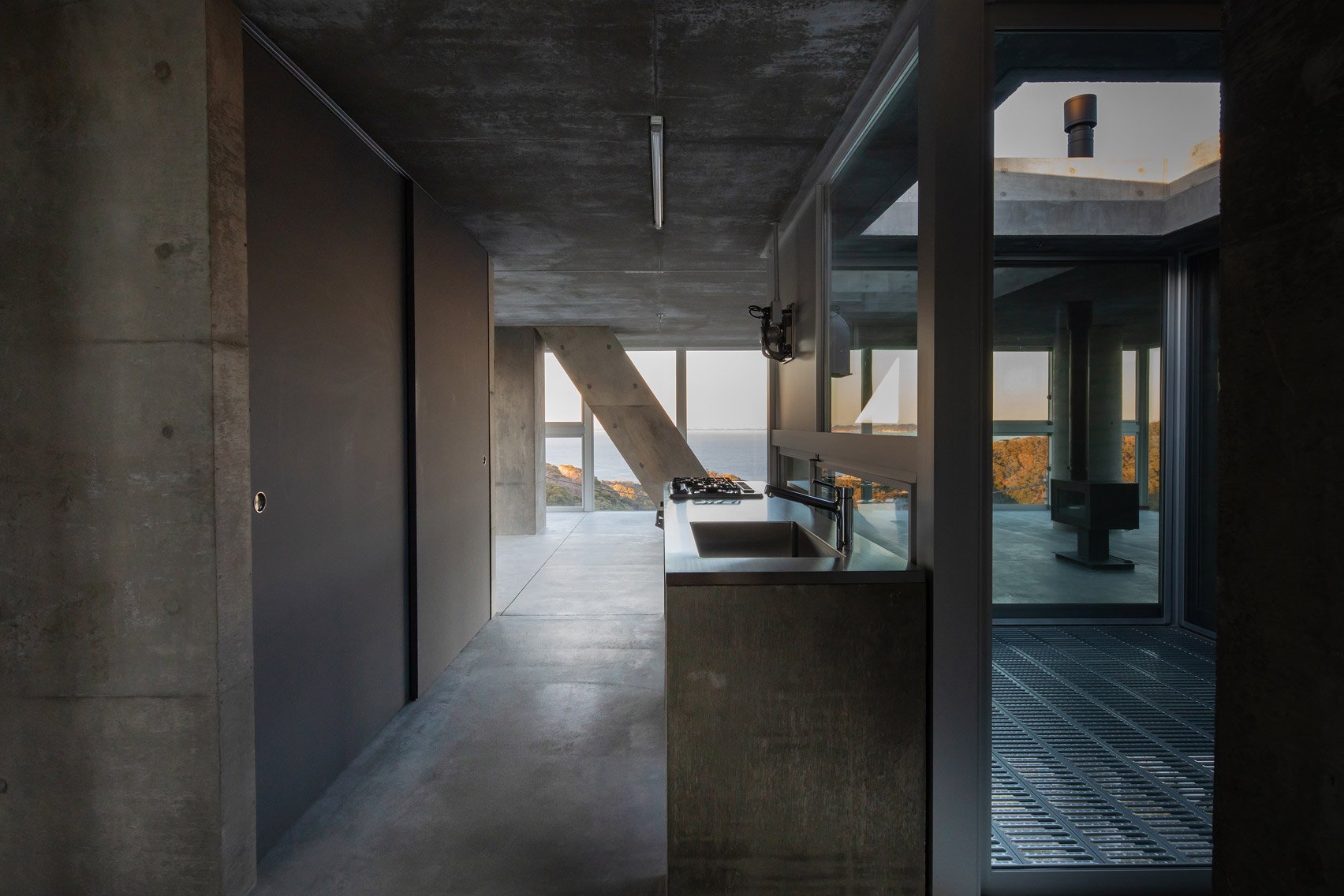 The southern half of Torus House has been given over to an open-plan living space with fully glazed walls, offering the owner expansive views over the surrounding mountains and sea.