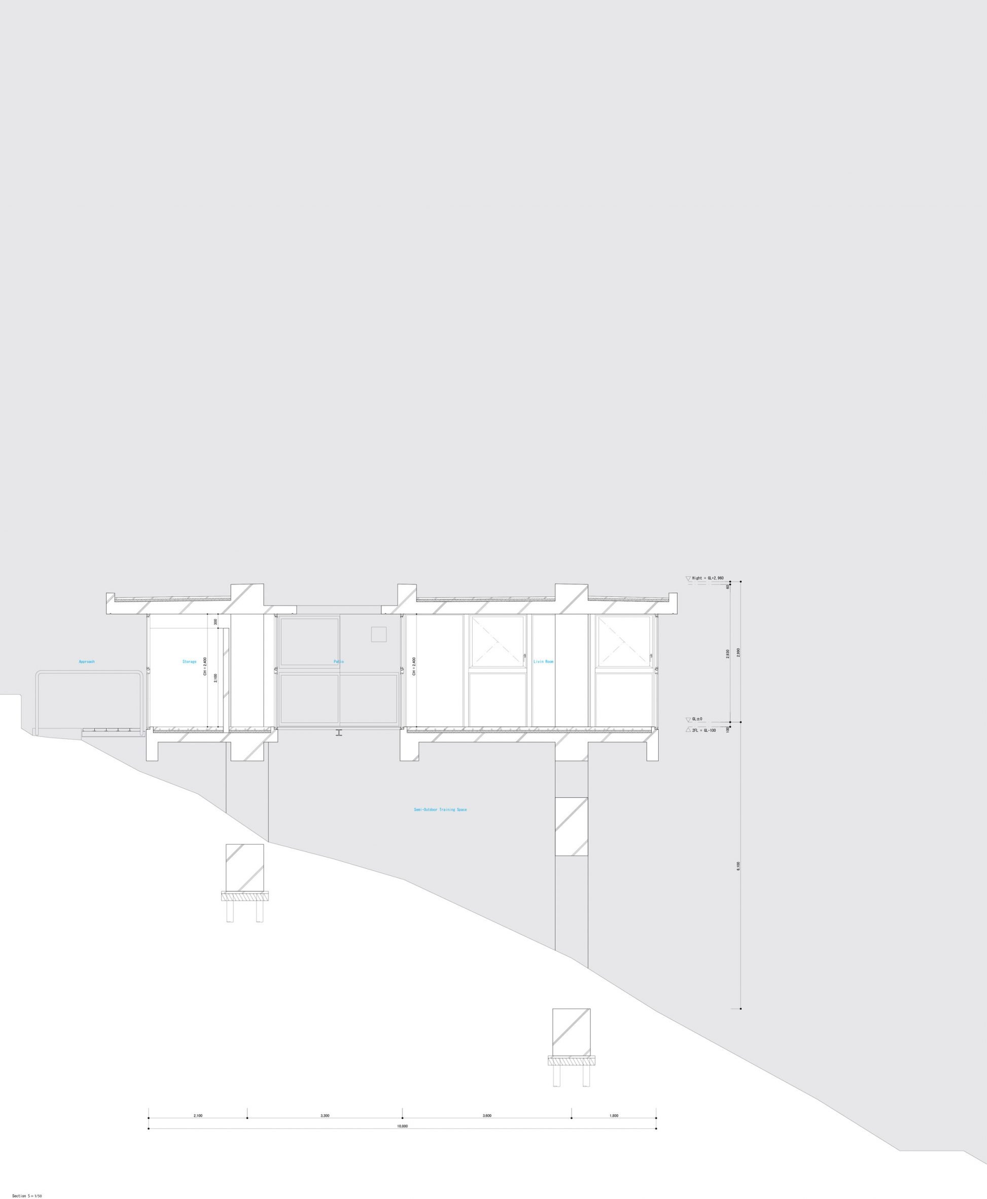 경사지에 위치한 토러스 하우스는 최소한의 건축을 지향한다. 건물을 지면으로 부터 띄워 최소한으로 자연환경을 건드린다. 그리고 수평성이 강조된 콘크리트 슬래브로 건축물의 이미지를 강화한다. 이렇게 두개의 육중한 콘크리트 사이에 외벽은 막힘없는 연속적인 뷰포인트를 만들며 경사지에 위치한 조망과 오픈플랜을 완성한다.