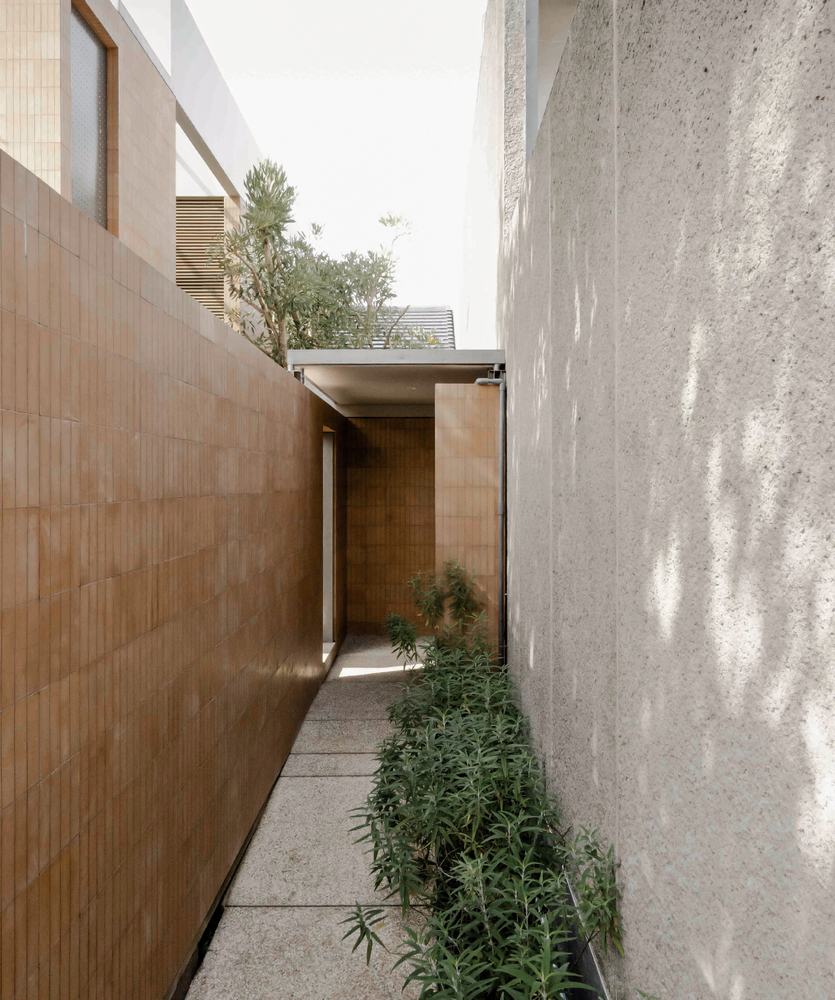 The introverted personality of this house is seen from the front. The facade that looks like two stacked boxes looks massive without openings. The main door is completely covered by a perforated metal fence. There are no windows facing the street, either on the 1st or 2nd floor.