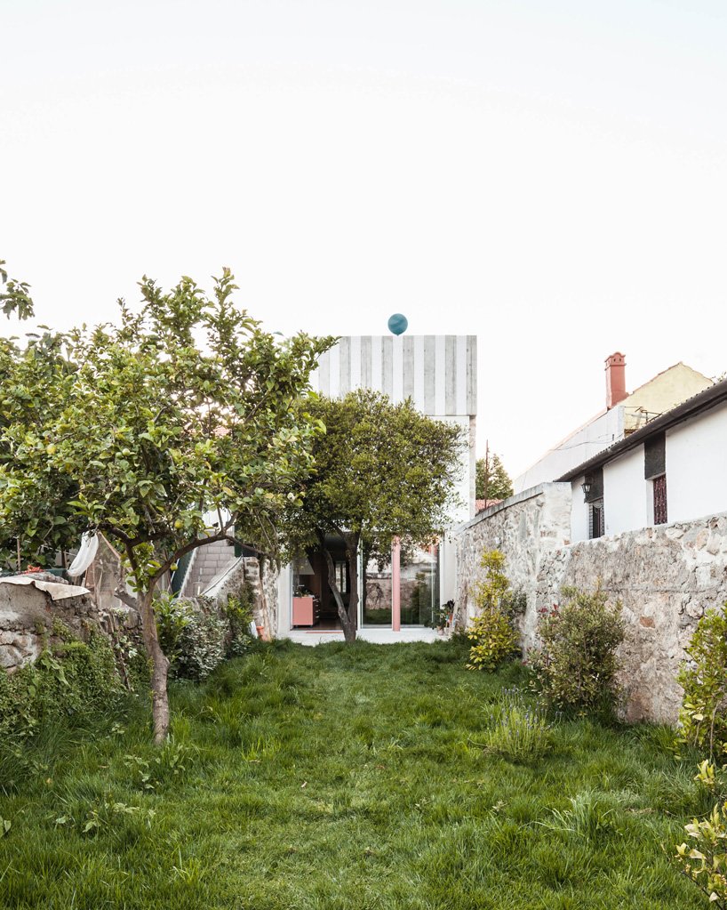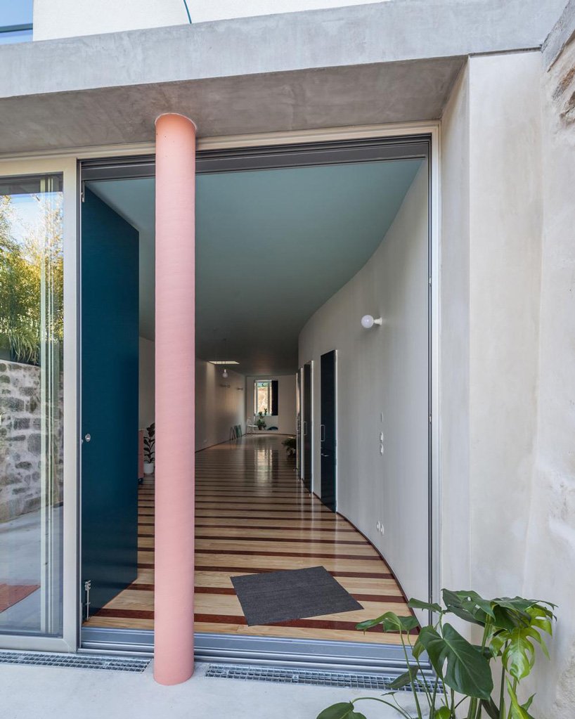 fala atelier‘s latest project packs some of the studio’s trademark spatial elements, such as stripes, curved surfaces, and pops of color, into ‘house in fontaínhas’, a private residence in porto. the project’s ground floor is conceived as a single, uninterrupted, volatile space defined by a free curved wall and only one corner. its two continuous white surfaces open up to a vivid garden, where the home’s back façade takes center stage. the façade comprises the completely open ground level, a single window on the first floor which frames the neighborhood’s dense context, and the striped concrete cornice on the top part of the building. a blue circle, aligned with a non-structural pink column, completes the exterior composition.