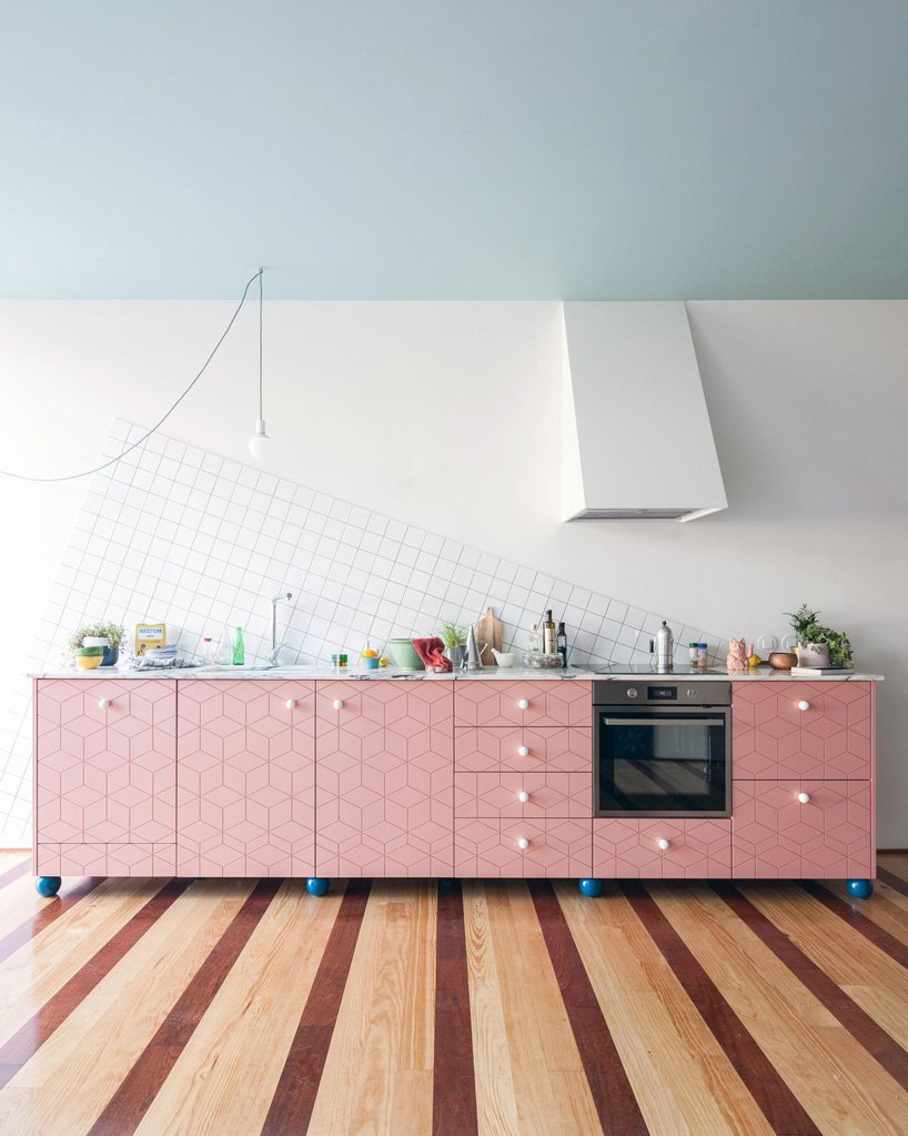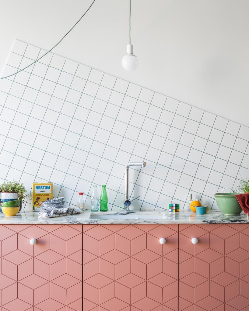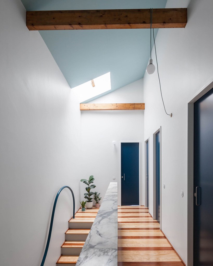 the project’s materiality holds the house together despite the opposing spatial orders of its different levels. continuous white walls are complemented by striped wooden floors, and light blue ceilings. flat blue doors, touches of marble, subtle patterns, and pops of pink complete the composition.